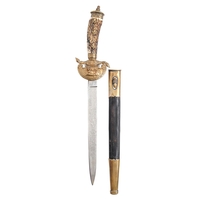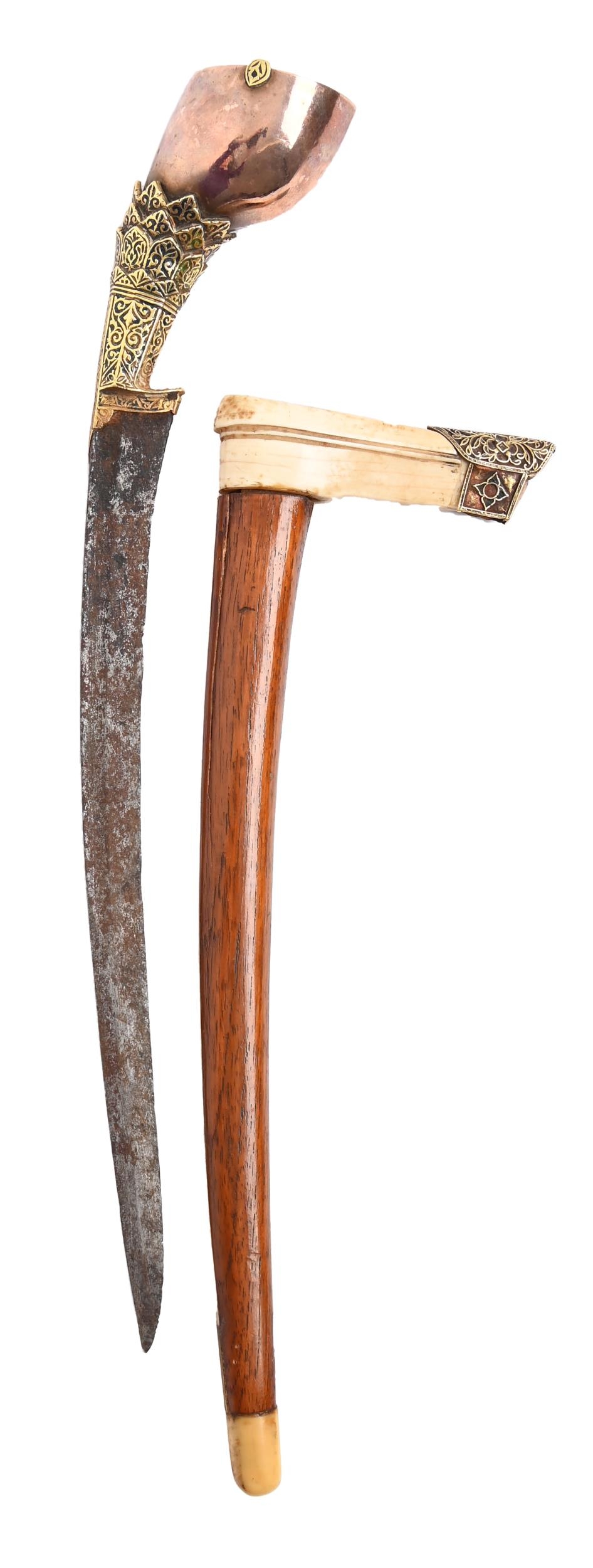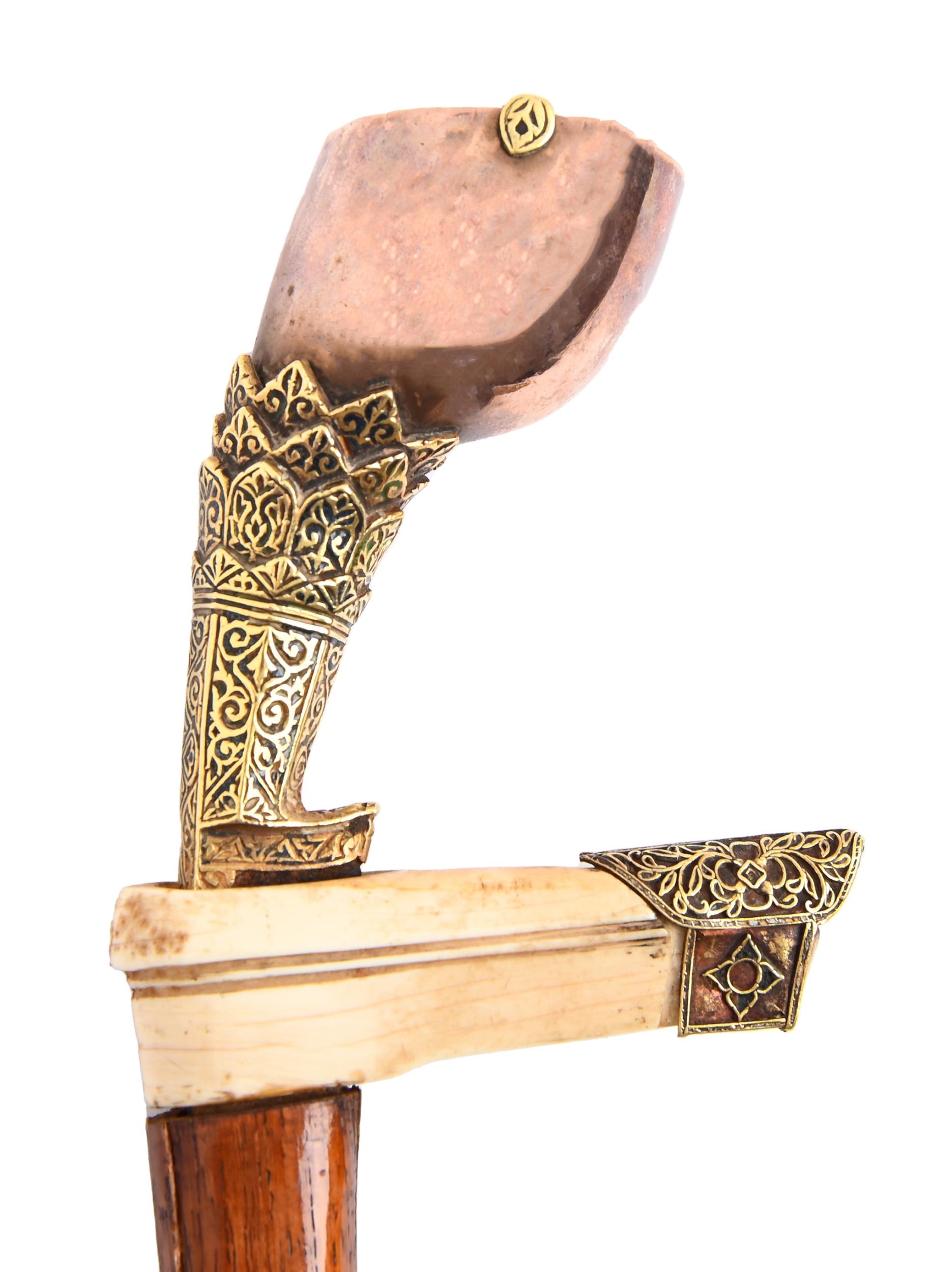 A Malayan jewelled gold and bone mounted dagger and sheath, Kris, 19th c, blade 24cm l