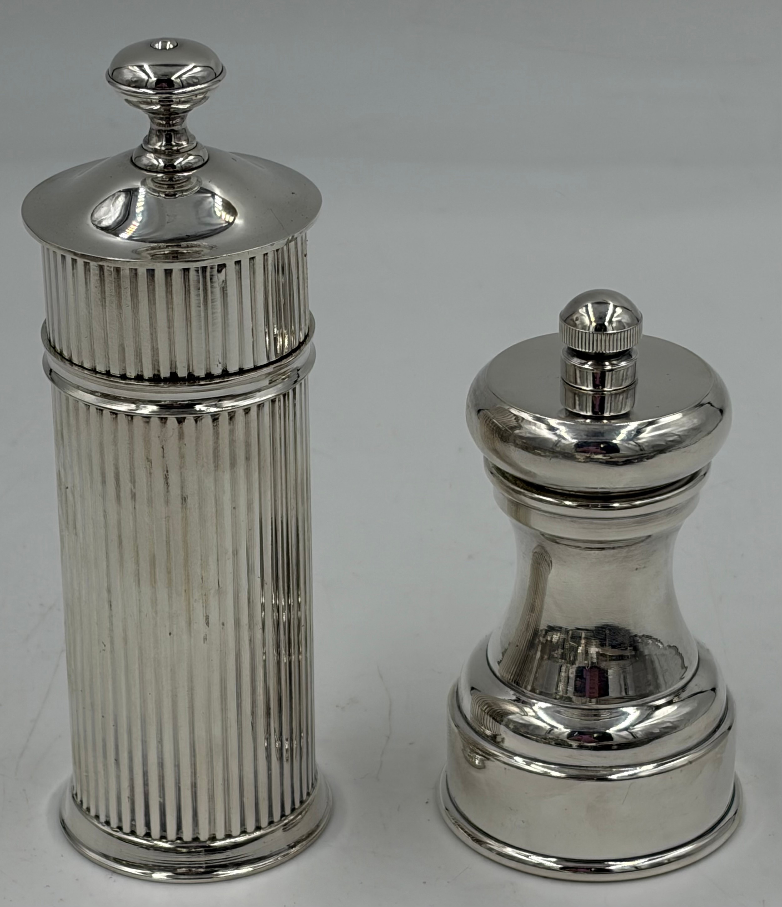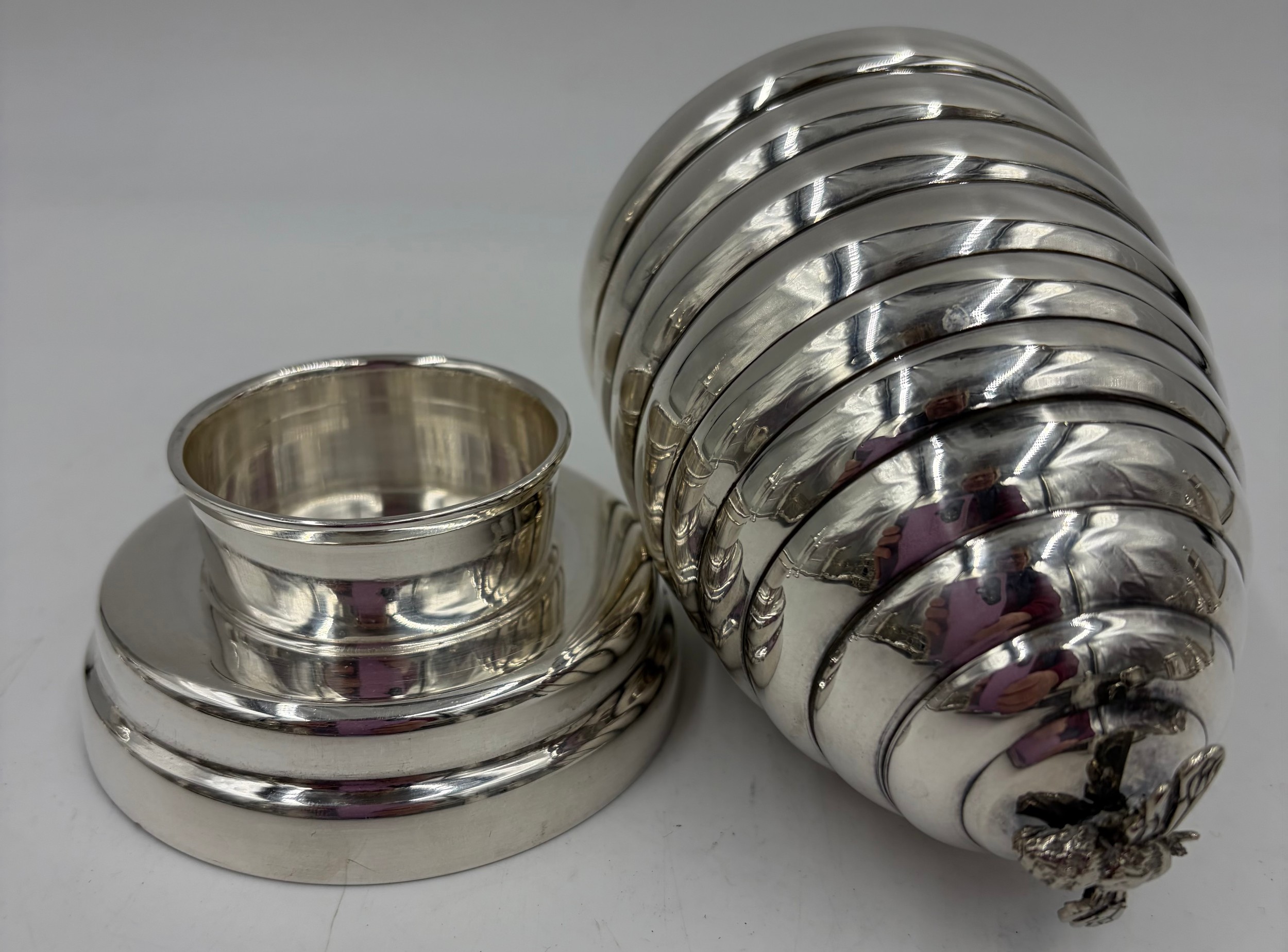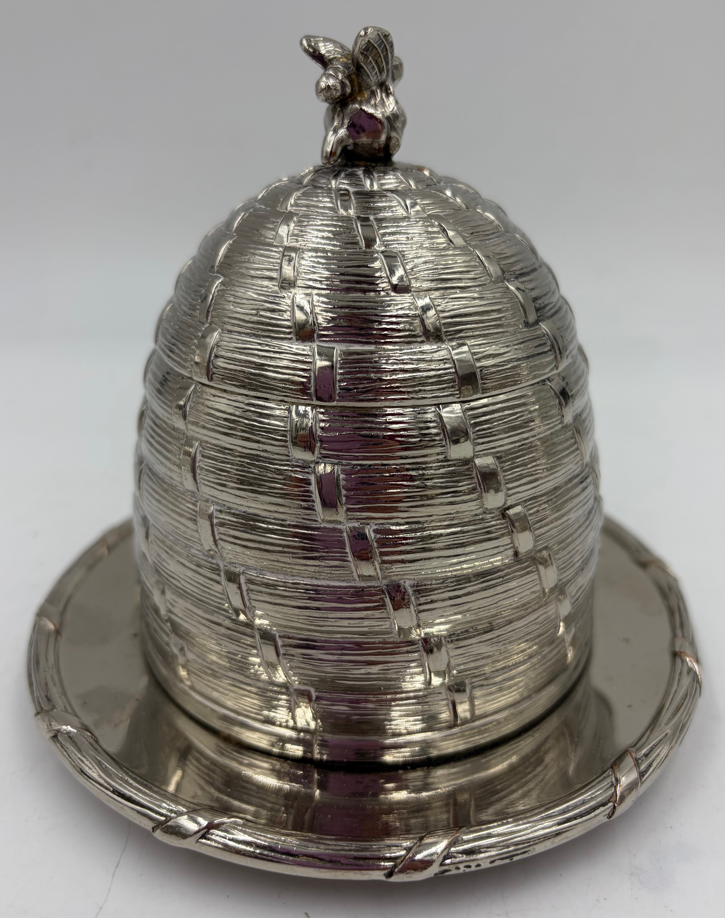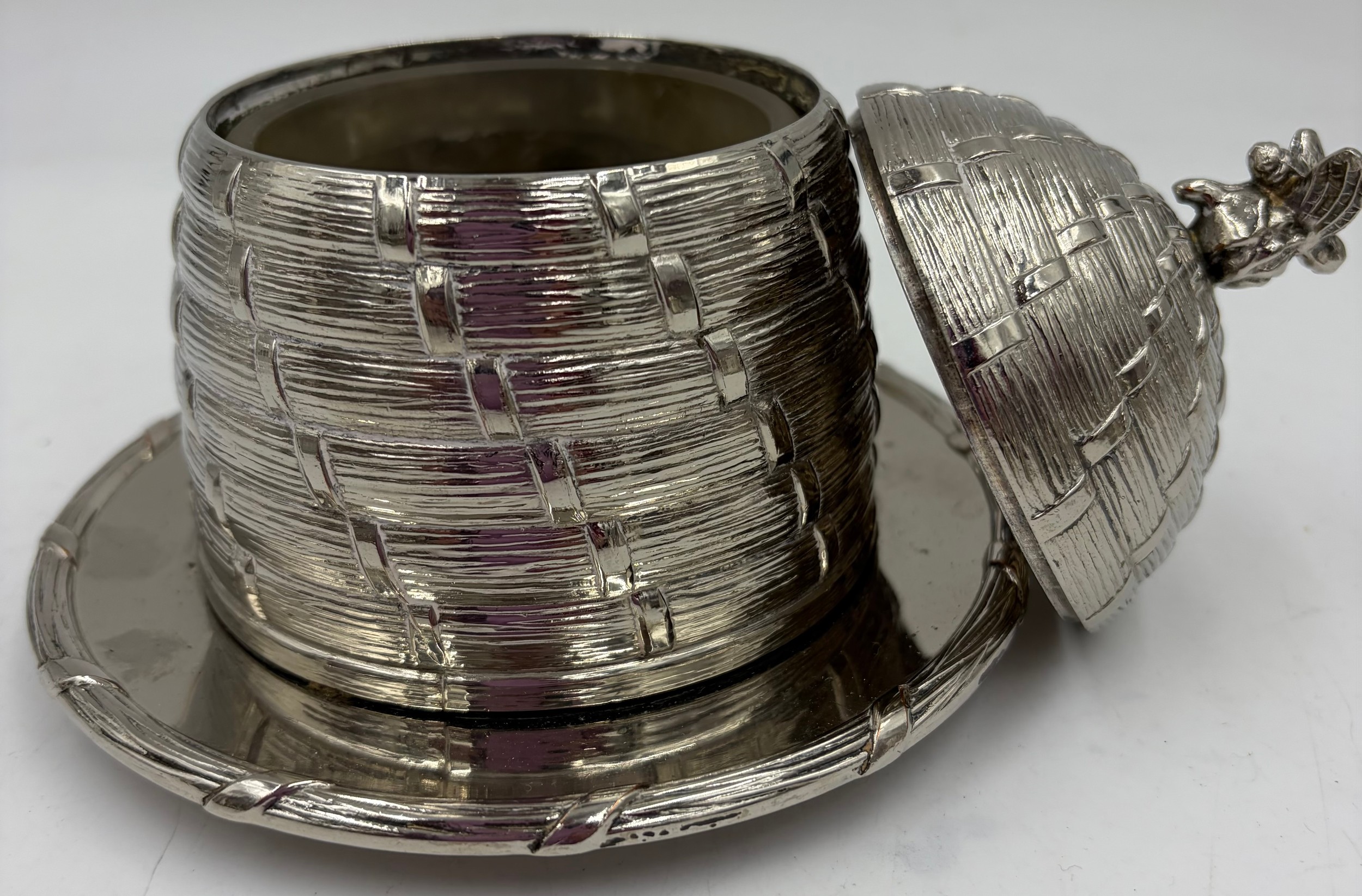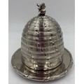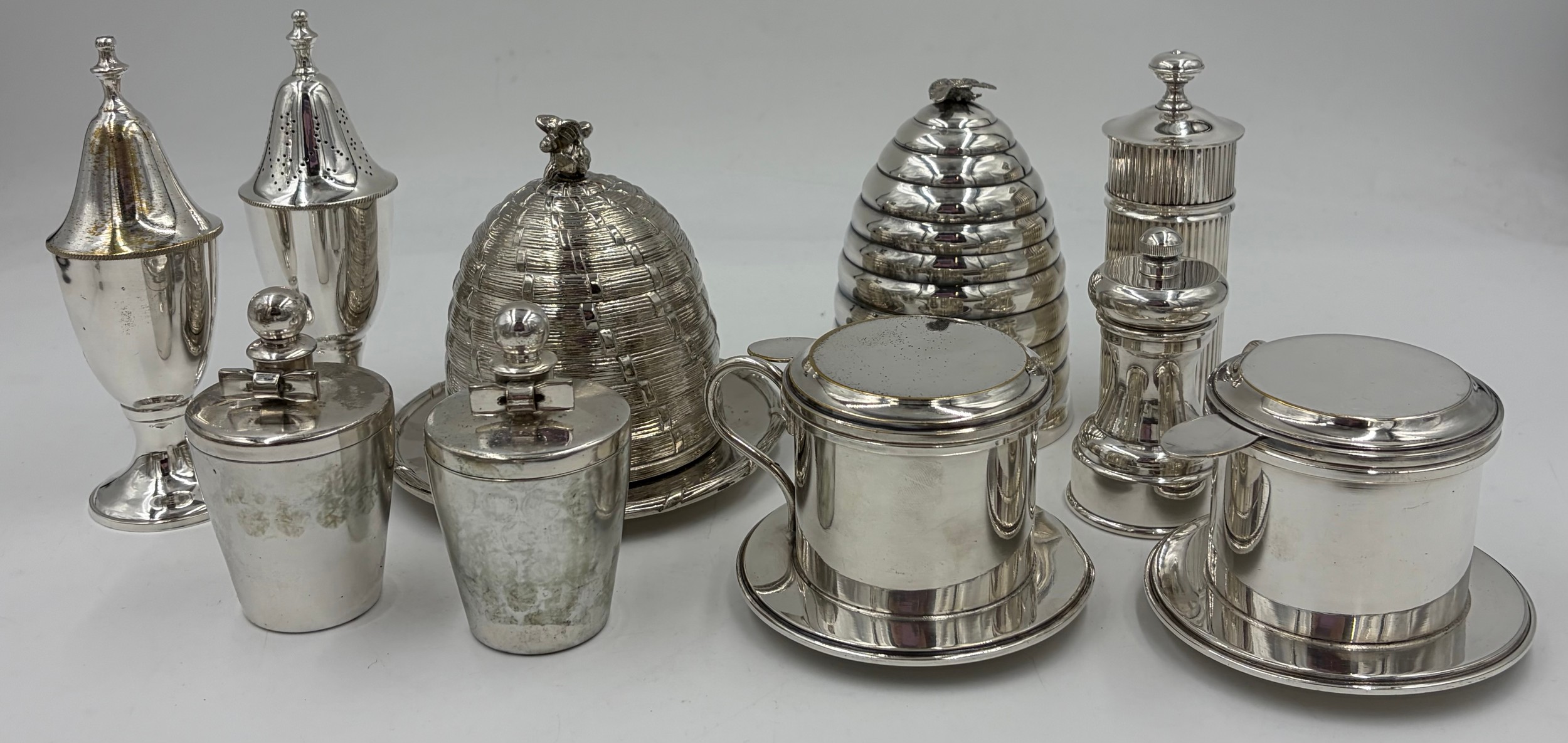 A collection of quality silverplate to include a Honey Pot with glass liner and bee finial marked C & Co 12cm, bee hive candle holder by Kenneth Turner 12cm, Christofle pepper mill, 2 x coffee filters, Park Green & Co pepper mill, 2 x candle holders with bow fronts and a salt and pepper condiment set.