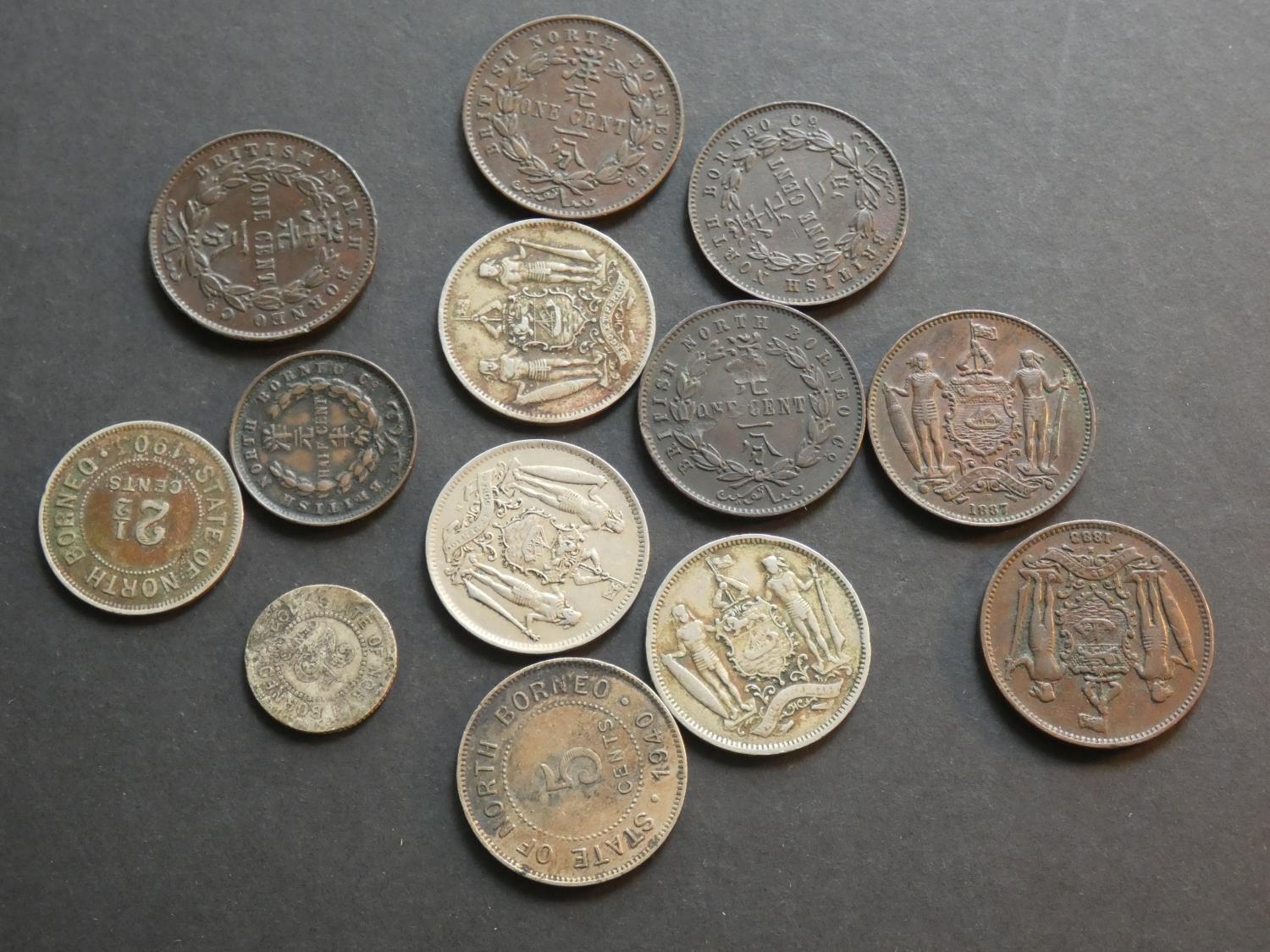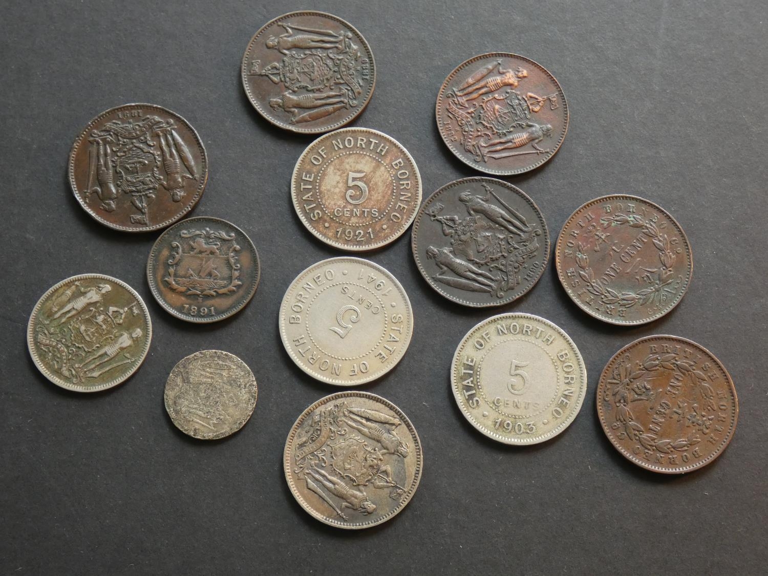 BRITISH NORTH BORNEO. ½ Cent (1891H), 1c (1882H, 1887H, 1888H, 1889H, 1890H, 1891H), 2½c (1903H), 5c (1903H, 1921H, 1940H, 1941H) and 25c (1923H damaged). Mixed grades and condition, VG to VF (13)