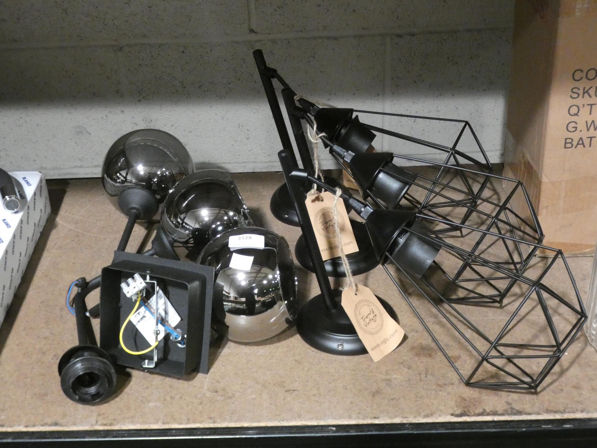 Three geometric black wall lights and a 3-arm smoked, chrome glass pendant light * this lot is subject to VAT