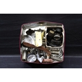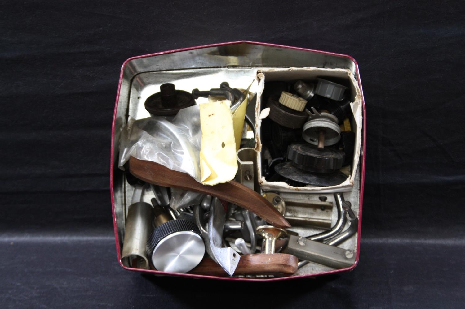 Tin of old dials and handles
