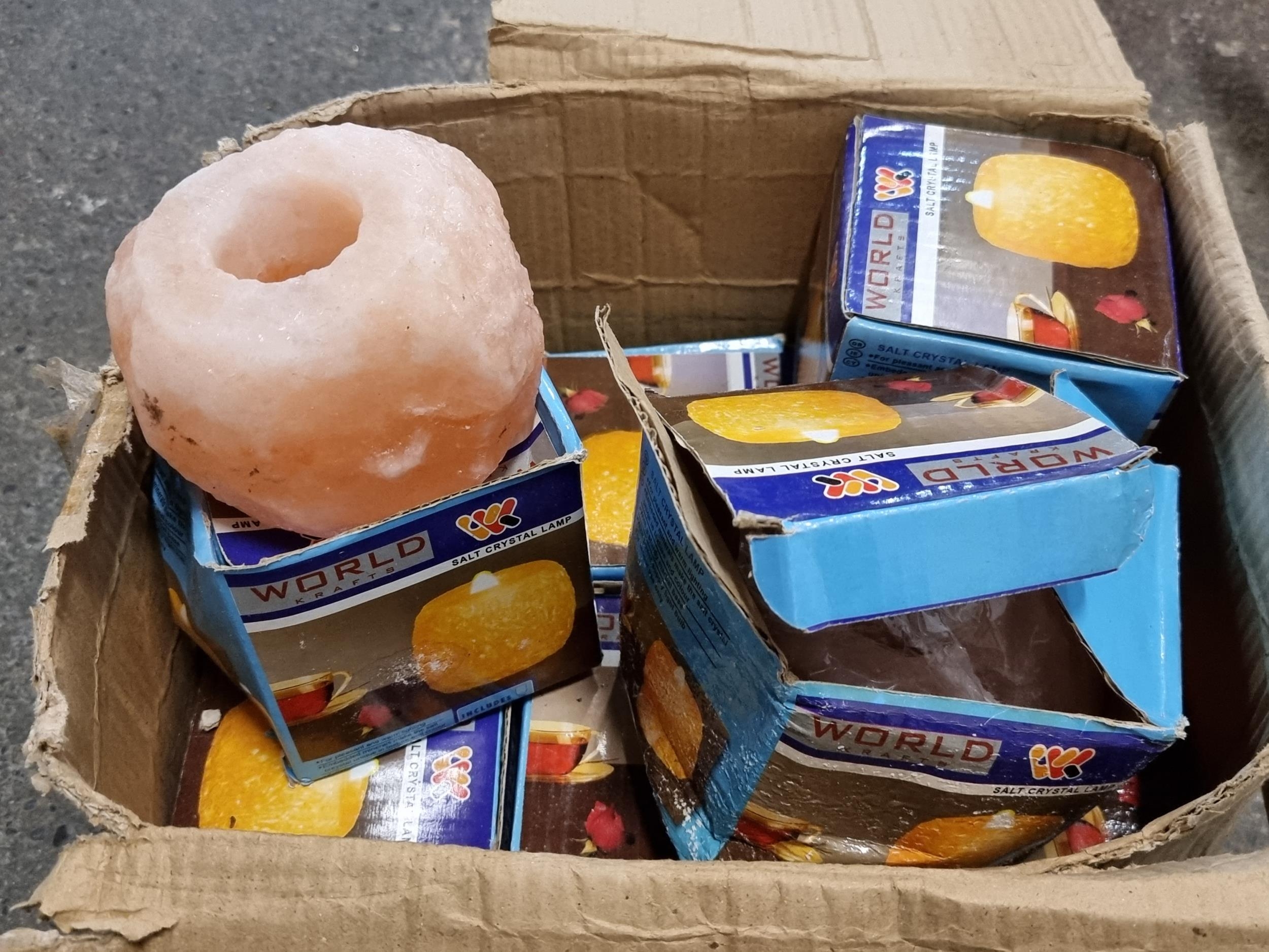 Seven new World Krafts Salt Crystal Lamps; in original packaging and with lightbulbs included.
