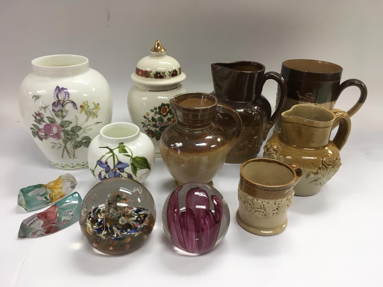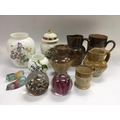 A small collection of ceramics and glass comprising Doulton Lambeth and similar harvestware items, paperweights etc NO RESERVE