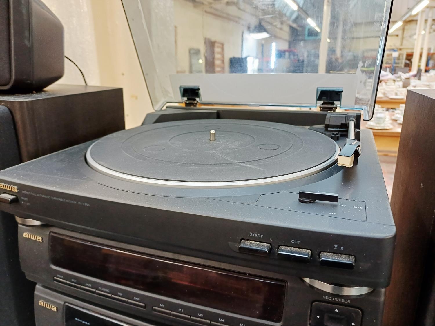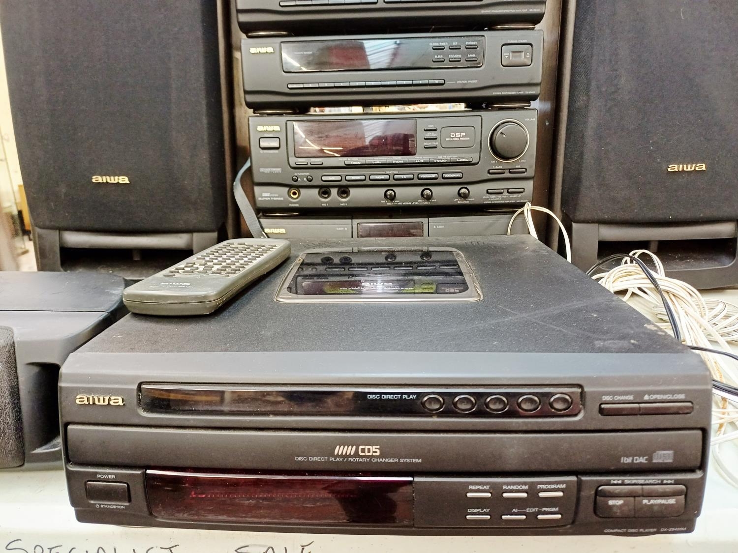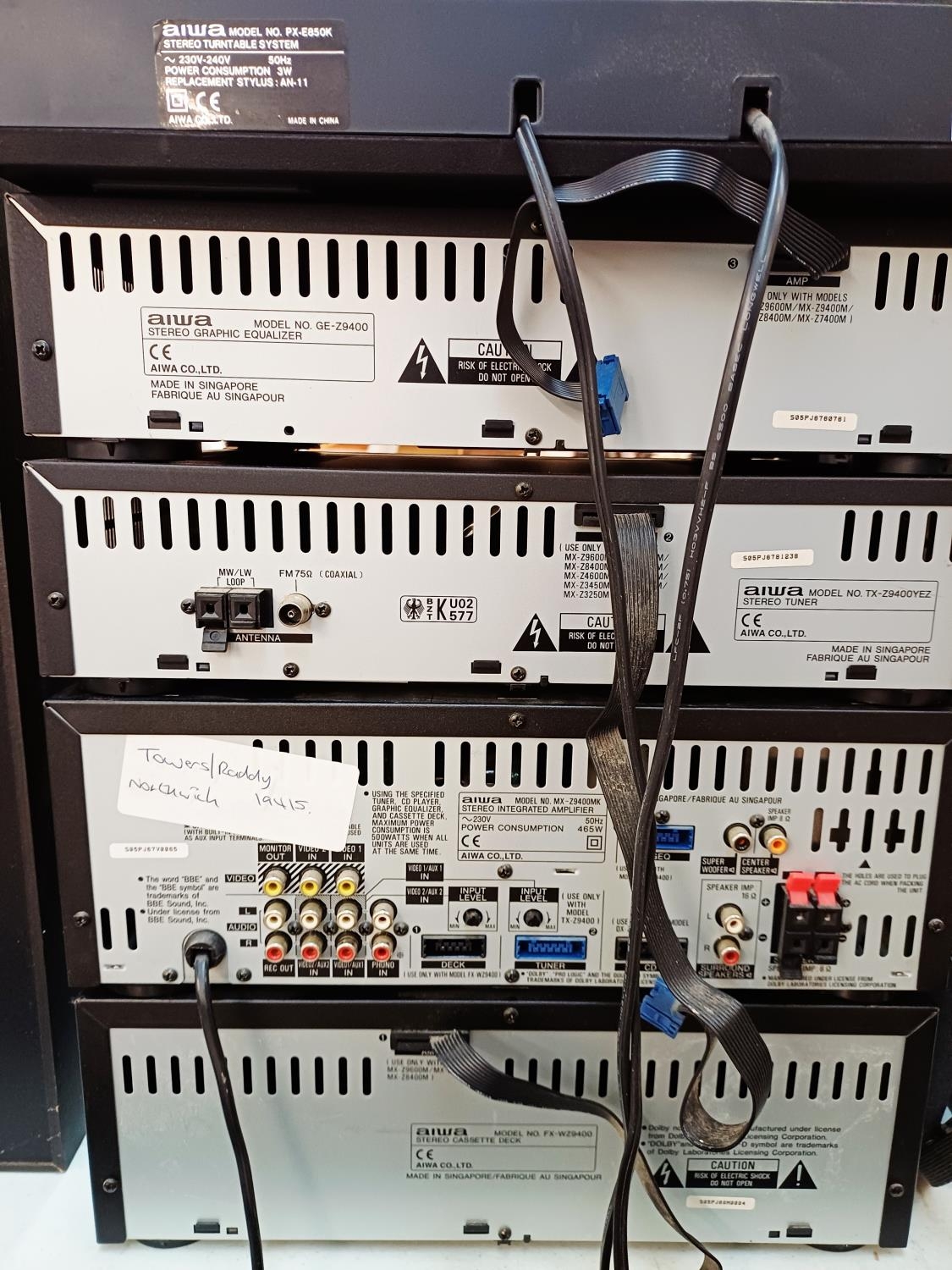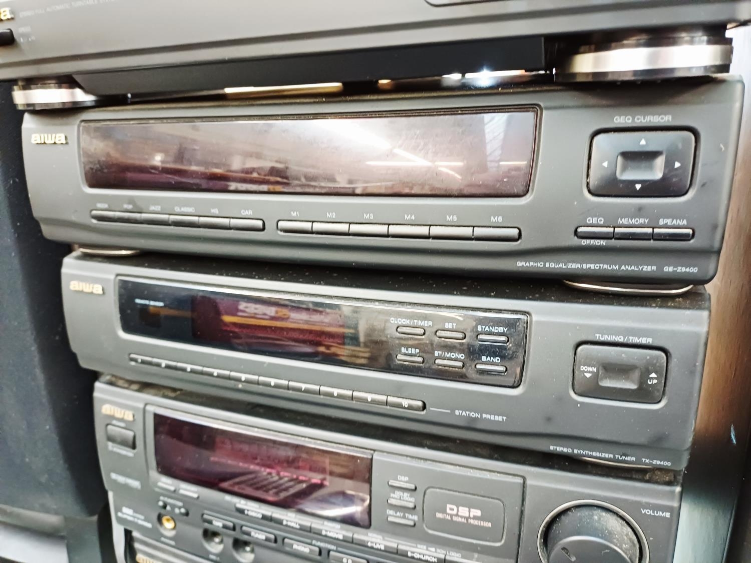 An Aiwa hi-fi system comprising PX-E850K two-speed turntable, GE-Z9400 graphic equaliser, TX-Z9400YEZ tuner, MX-Z9400MK integrated amplifier, FX-WZ9400 cassette deck, pair of SX-Z9400 6Ω speakers, DX-Z9400M five disc changer CD player, surround speakers and remote control