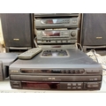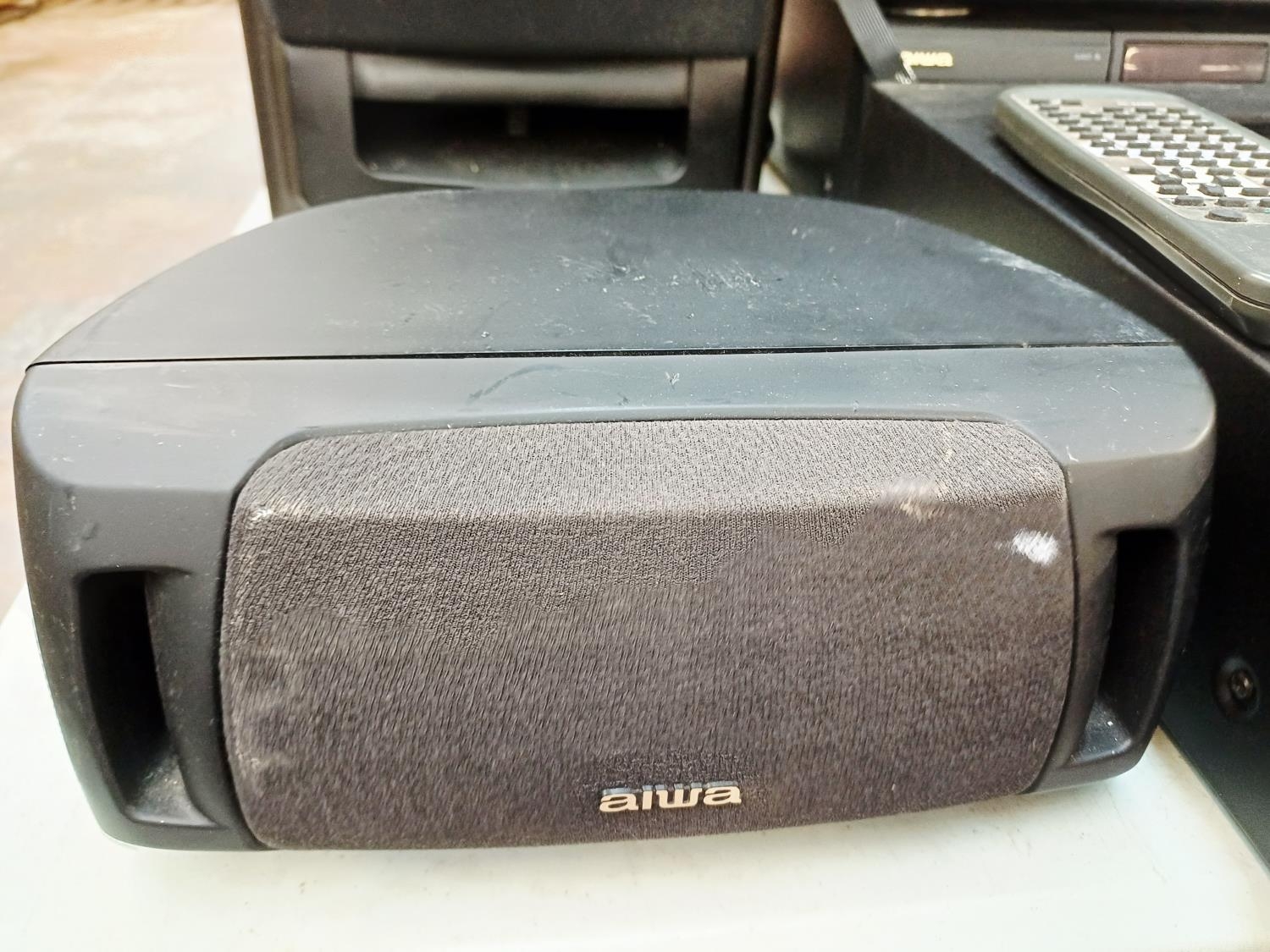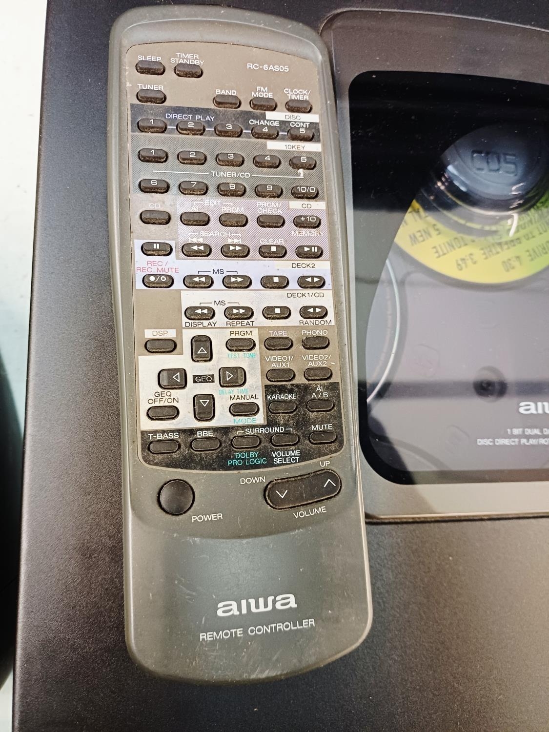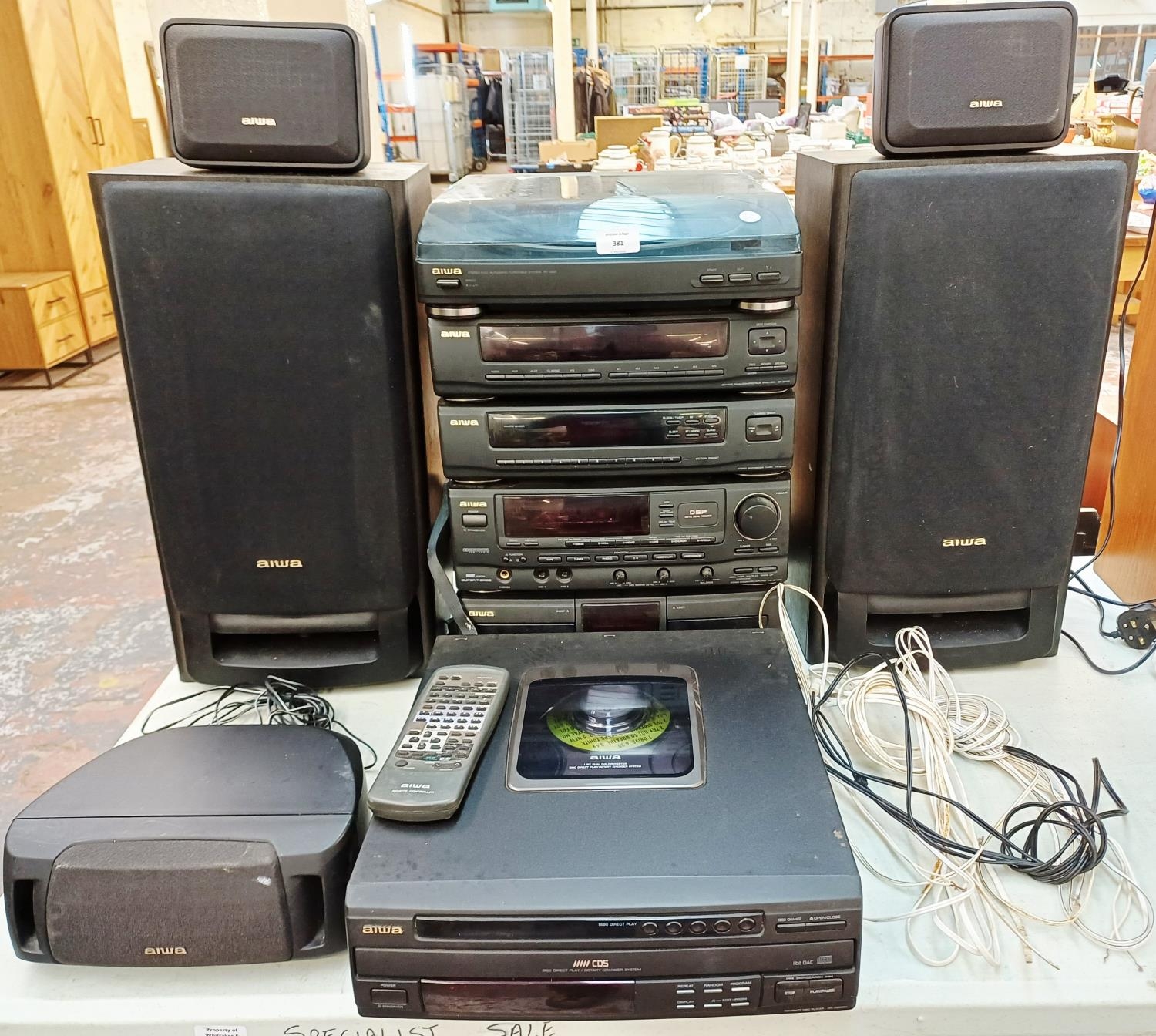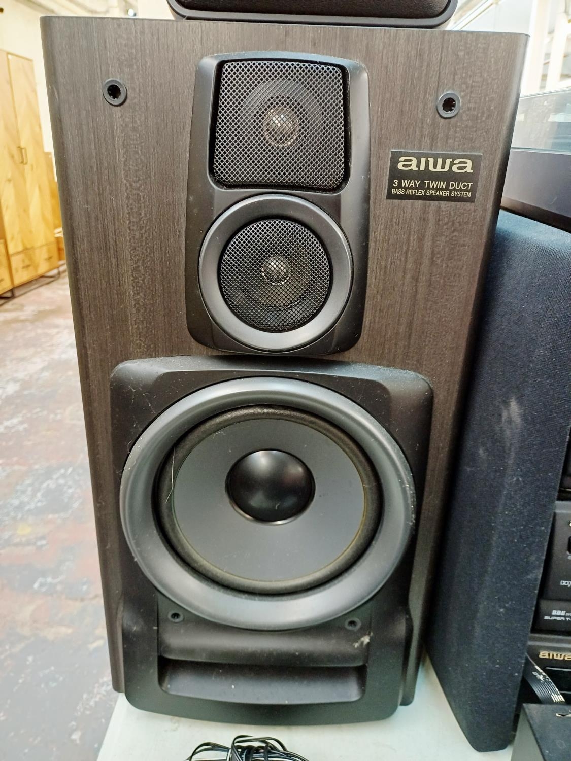 An Aiwa hi-fi system comprising PX-E850K two-speed turntable, GE-Z9400 graphic equaliser, TX-Z9400YEZ tuner, MX-Z9400MK integrated amplifier, FX-WZ9400 cassette deck, pair of SX-Z9400 6Ω speakers, DX-Z9400M five disc changer CD player, surround speakers and remote control