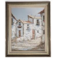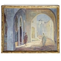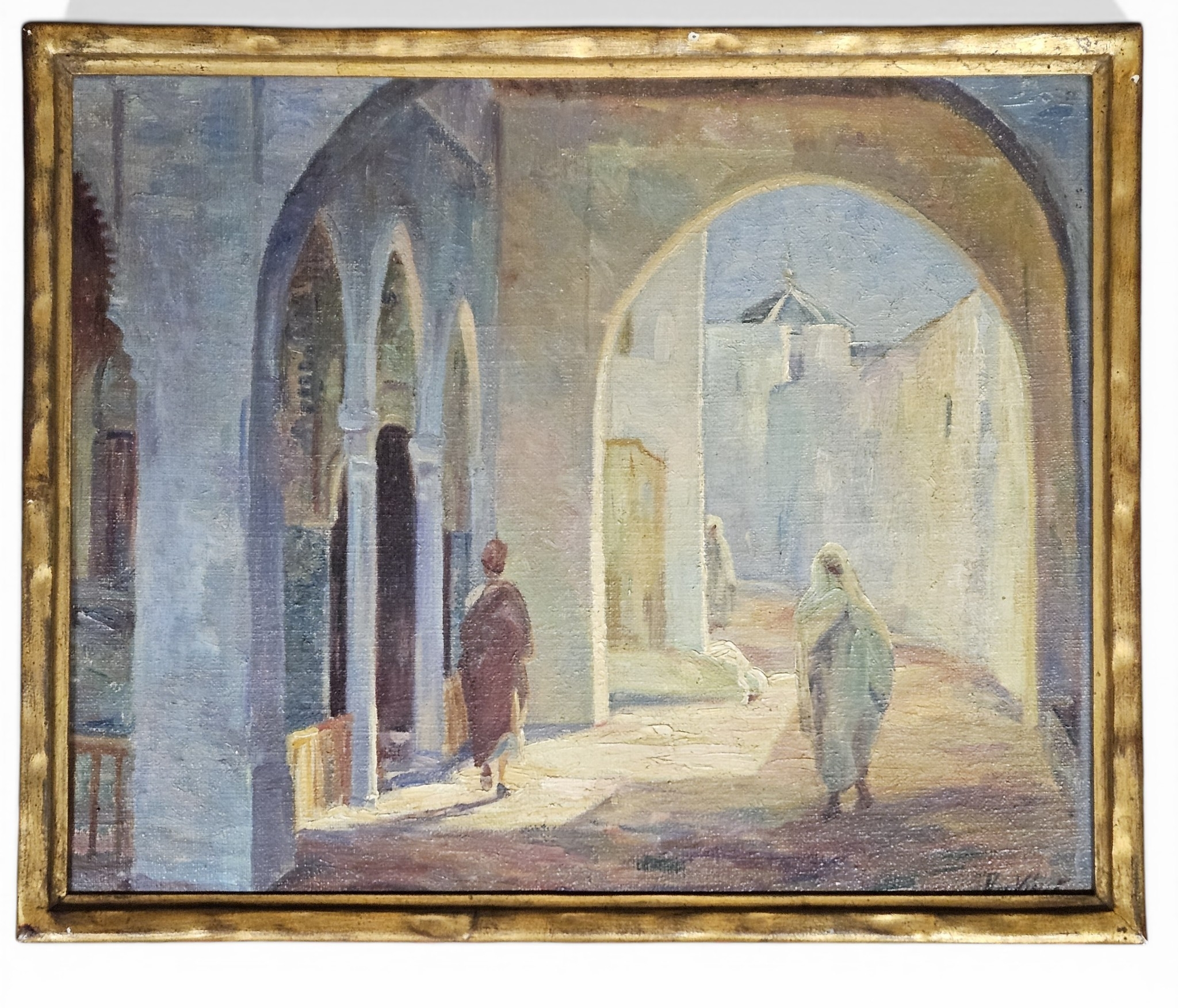 A very interesting early 20th Century north African or middle eastern Oil on Canvas of a street scene with figures, signed LR and details written in pencil verso on stretcher. 40 x 49 cm approx.