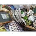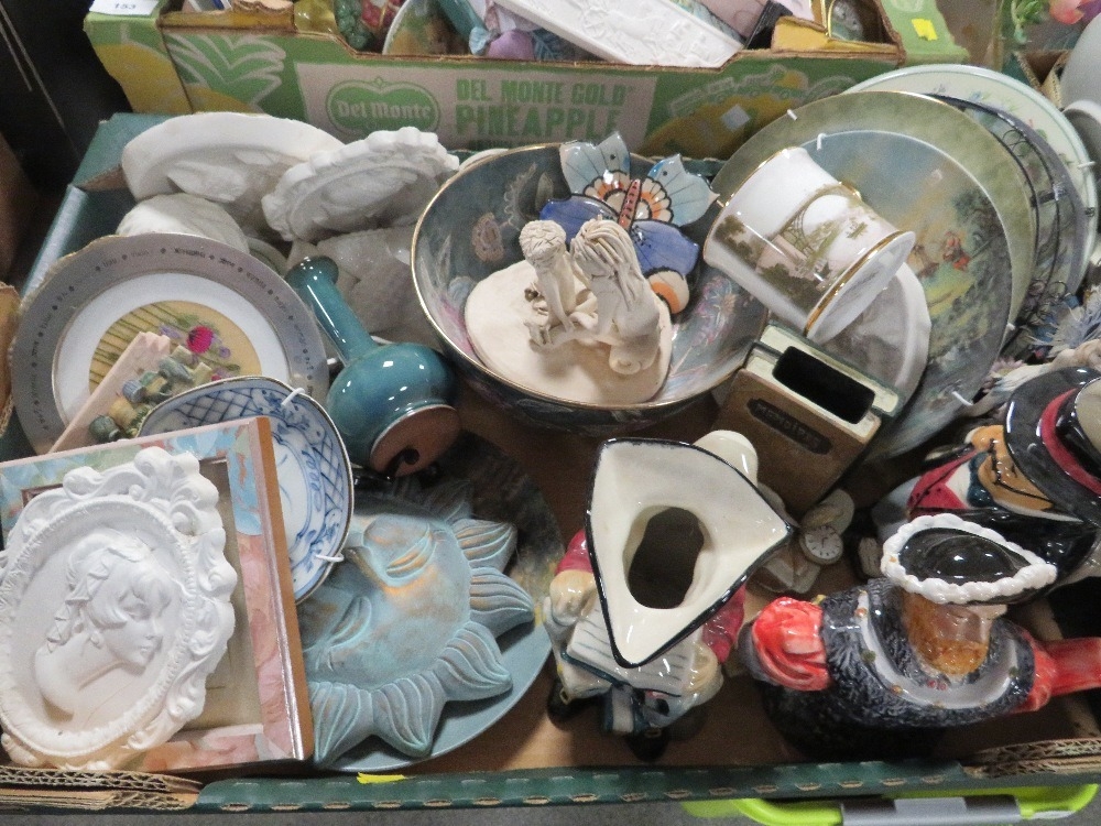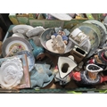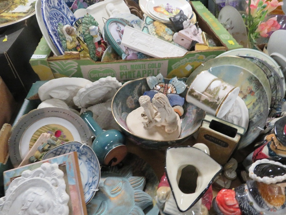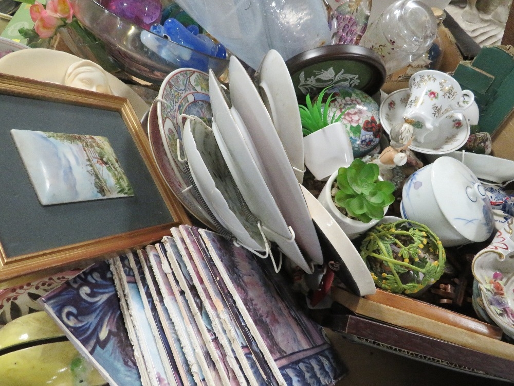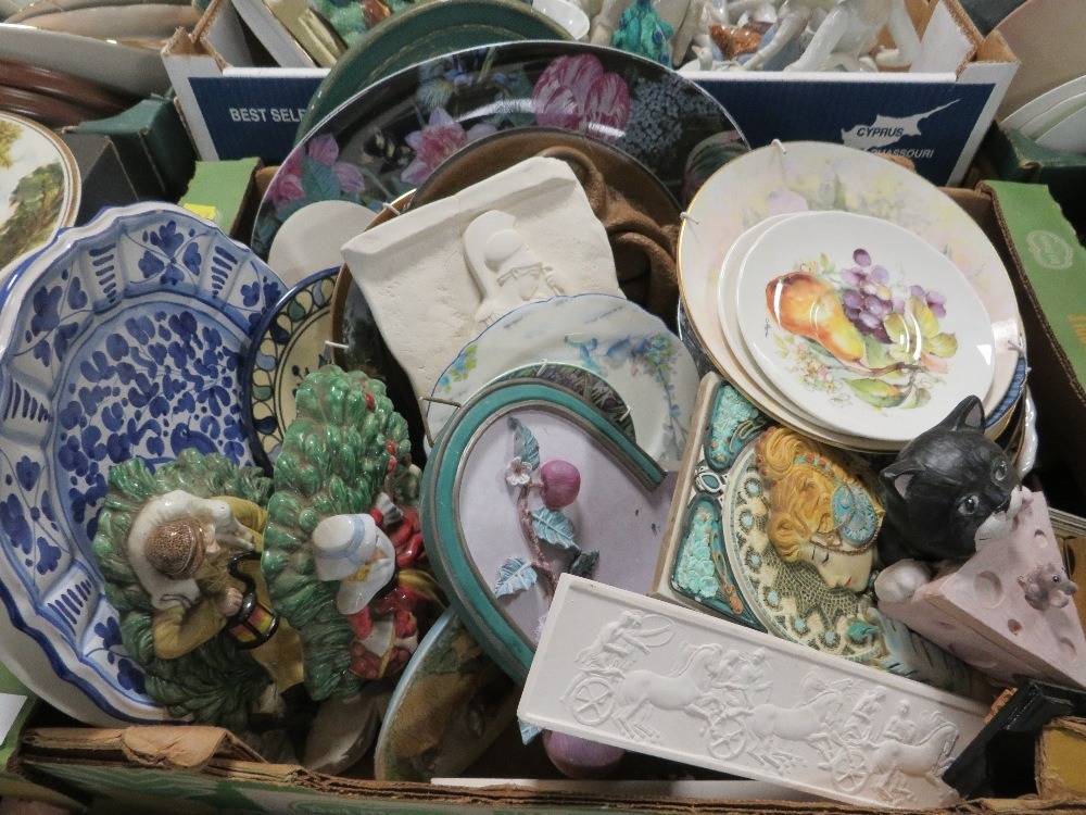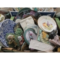 Three trays of assorted ceramics and collectables to include collectors plates and painted tiles etc
