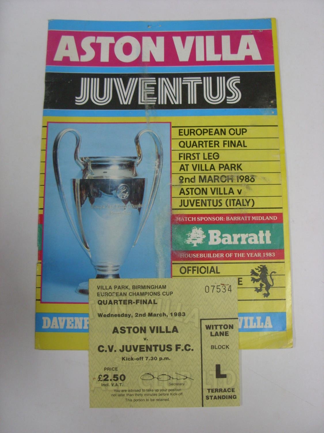 ASTON VILLA, 1982/1983, versus Juventus, a football programme & used ticket stub from the European Cup quarter final fixture played on 02/03/1983 (the ticket has staple holes and is folded, the programme has staple holes to front cover and is folded with team changes). Estimate: £10/£12 - Opening Bid: £8