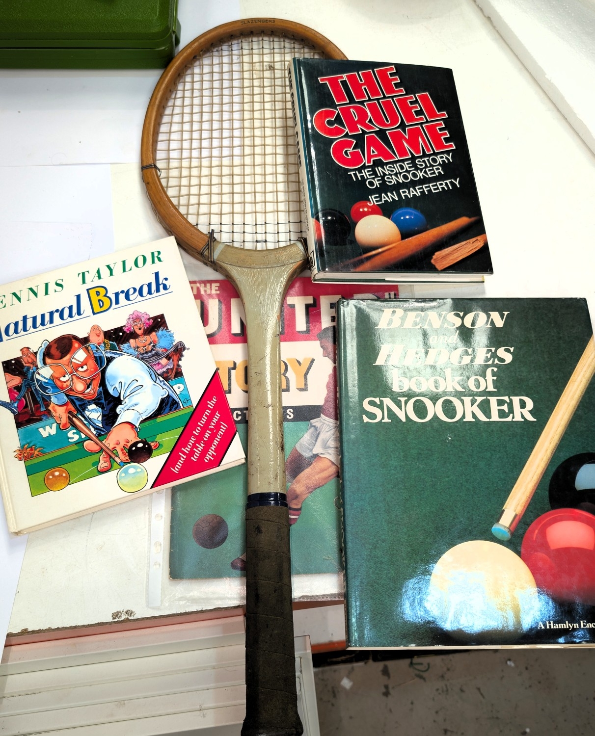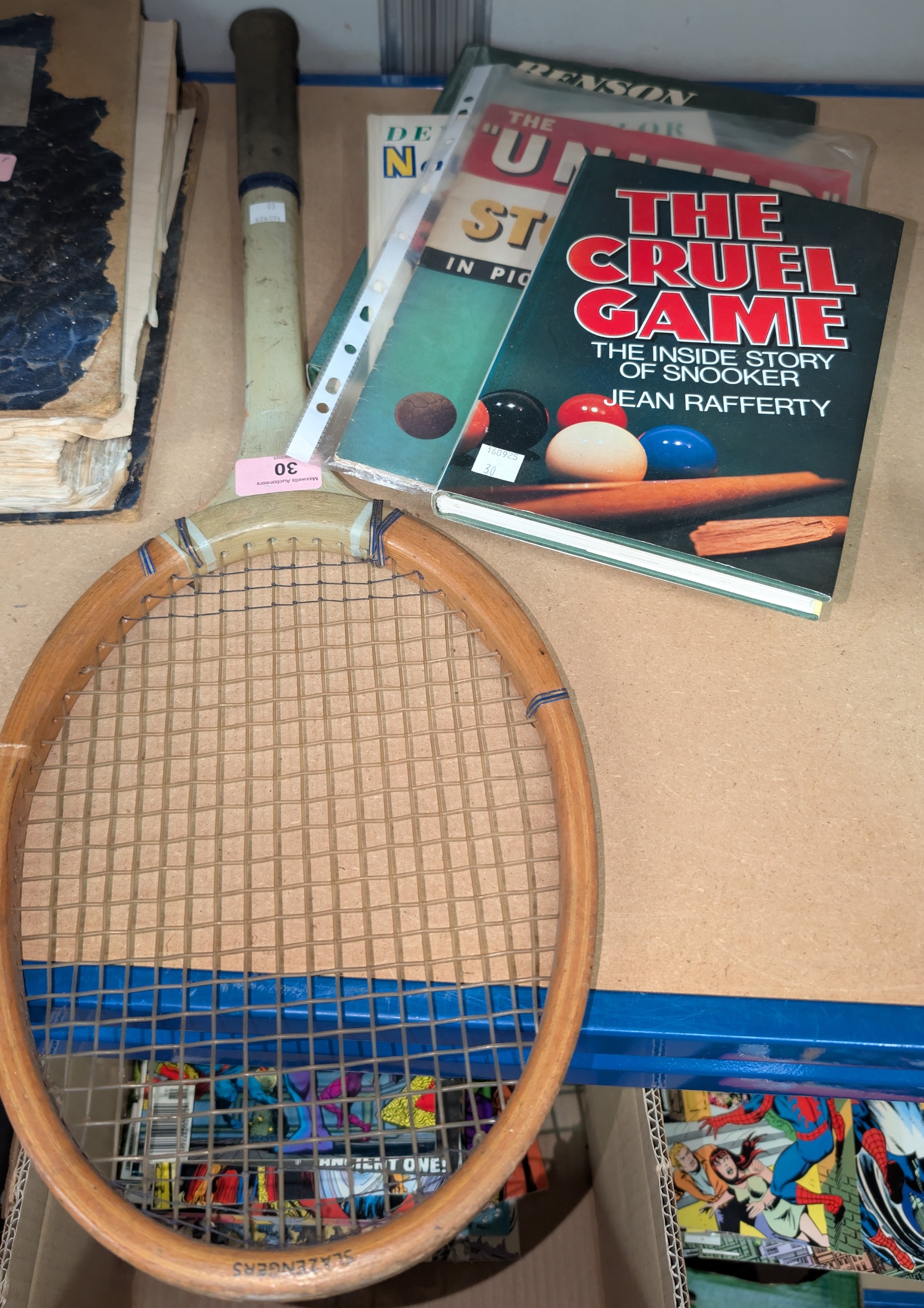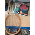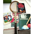 3 books on snooker; vintage tennis racket + 'The United Story' in pictures, Busby Babes era.