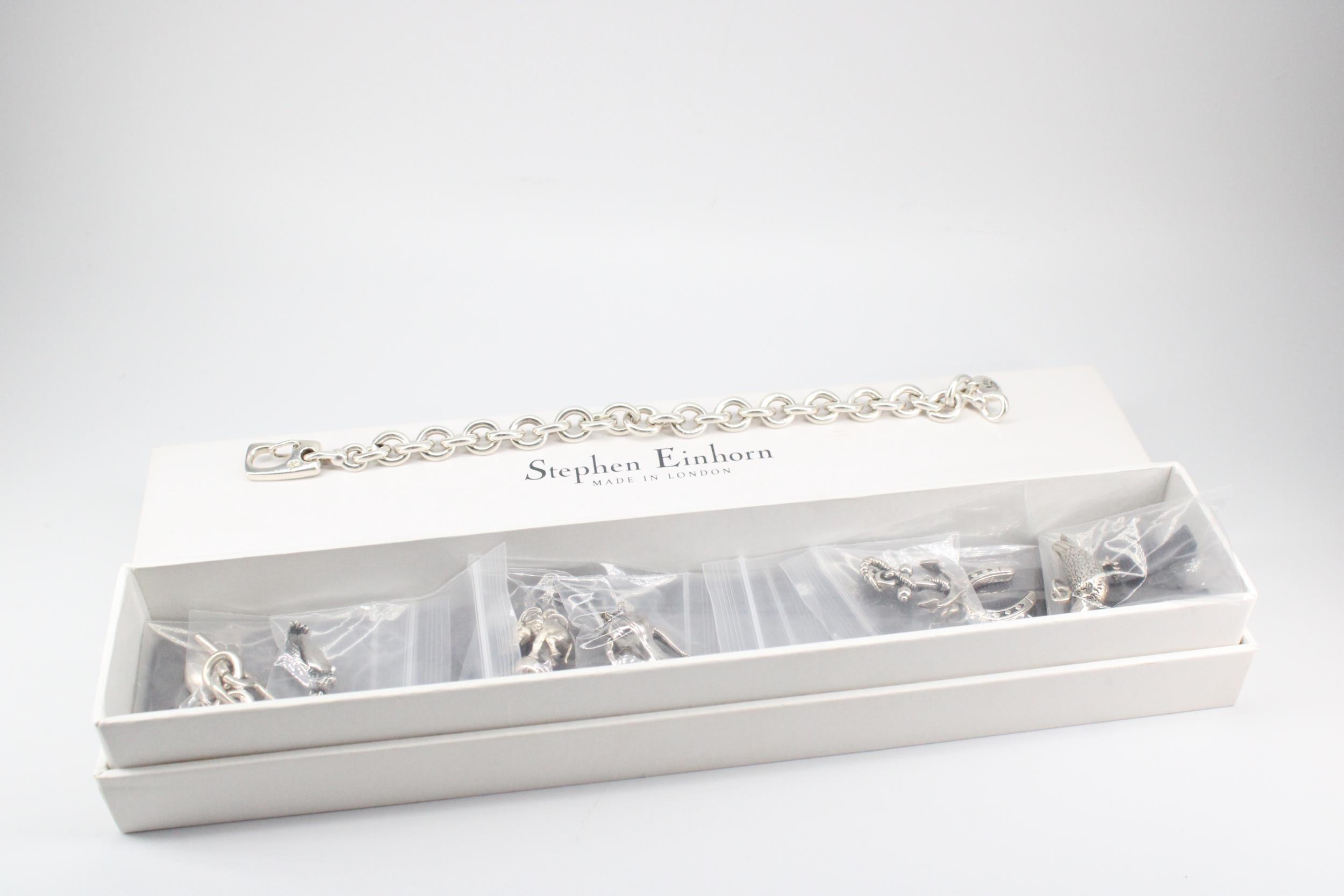 A Stephen Einhorn sterling silver charm bracelet with 7 charms and spare links - charms to include London Pigeon, Coffee Pot, Heart, Elephant on Ball, Penguin, Lucky Horseshoe and Anchor - with box, bracelet length approx 21cm - total weight approx 93 grams