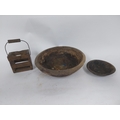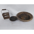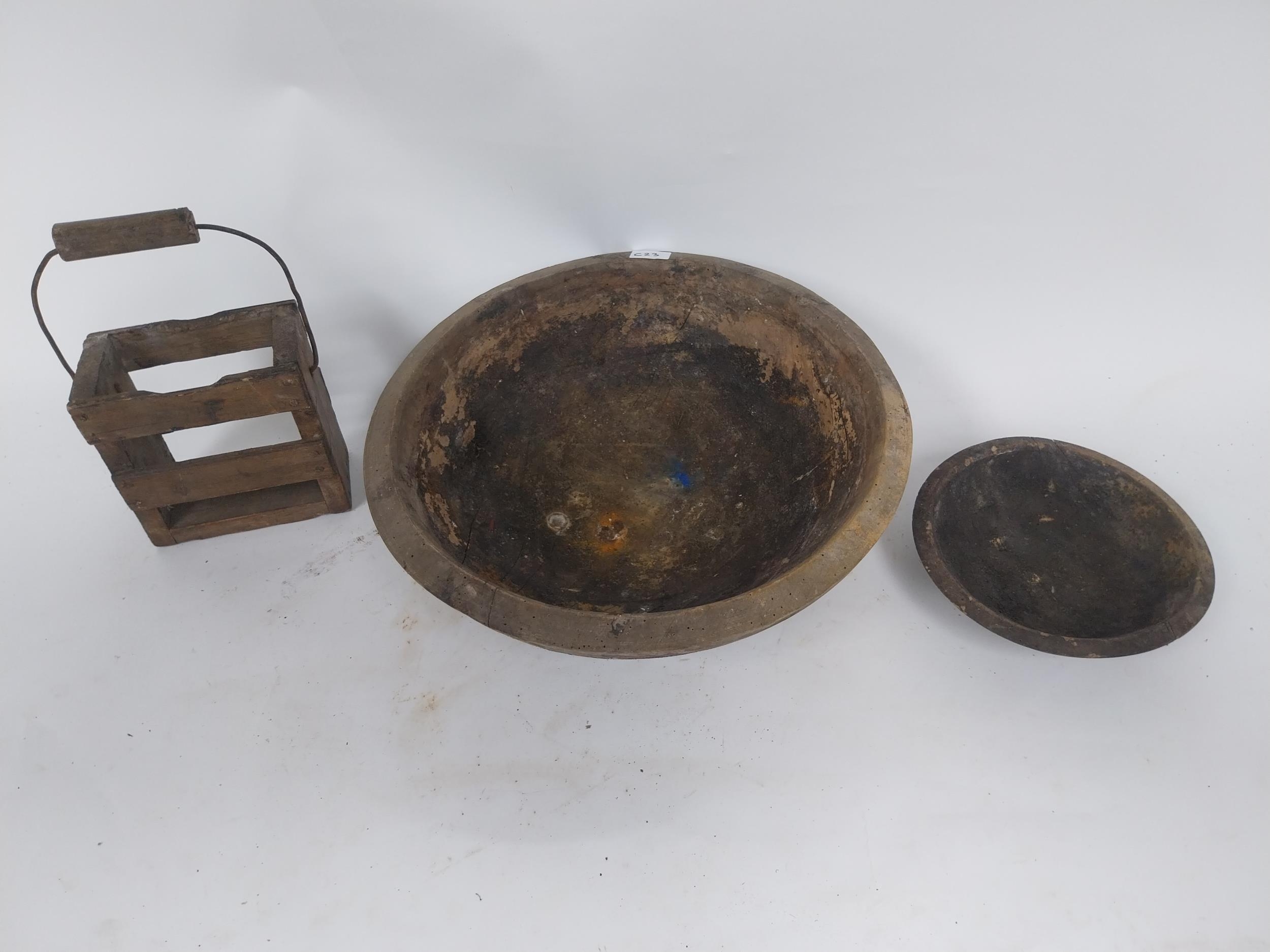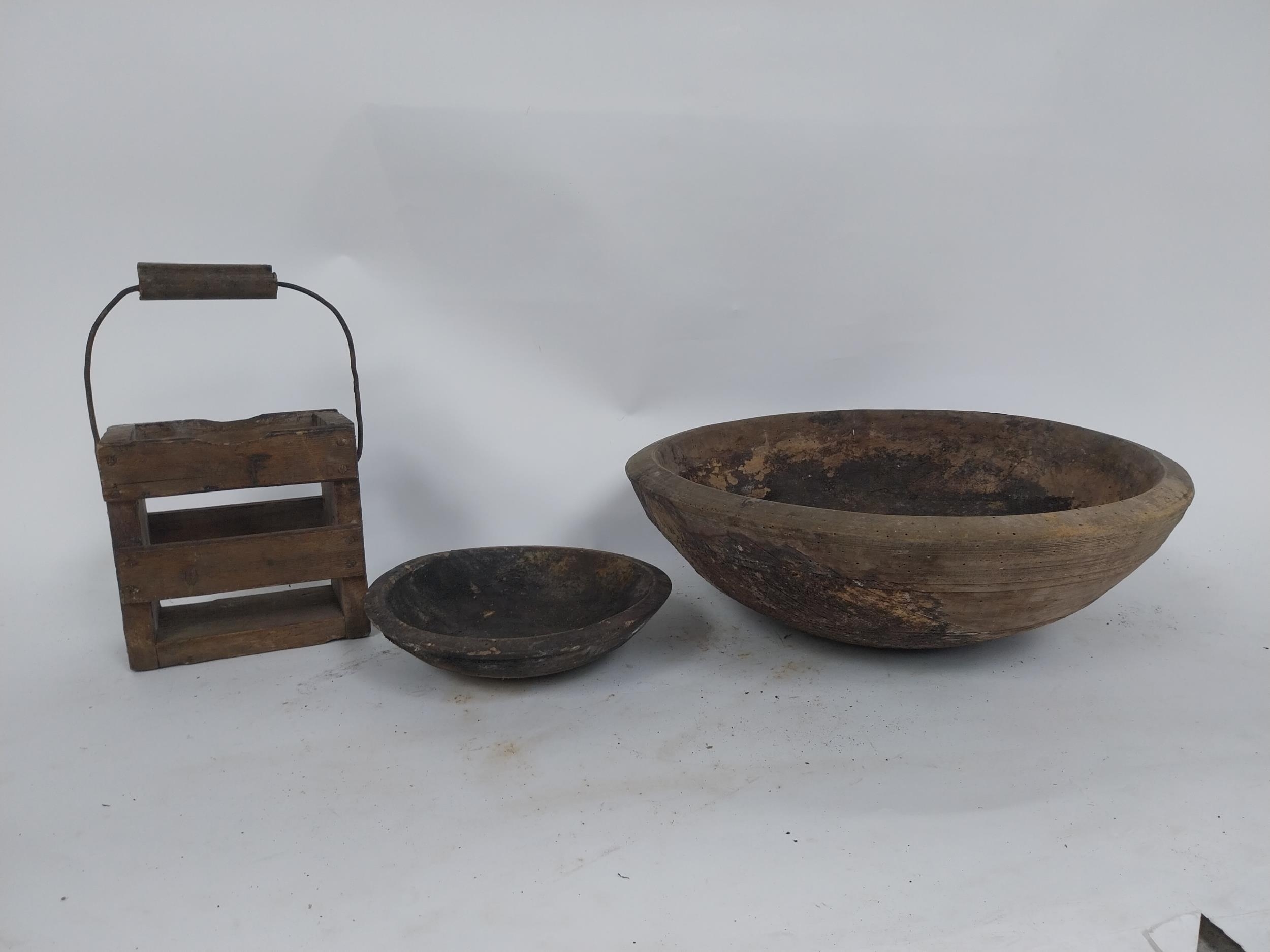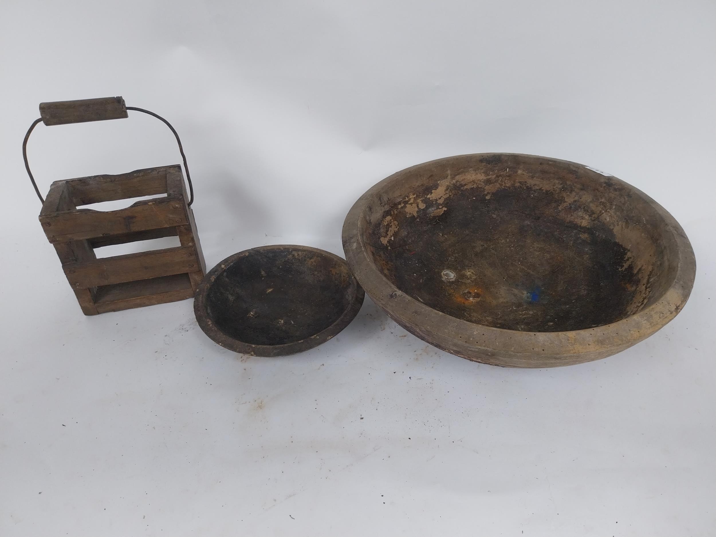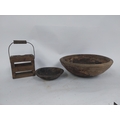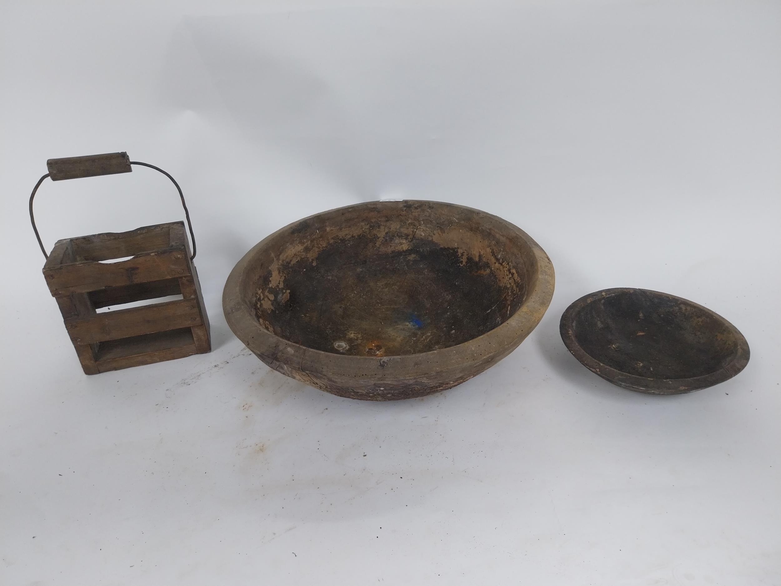 Two early 19th C. wooden bowls and pine bottle carrier {14 cm H x 45 cm Dia, 6 cm H x 23 cm Dia. AND 30 cm H x 21 cm W x 10 cm D}.