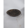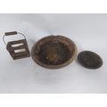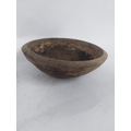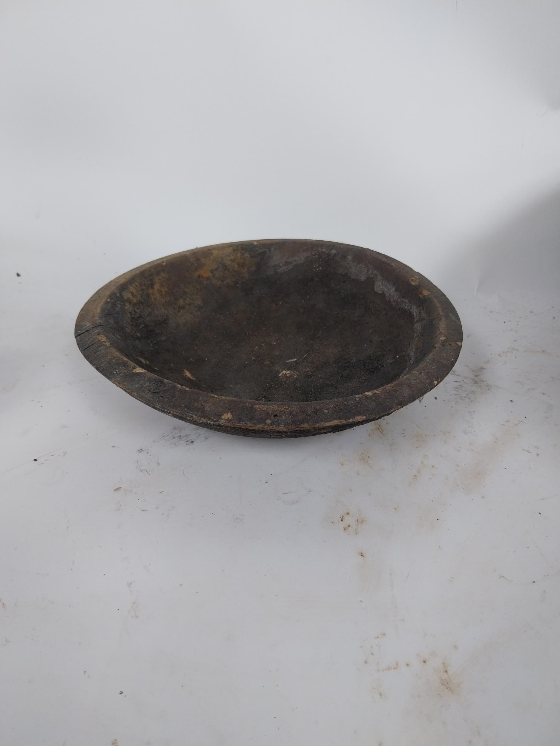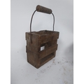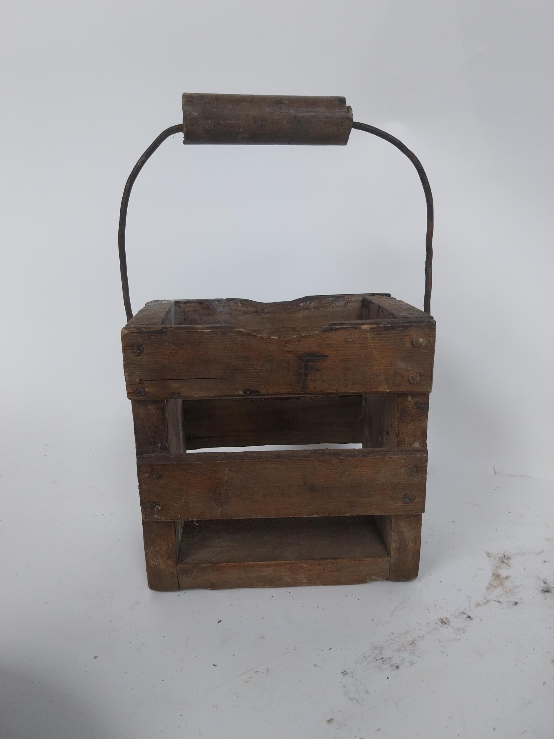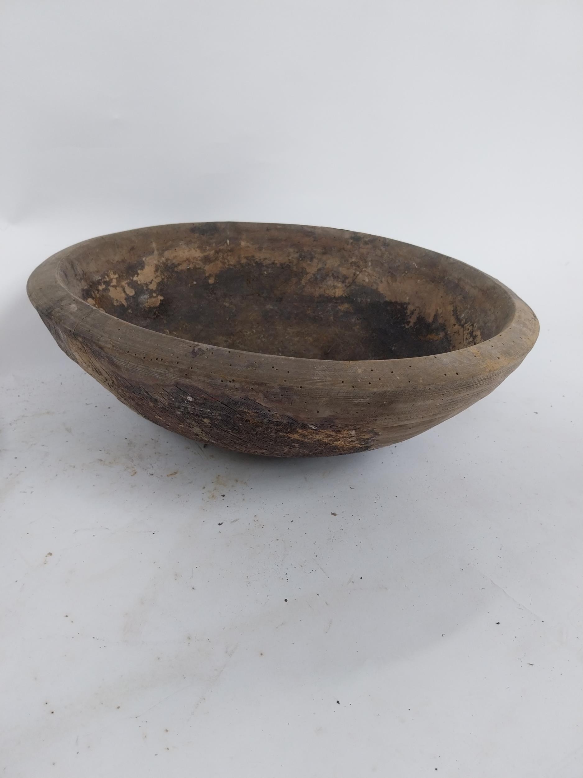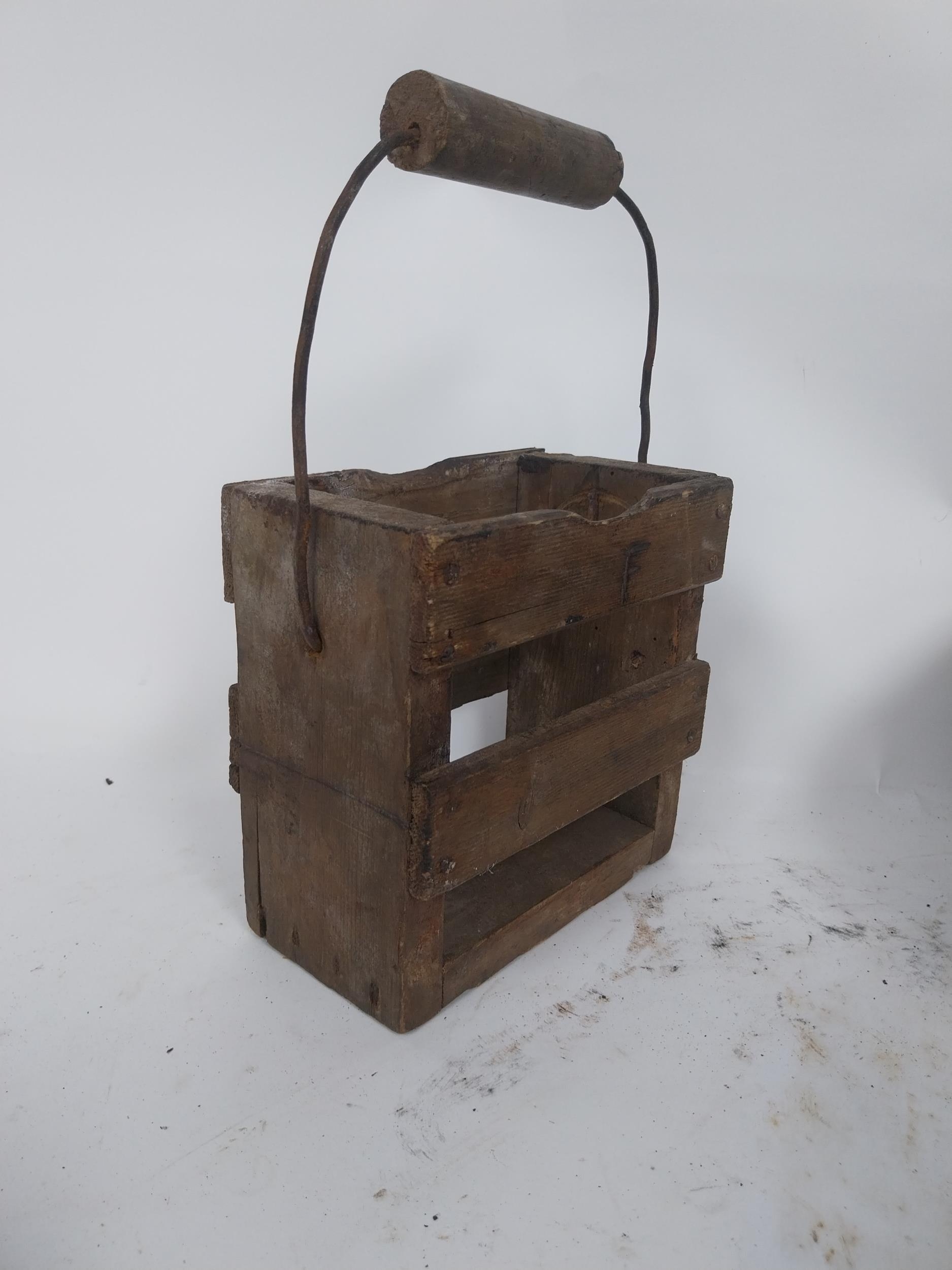 Two early 19th C. wooden bowls and pine bottle carrier {14 cm H x 45 cm Dia, 6 cm H x 23 cm Dia. AND 30 cm H x 21 cm W x 10 cm D}.