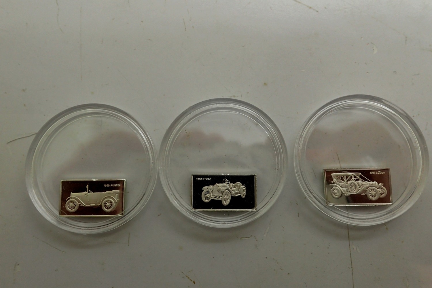 Three silver bullion car ingots, Lozier, Austin and Stutz. UK P&P Group 1 (£18+VAT for the first lot and £2+VAT for subsequent lots)