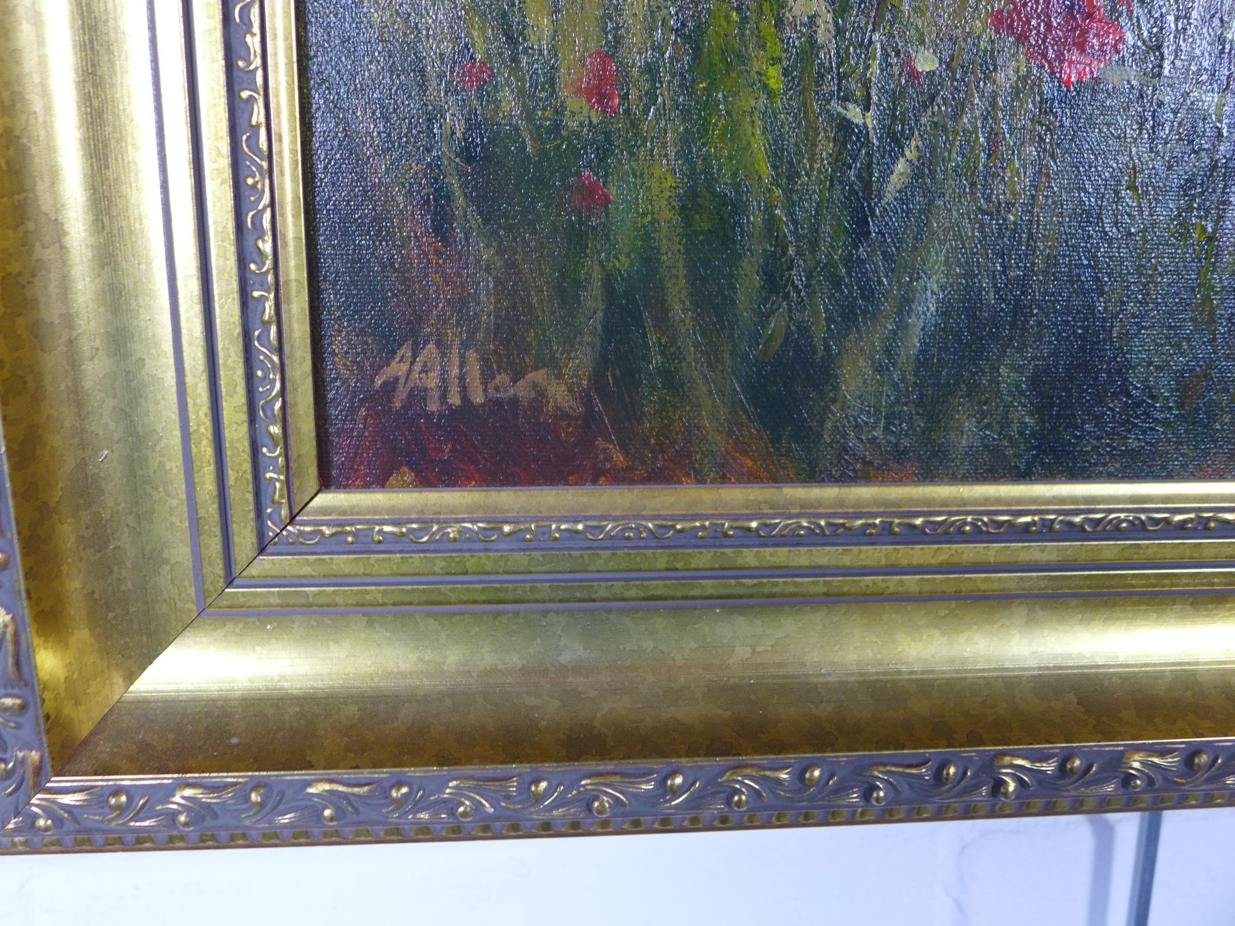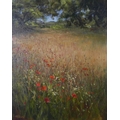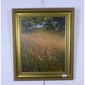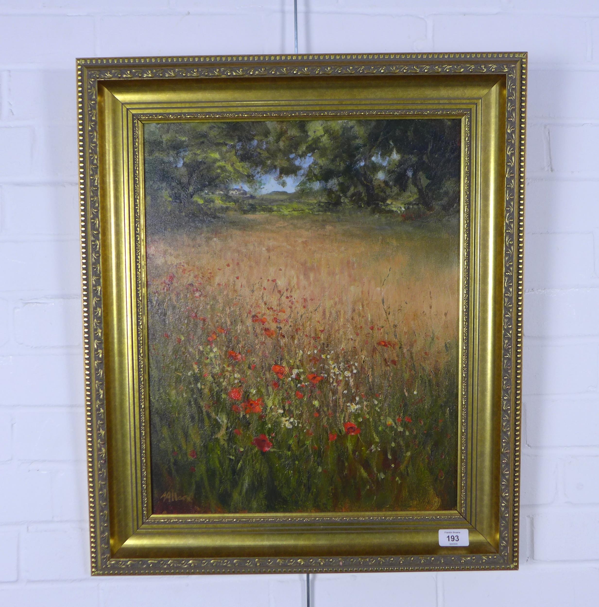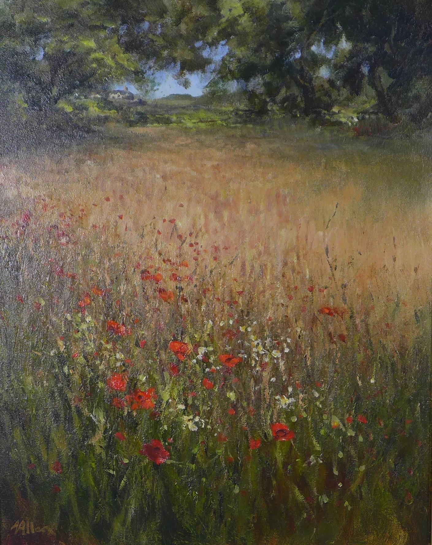 ALFRED ALLAN (SCOTTISH b. 1944), untitled oil on canvas of a field of poppies with a house in the distance, signed and framed, 39 x 49cm