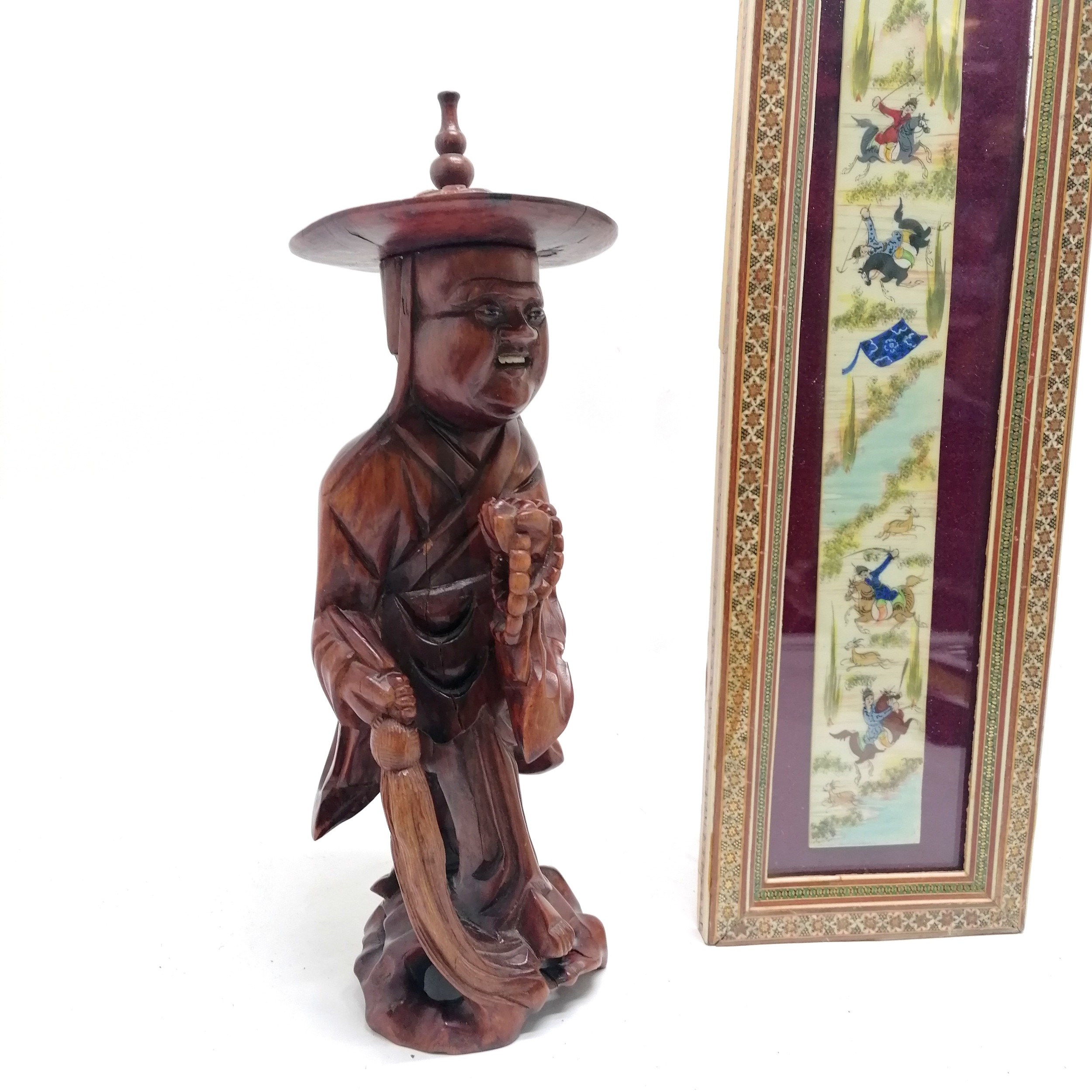 Carved wooden Oriental figure of an elder 35cm high T/W a framed Persian painting