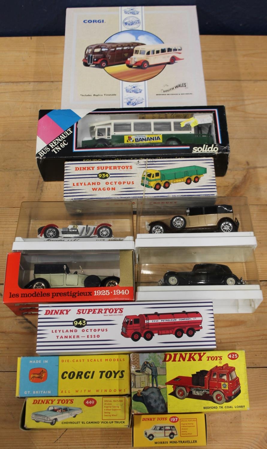 Dinky Supertoys 934 Leyland Octpus Wagon. Dinky Toys 425 Bedford TK Coal Lorry. Dinky Toys 449 Chevorlet El Camino Pick Up. Solido Renault TN6C. Solido 140 Panhard 1925. Solido 4032 Citreon 15CV. Solido 4004 Mercedes. Solido 40659 Renault 40CV. Corgi Toys 457 ERF Model 44G Platfrom Lorry. Corgi 97075 The South Wales Bedford OB Coach & AEC Regal set etc. each boxed. (12)