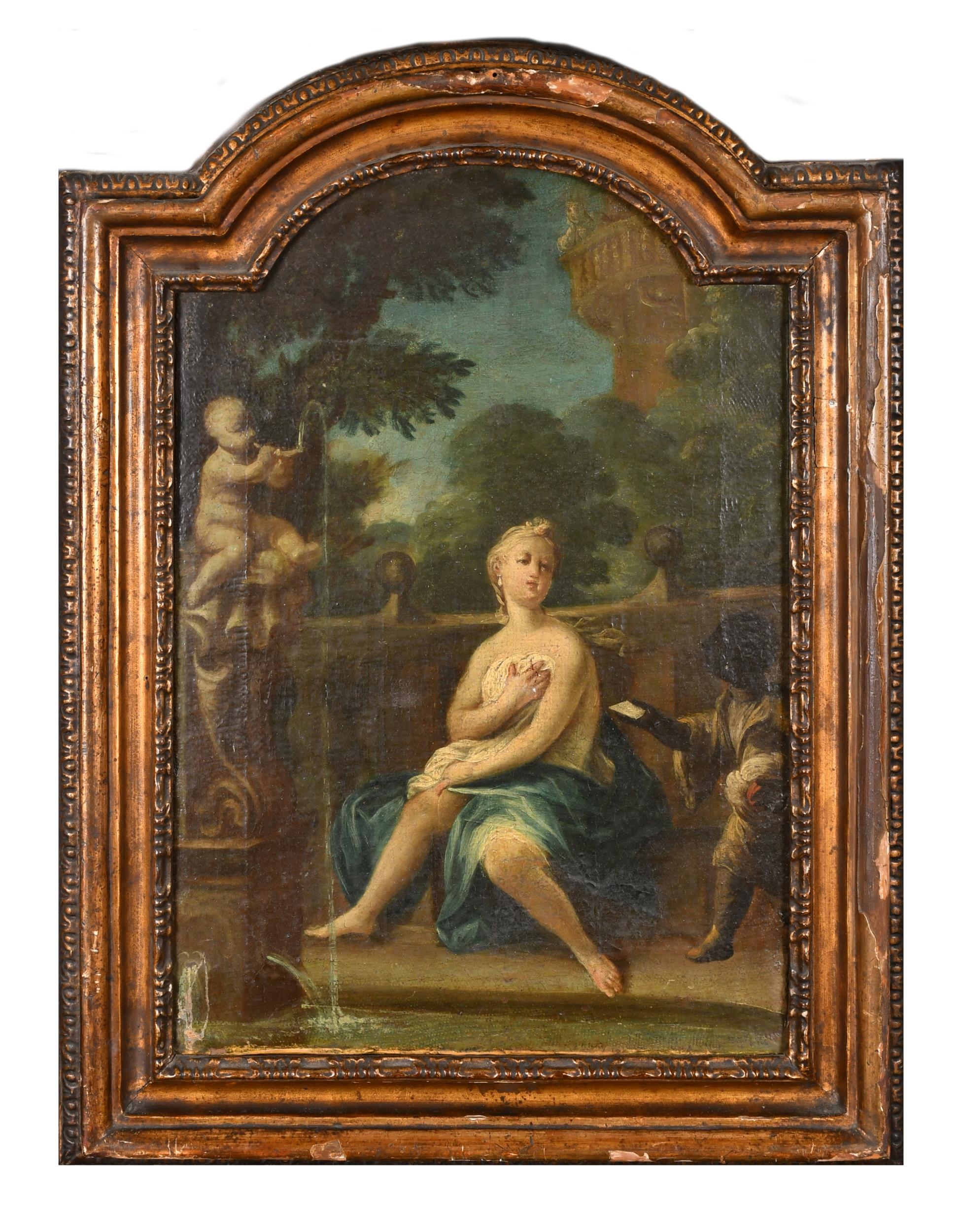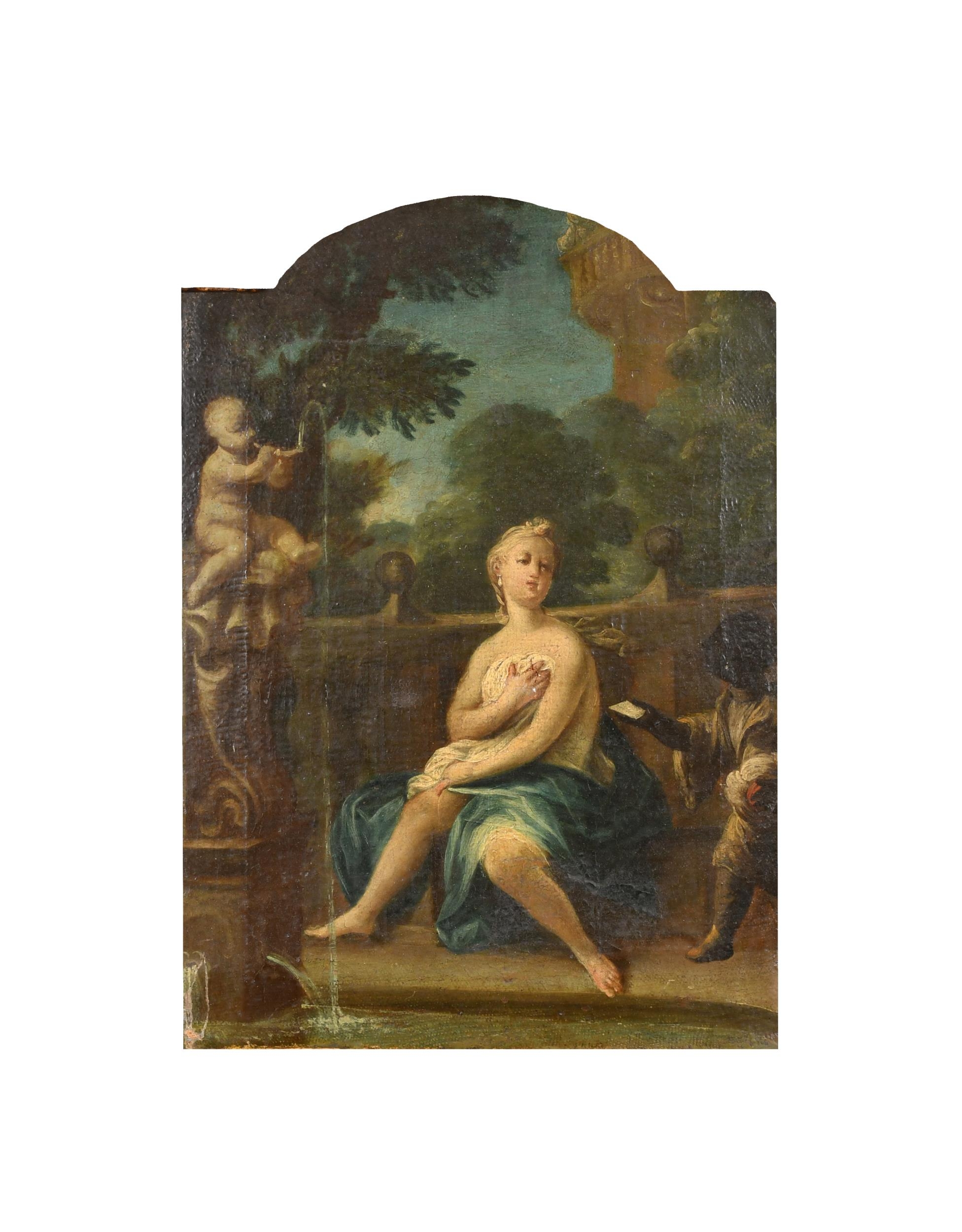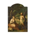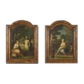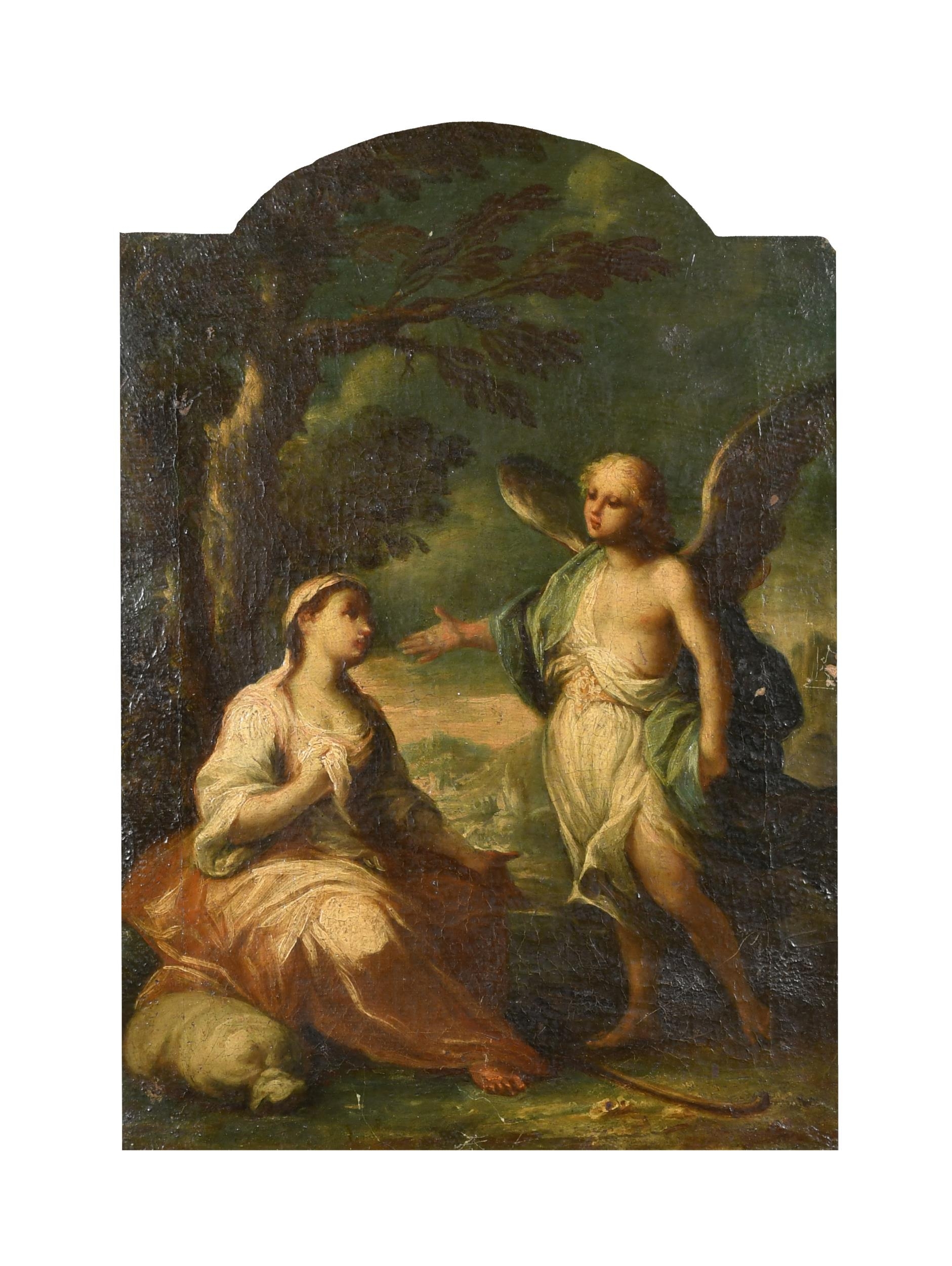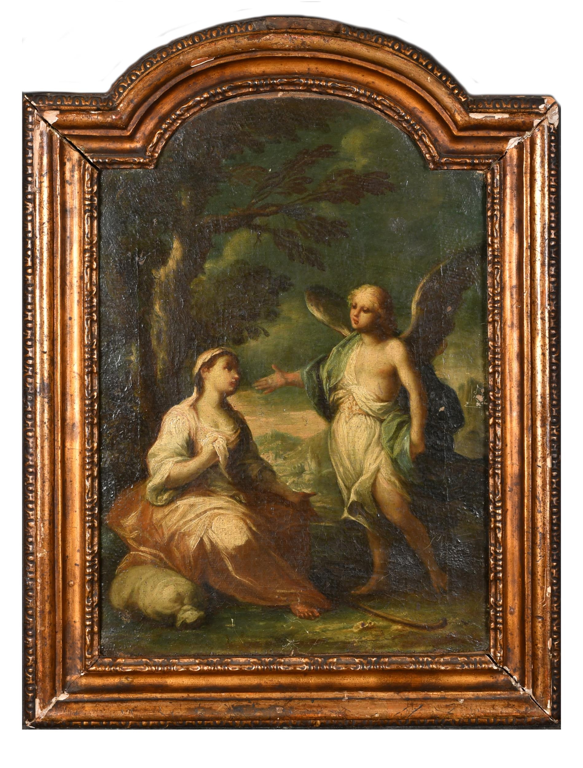Circle of Giovanni Gioseffo dal Sole (1654-1719) Italian. An Angel appearing to a Shepherdess, Oil on canvas, Shaped 18.75" x 12.75" (47.6 x 32.4cm) and a companion piece, a pair (2)