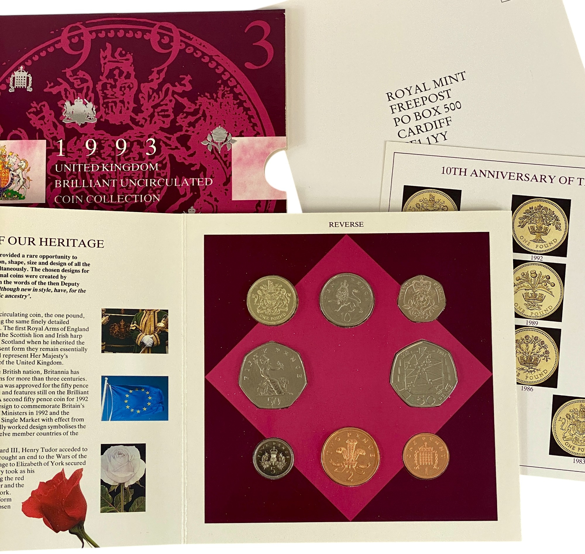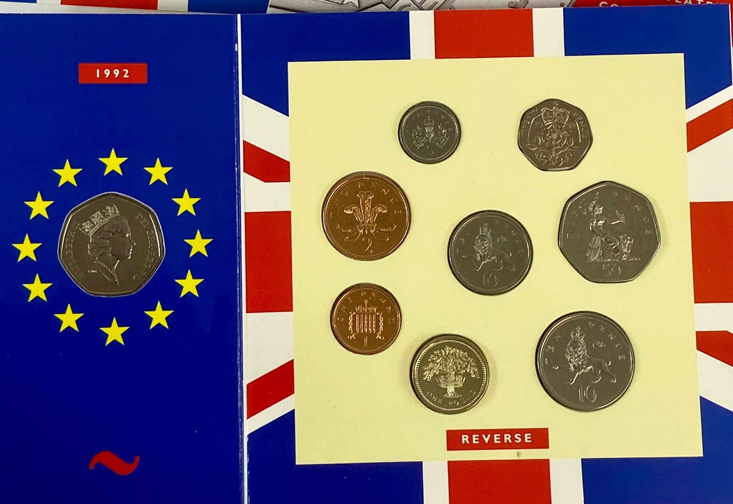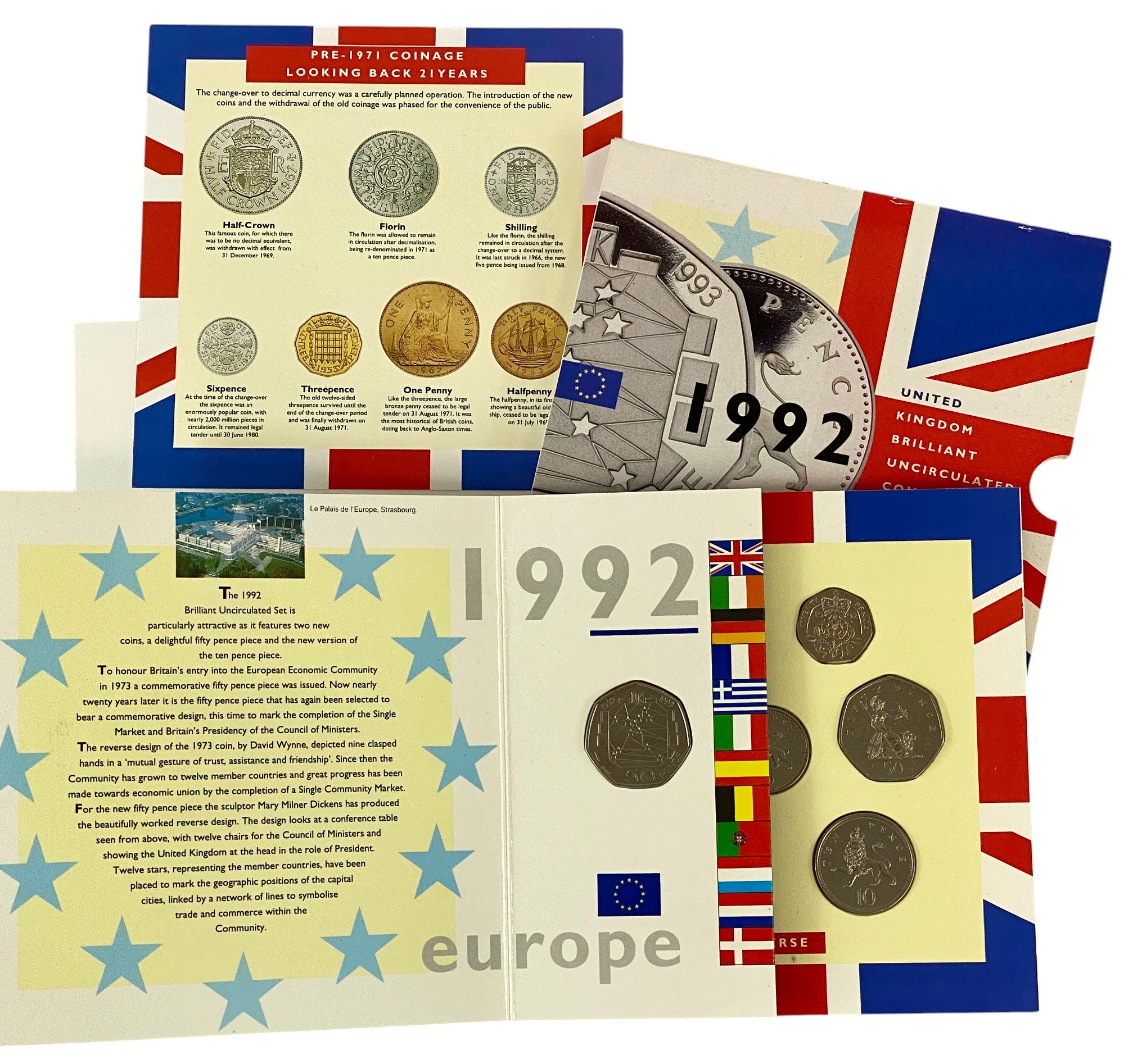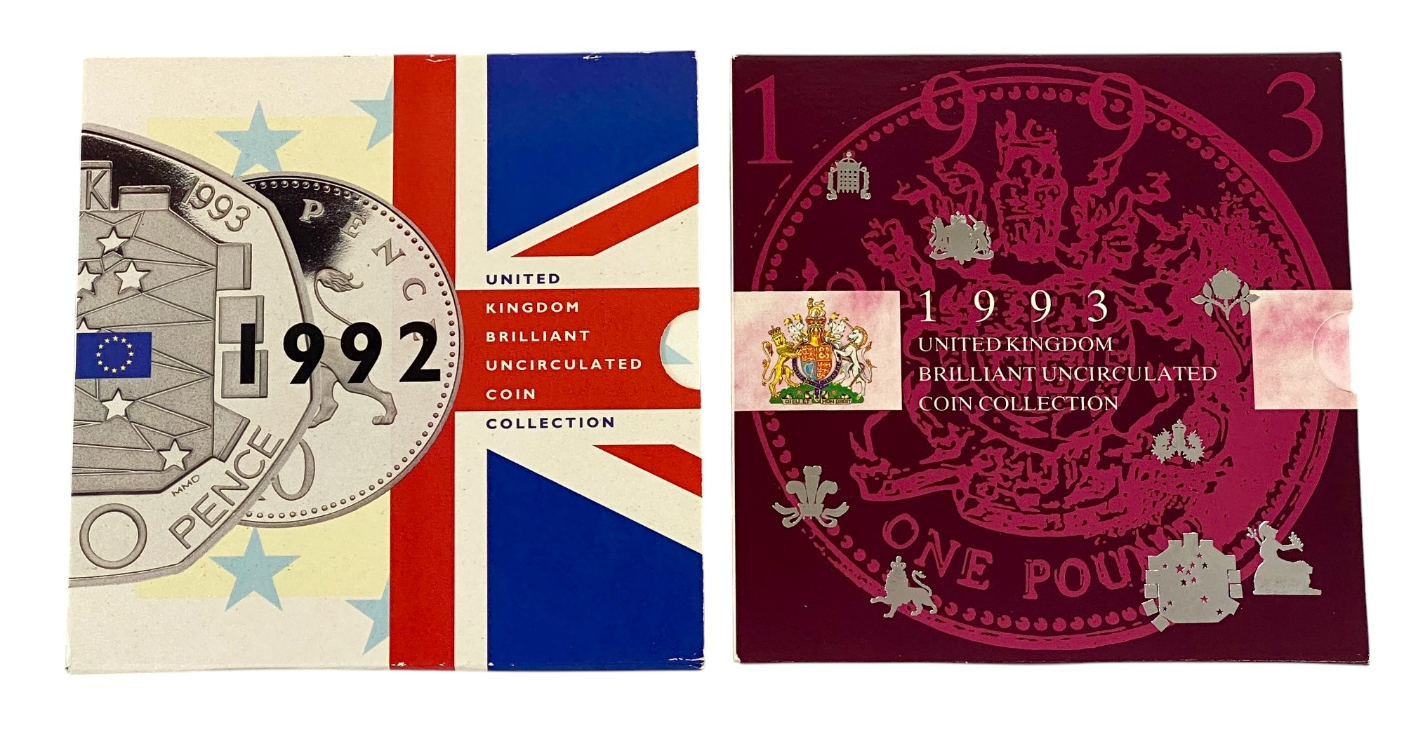 UK 1992 and 1993 Brilliant Uncirculated Coin Sets Including the Scarce Dual Dated EU 50 pence Coin in each set. All about as Struck in Original Royal Mint Cases