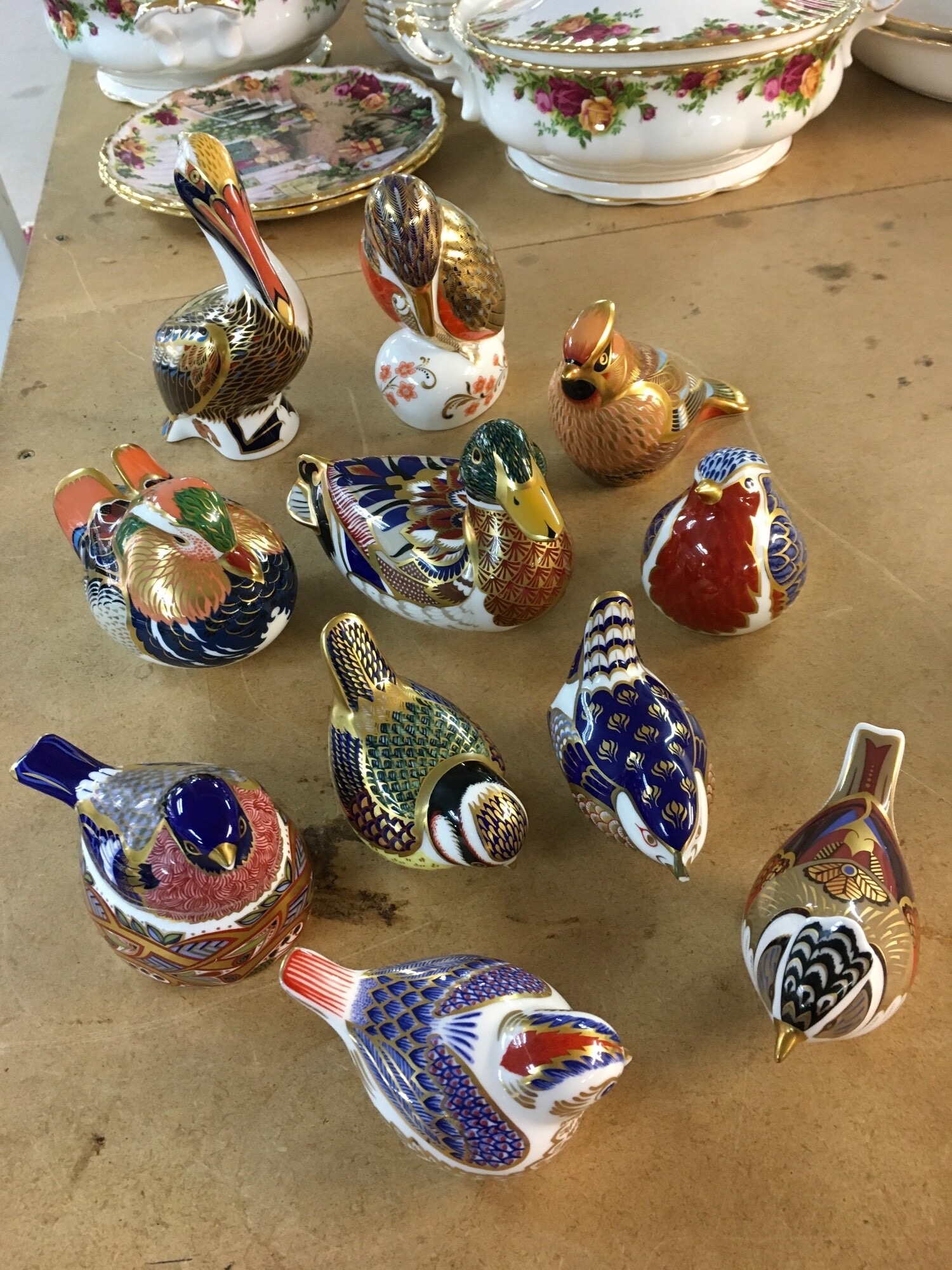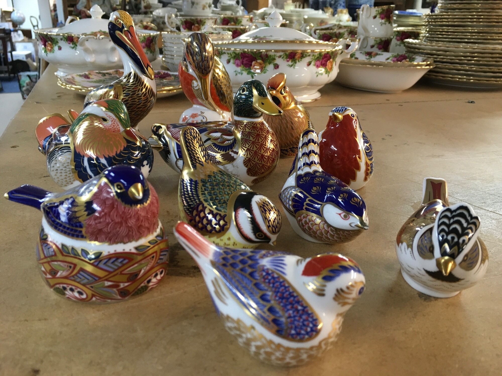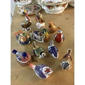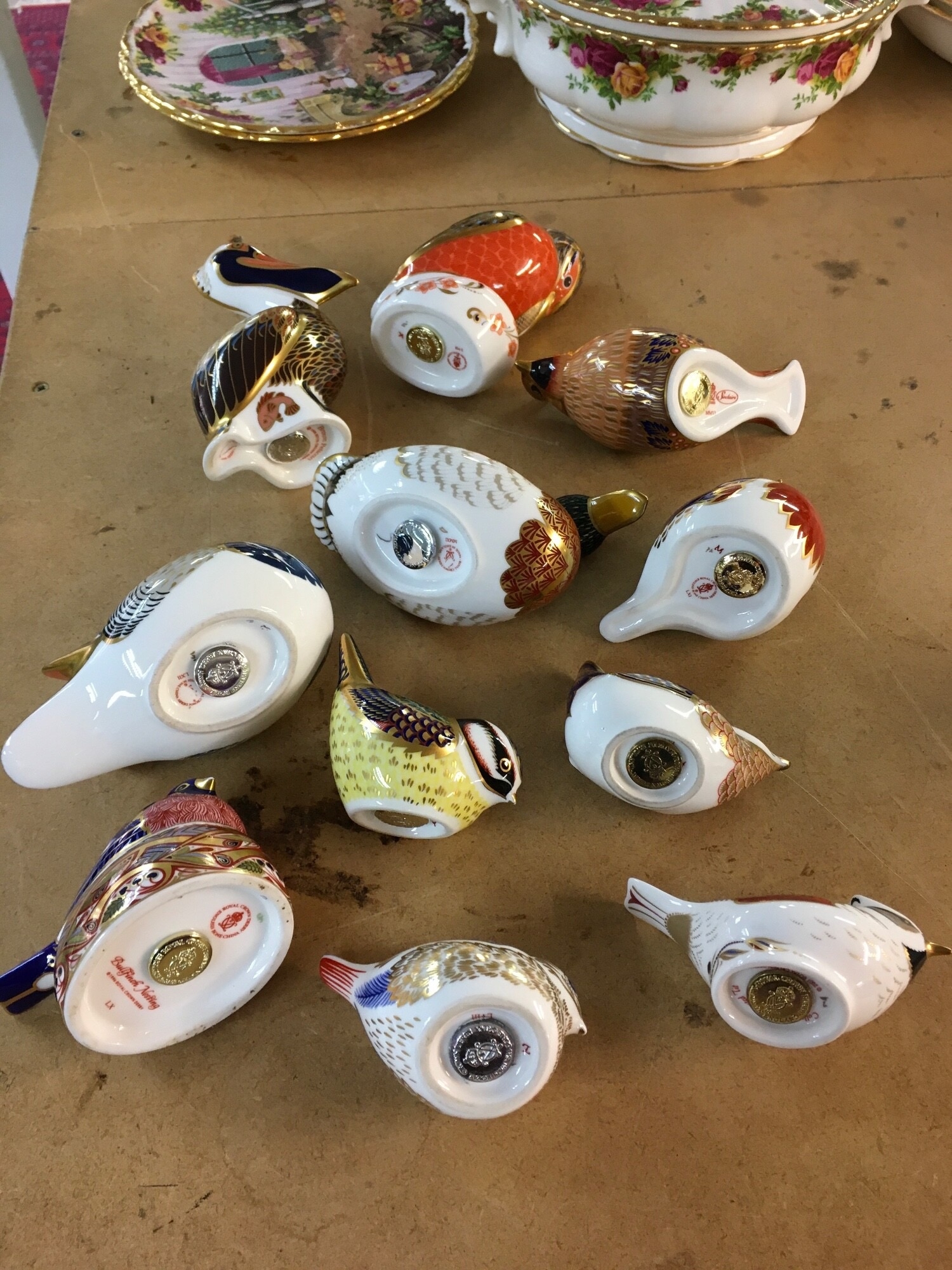 A collection of Royal Crown Derby paperweights in the form of birds including Pelican, Waxwing and Kingfisher- various sizes and all with stoppers