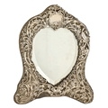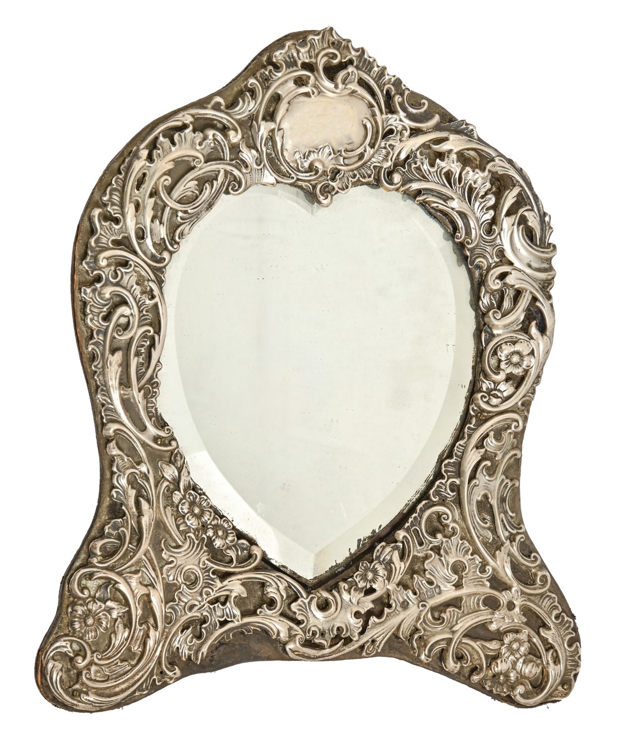 An Edwardian silver heart-shaped dressing mirror, the mount die stamped with flowers and scrolls, 30cm h, maker's mark obscured, London 1904