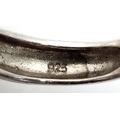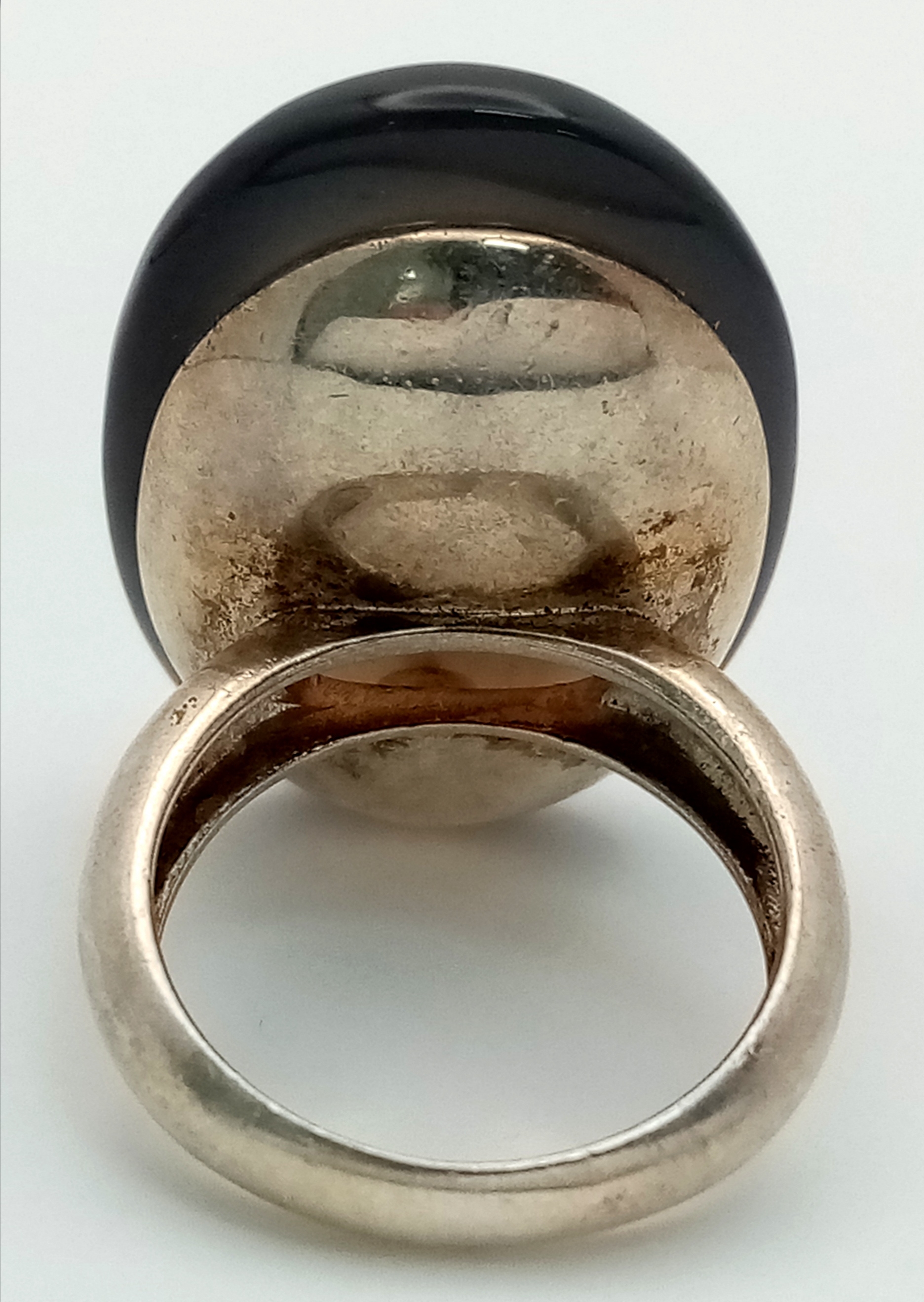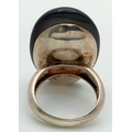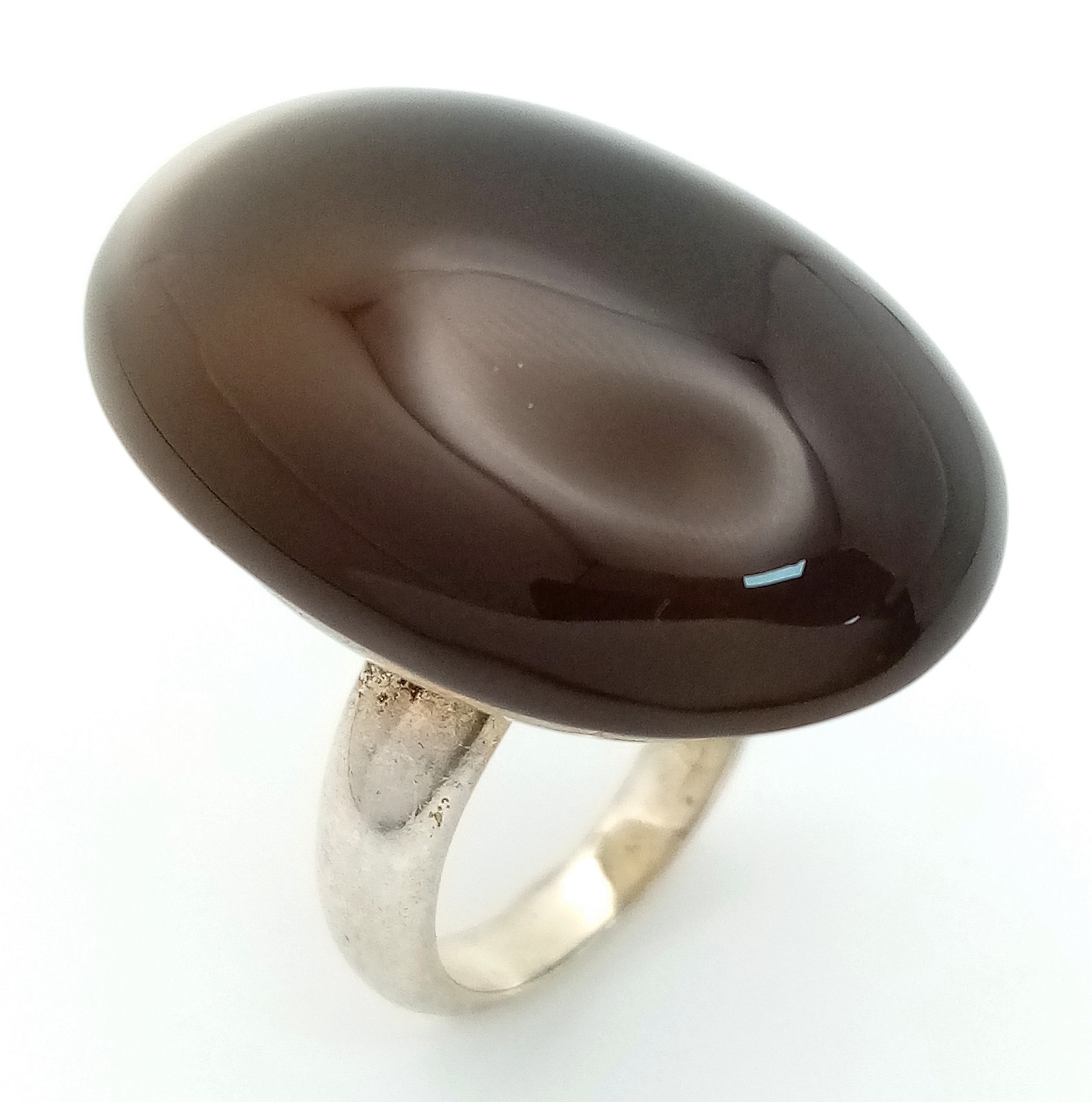 A Vintage Sterling Silver Blue Chalcedony Cabochon Statement Ring, Size K. The Ring is set with a impressive 3cm Long Blue Chalcedony. The Ring has a gross weight of 14.07 Grams.