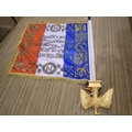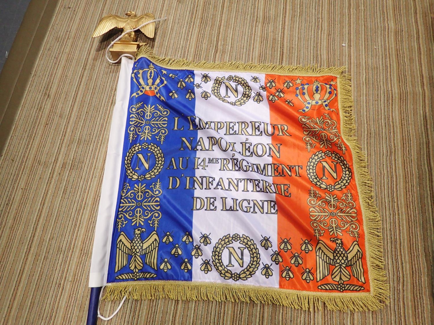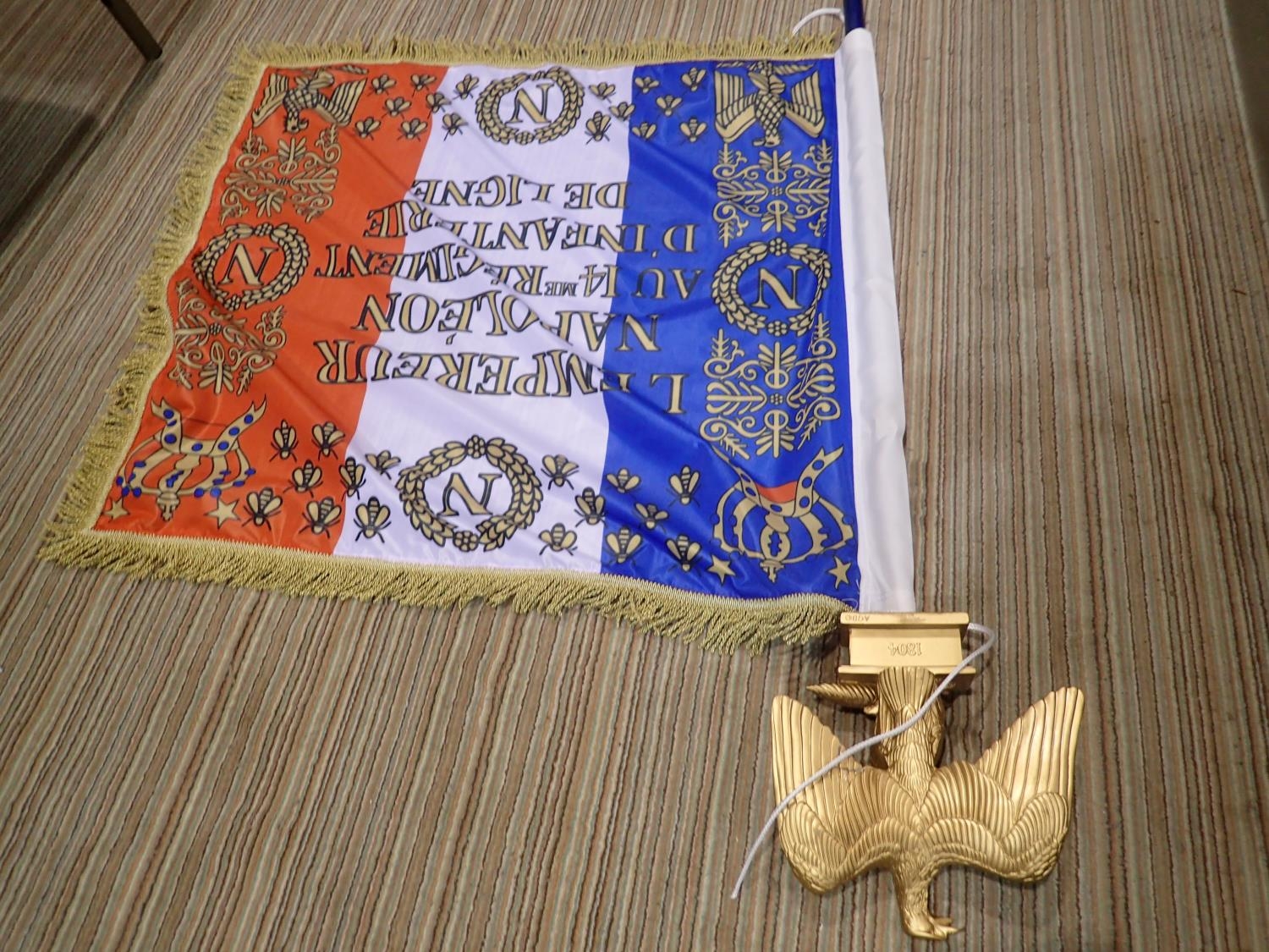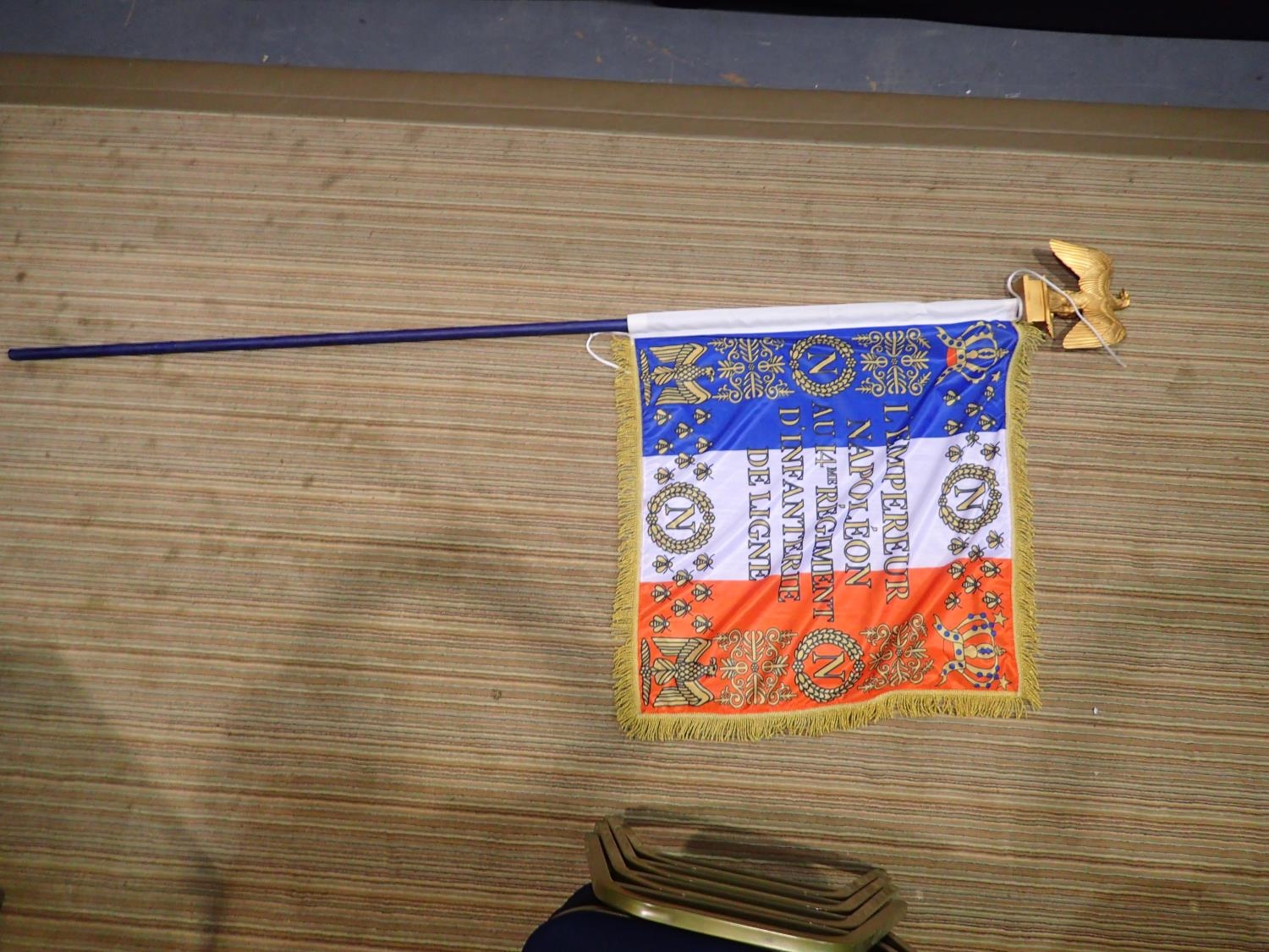 Replica Napoleonic Wars fringed flag on pole with golden eagle finial, used at the re-enactment parade at Waterloo 2015, 95 x 75 cm, Flag is single sided, The eagle is made of resin. Not available for in-house P&P