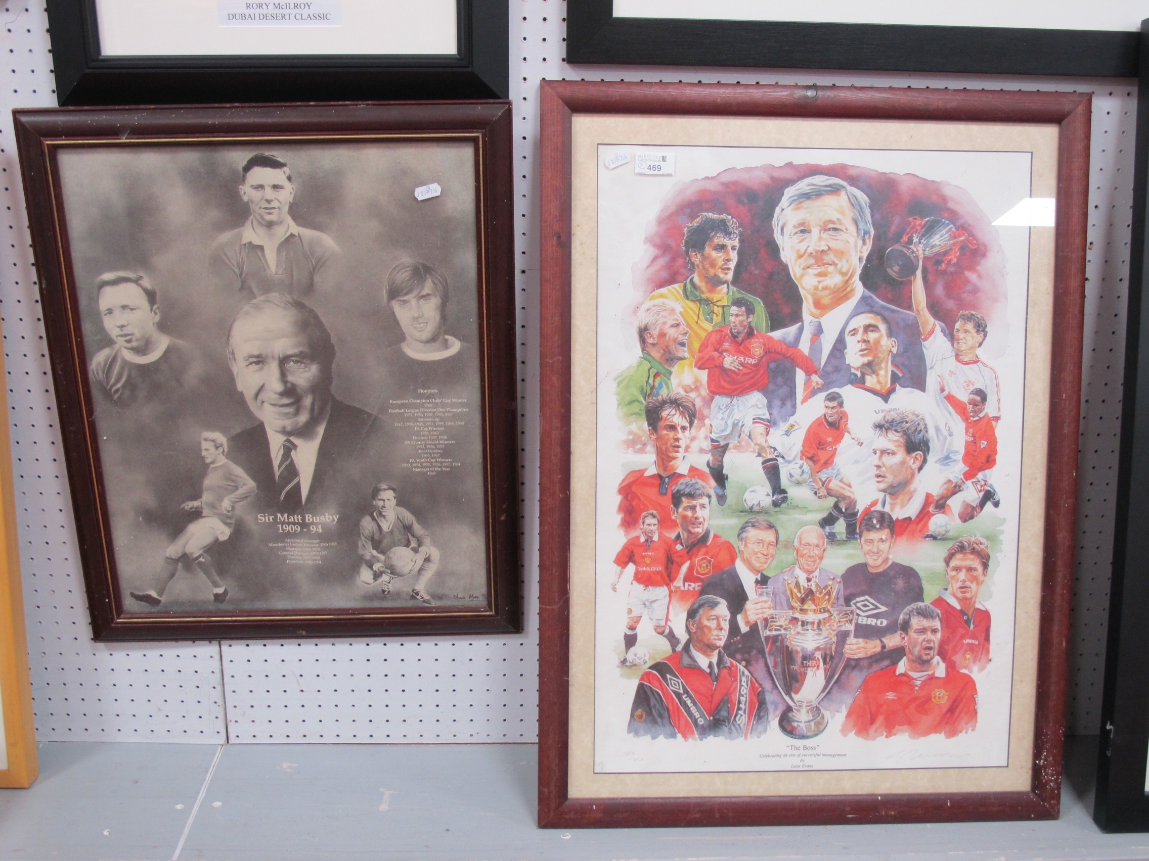 Manchester United Leon Evans, 'The Boss', limited edition colour print of 850, framed, overall 75 x 55cm, together with Matt Busby black & white print (2).