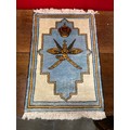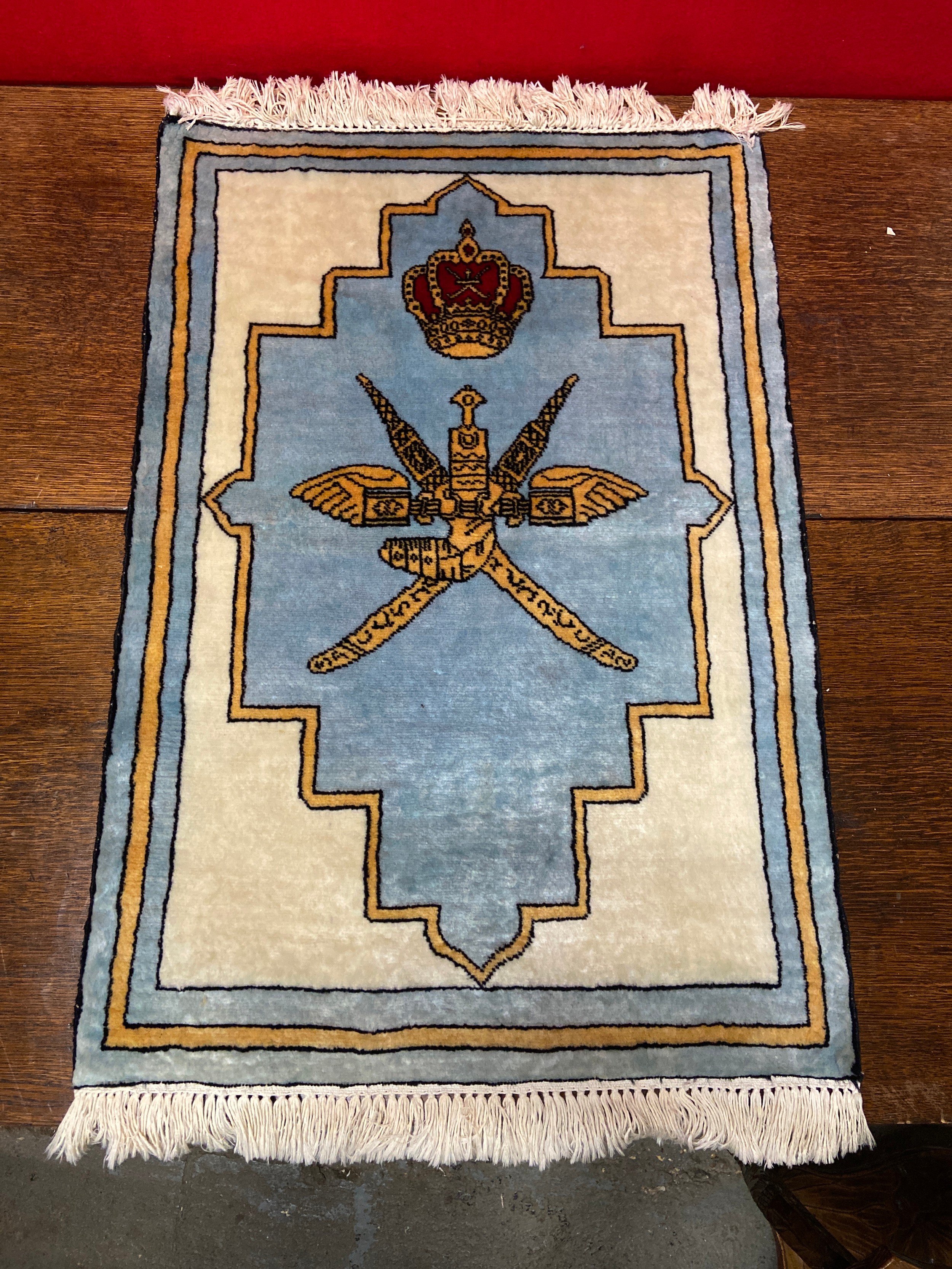 An Omani prayer rug with fringed ends, decorated with the national emblem of the Sultinate of Oman in pale blue, yellow and cream topped by a red crown.. Nicknamed "Khanjar Bo Sayfain" (Khanjar & two swords), the insignia was adopted in the 18thC as the badge of the Omani Royal Family, later becoming the national emblem.