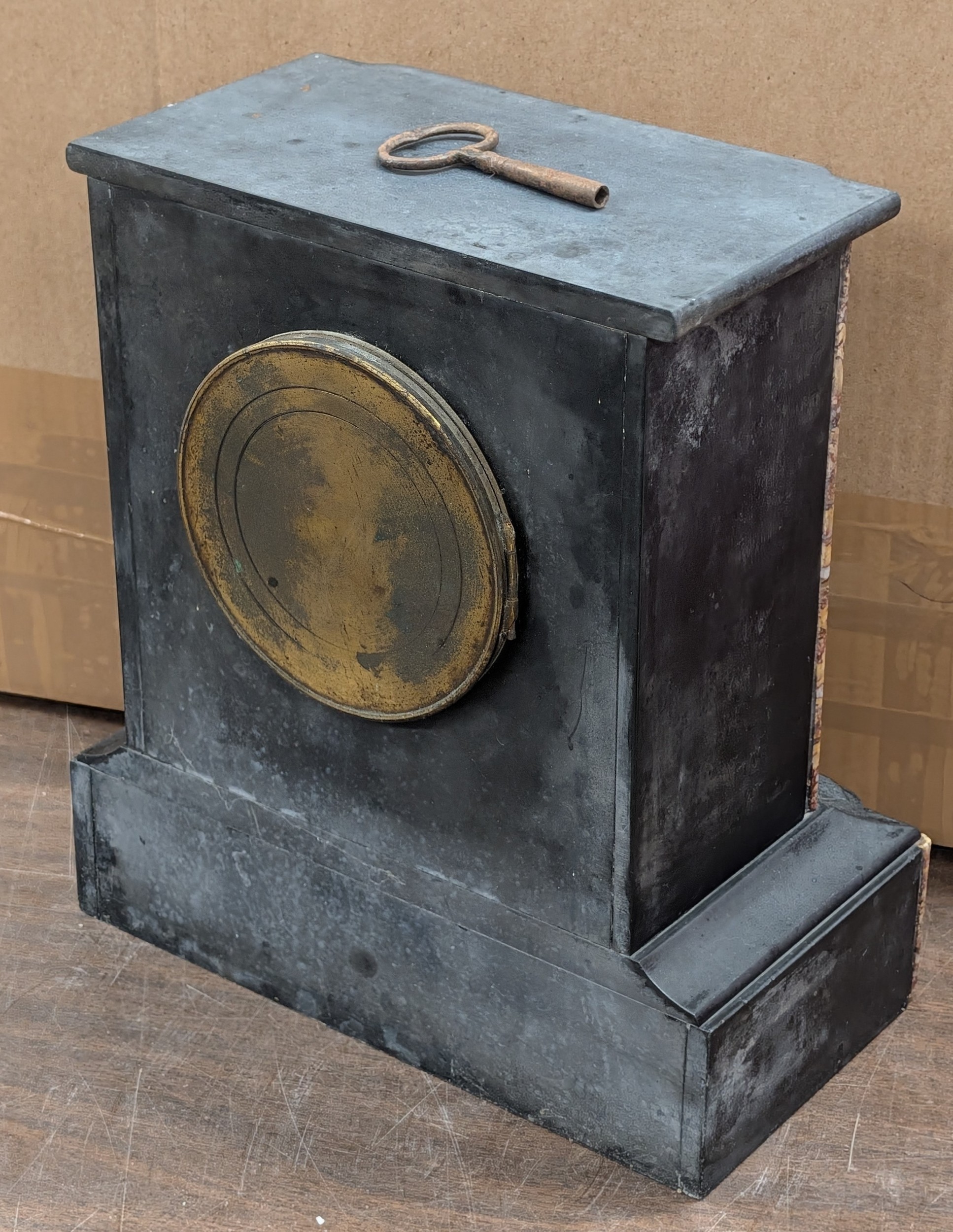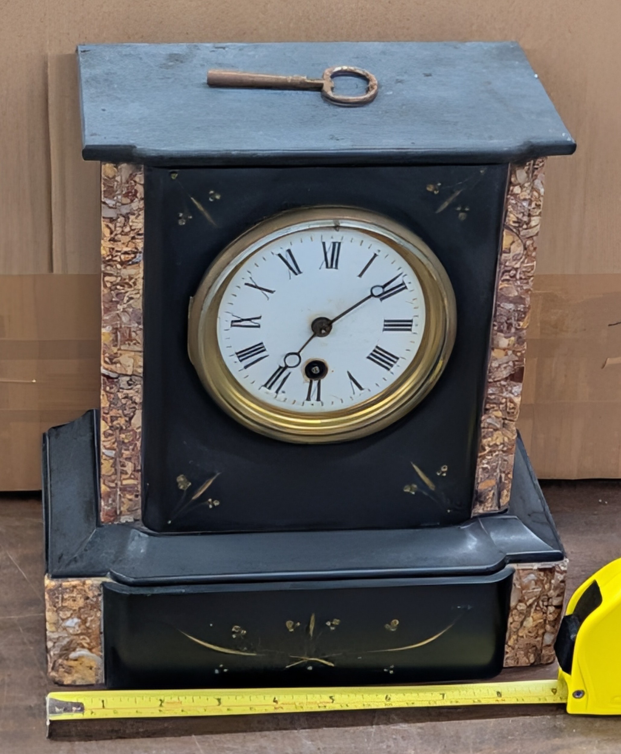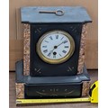 Late 19th Century French Style Black Granite and Variegated Marble Mantel Clock, With pendulum and key