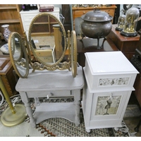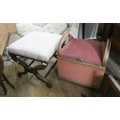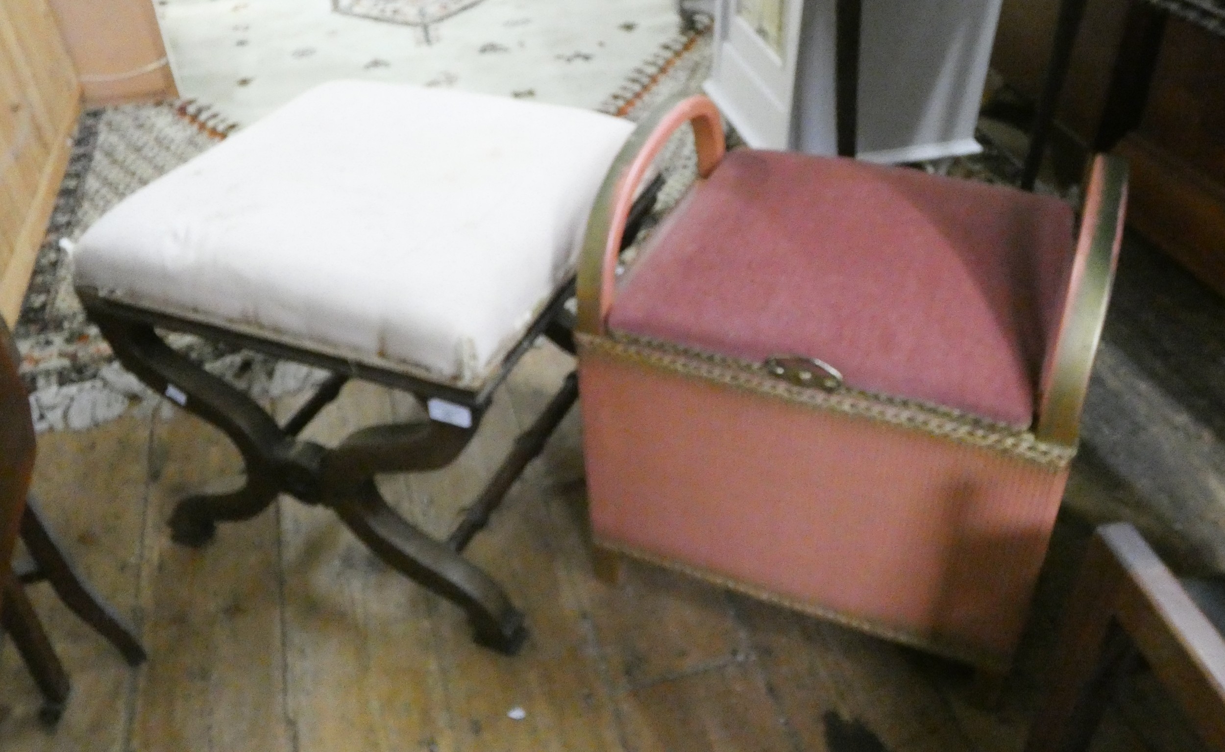 A mahogany cross framed stool and a cane linen basket stool