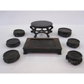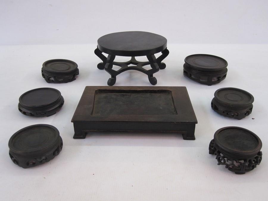 Quantity of Oriental hardwood stands and an oval lidded box with hammered decoration