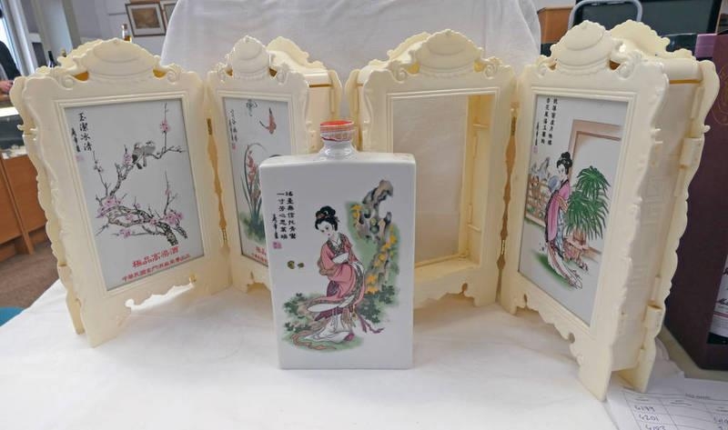 CHINESE BAIJIU IN PORCELAIN BOTTLES 1 OF 4 UNOPENED IN PLASTIC HOLDER IN THE SHAPE OF A SCREEN 500ML 57%. VOL, 10 ML 59% VOL
