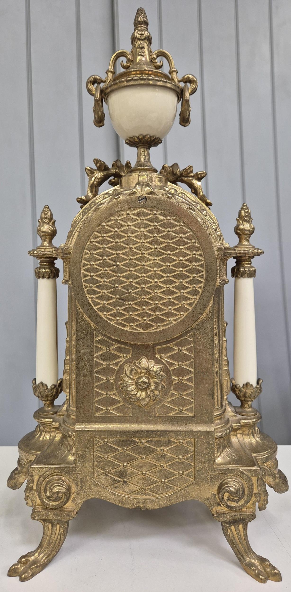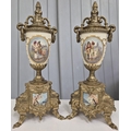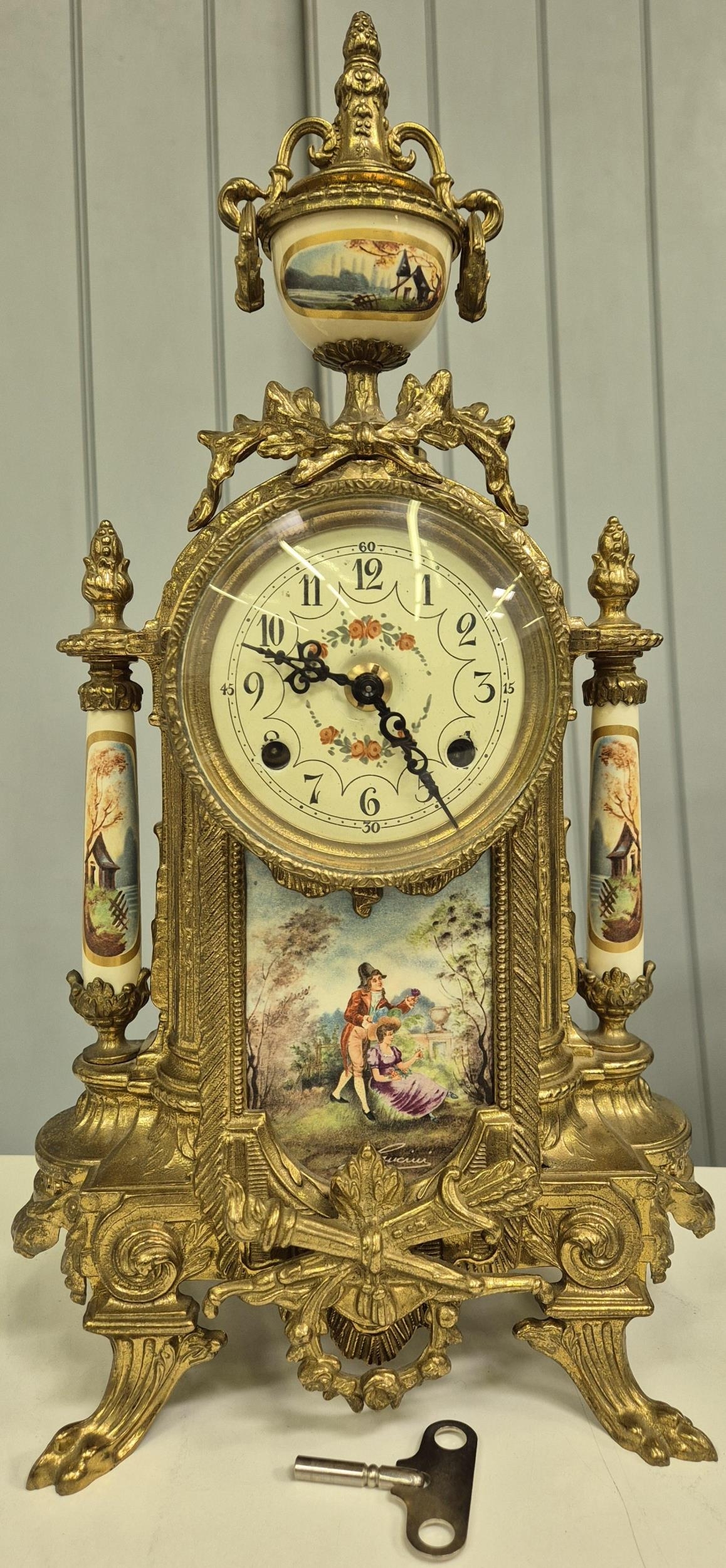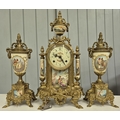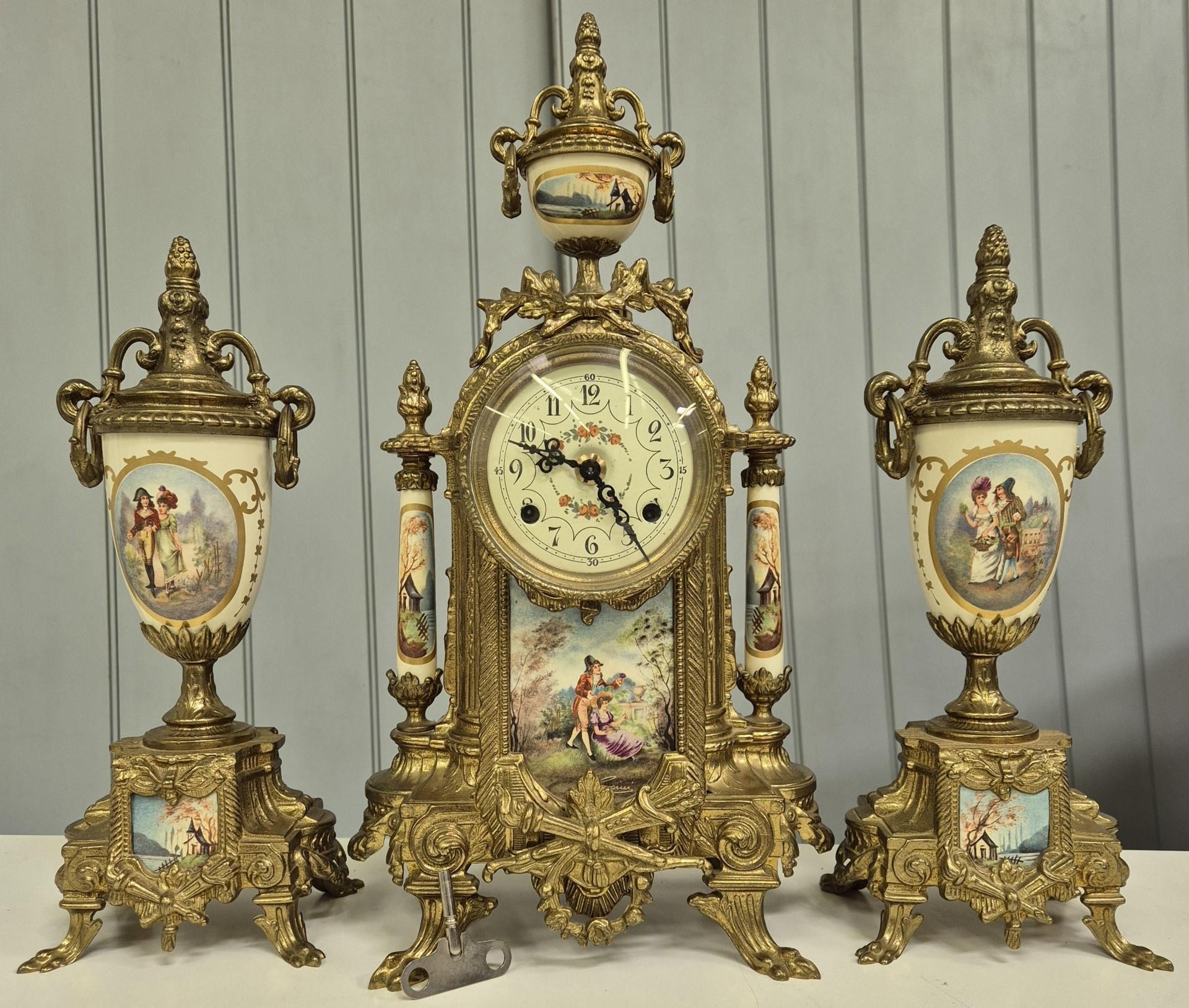 A late 20th century clock garniture, by Franz Hermle Lancini. Brass cased, with ceramic panelling, dial adorned with floral detail. Key present. Clock dimensions(cm) H41, W21, D13.