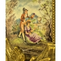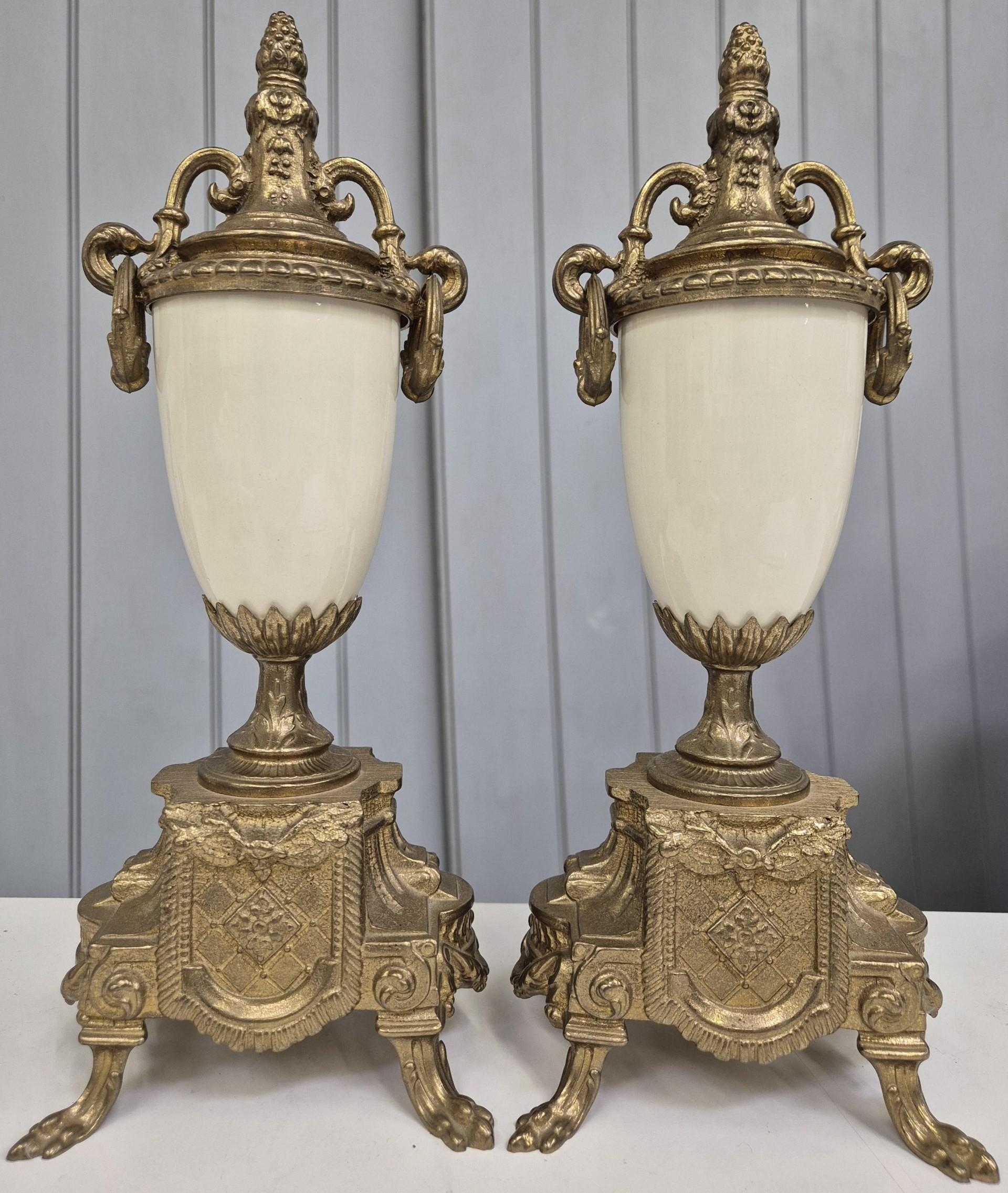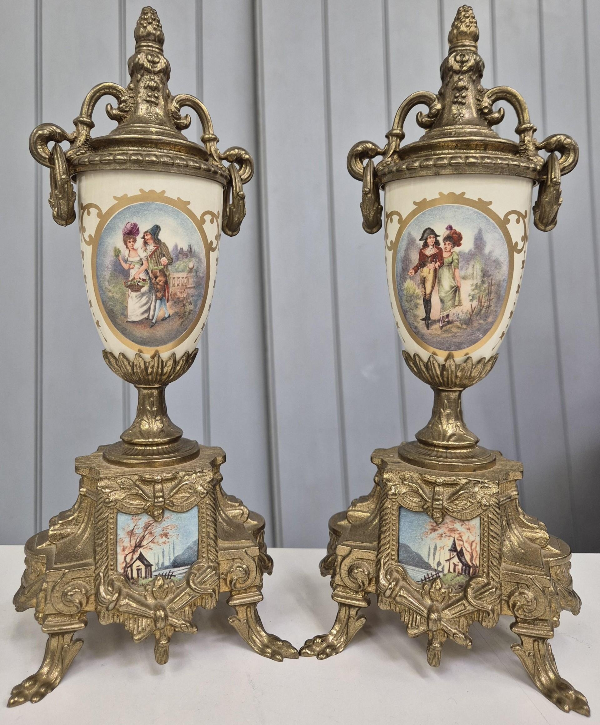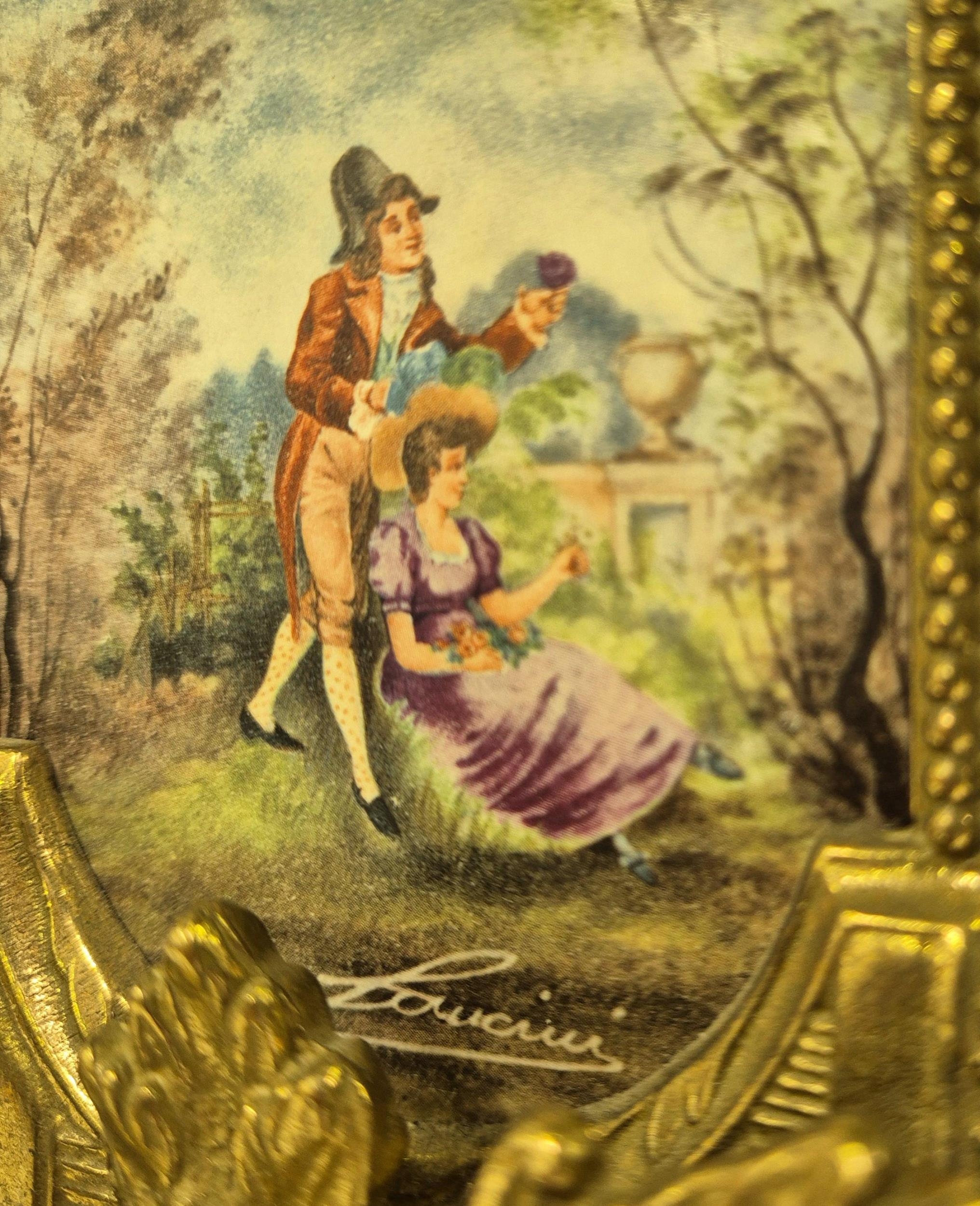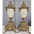 A late 20th century clock garniture, by Franz Hermle Lancini. Brass cased, with ceramic panelling, dial adorned with floral detail. Key present. Clock dimensions(cm) H41, W21, D13.
