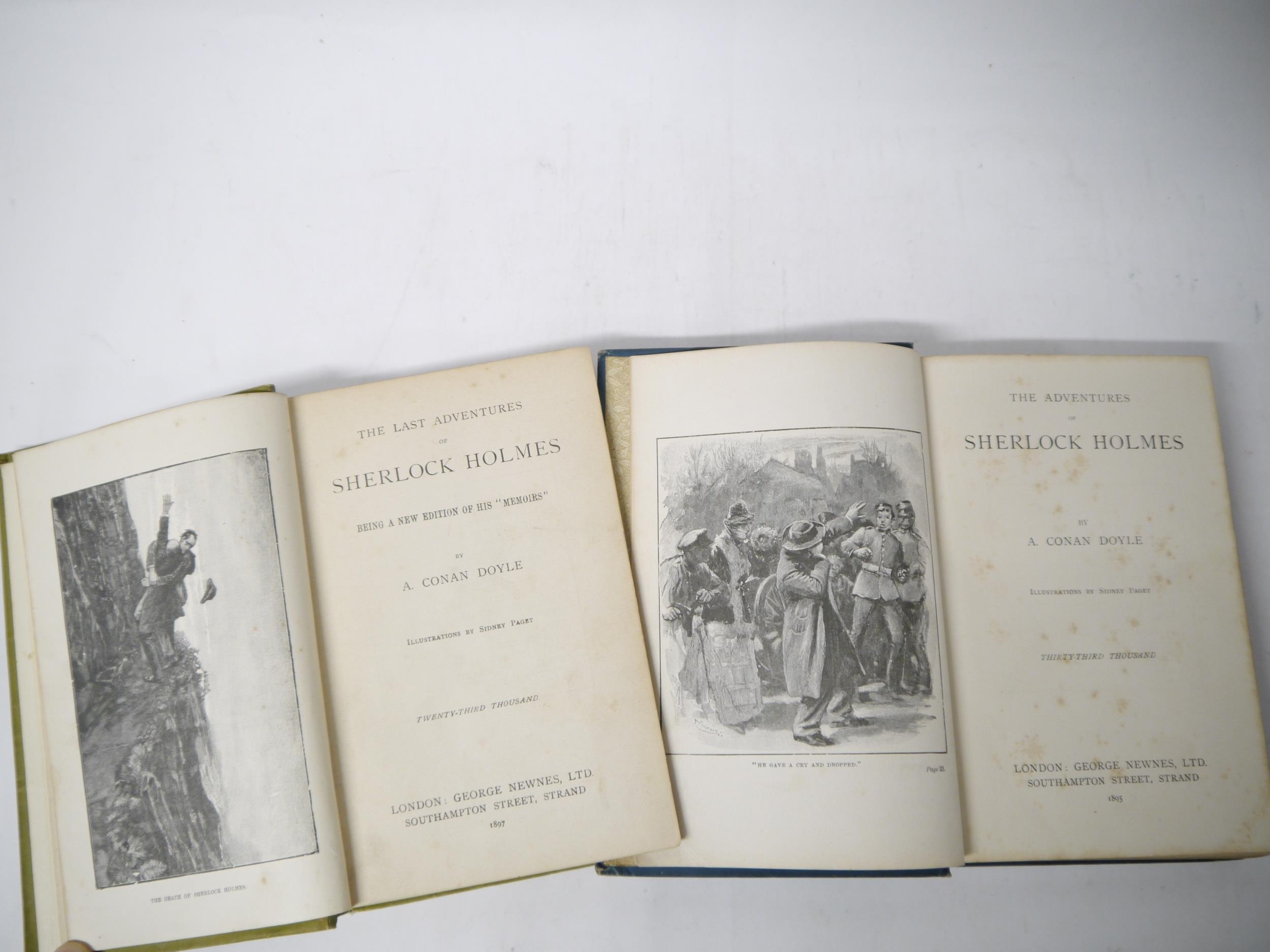 Arthur Conan Doyle, 2 titles: 'The Adventures of Sherlock Holmes', ill. Signey Paget, London, George Newnes, 1895, 33rd thousand, with uncorrected text "cucaine" for "Cocaine" on page 133, b/w frontis + full page plates as called for, original cloth gilt, 'The Last Adventures of Sherlock Holmes', L, Newnes, 1897, 2rd thousand, full page b/w plates by Sidney Paget as called for, recased retaining original cloth gilt (2) (R) £100 (E) £100-150
