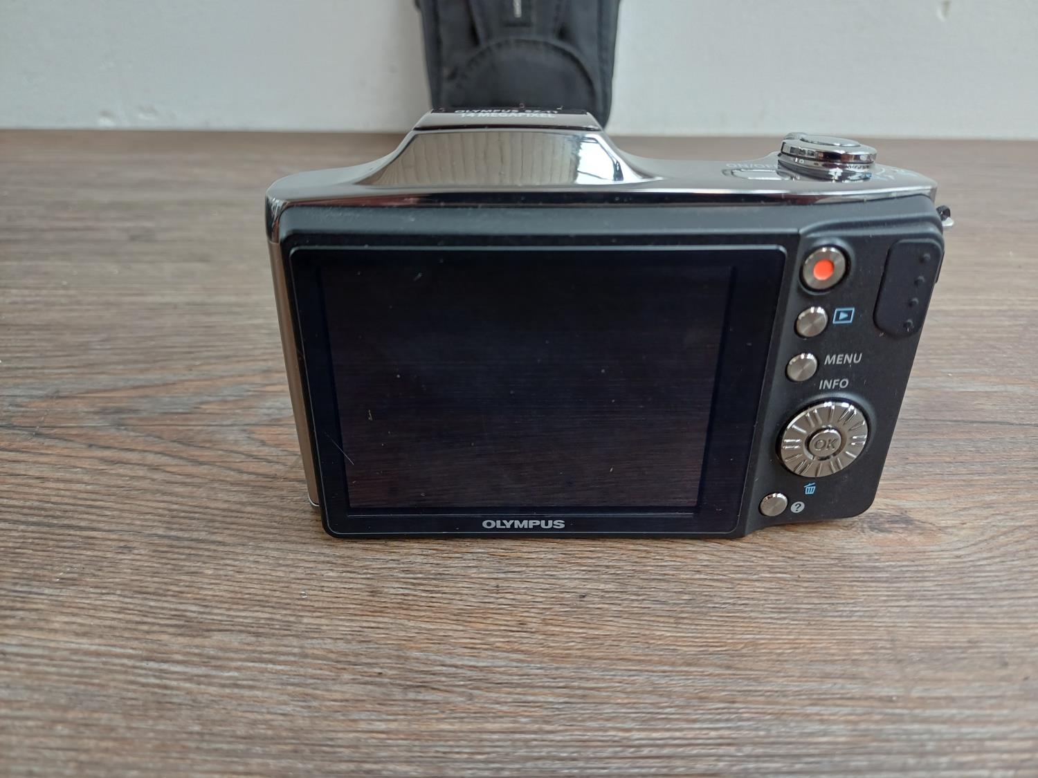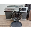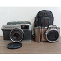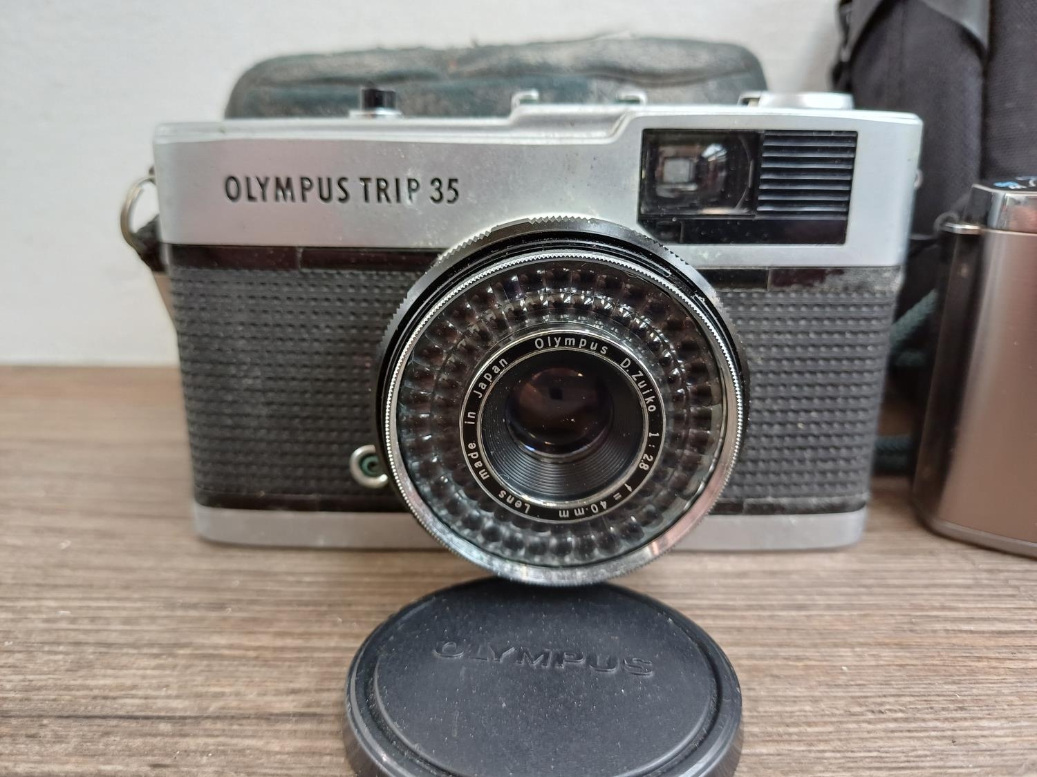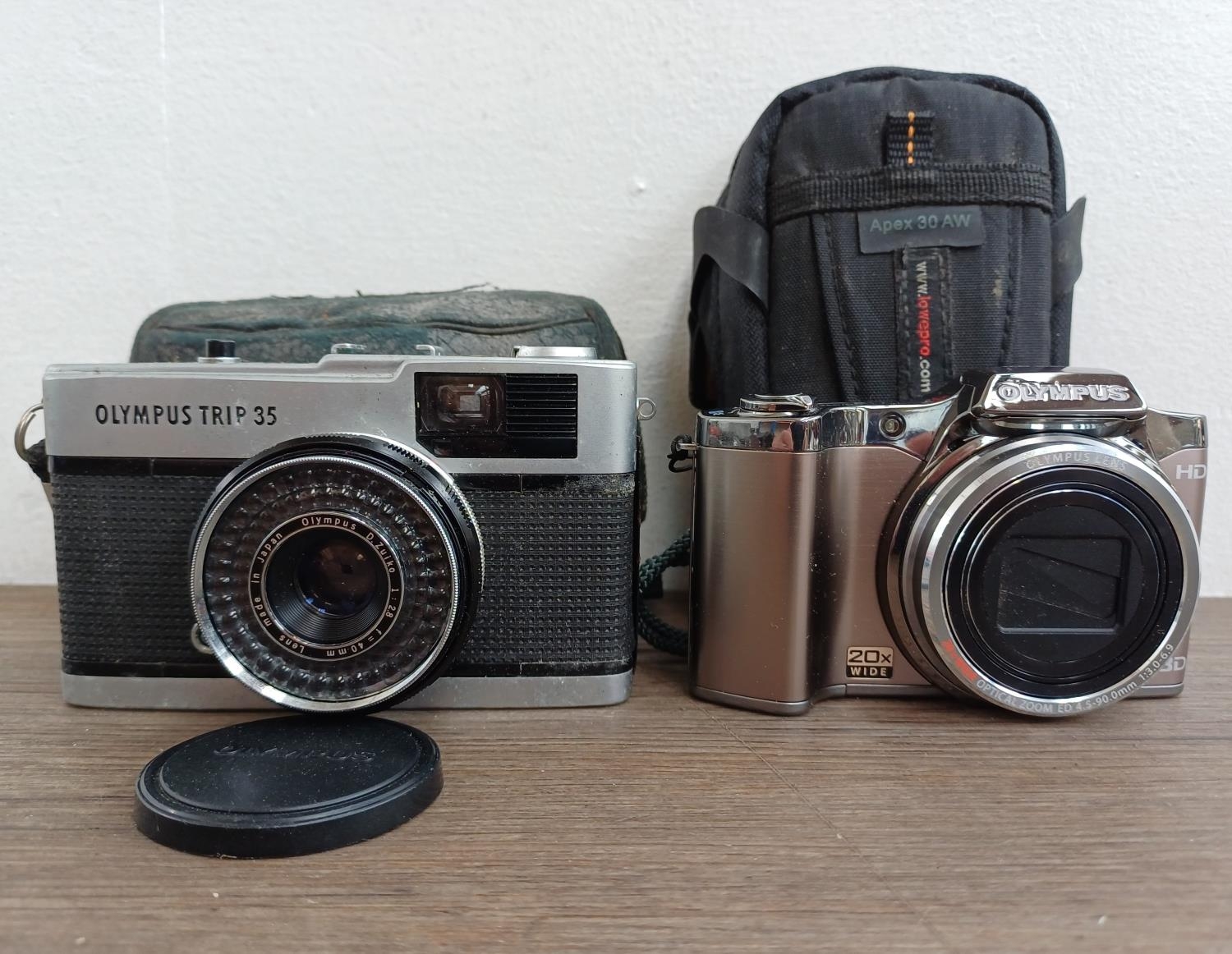 Two cased compact cameras, one Olympus Trip 35 fully-automatic 35mm with lens cap and wrist strap and one Olympus SZ-11 14mp CCD sensor digital