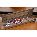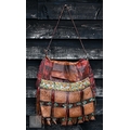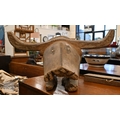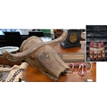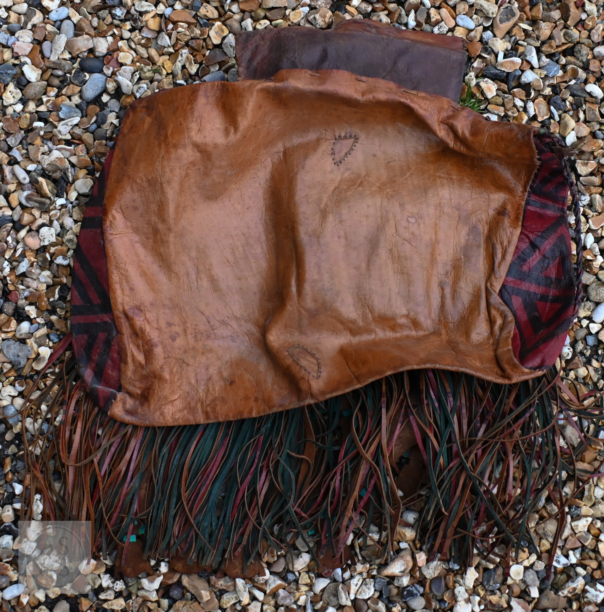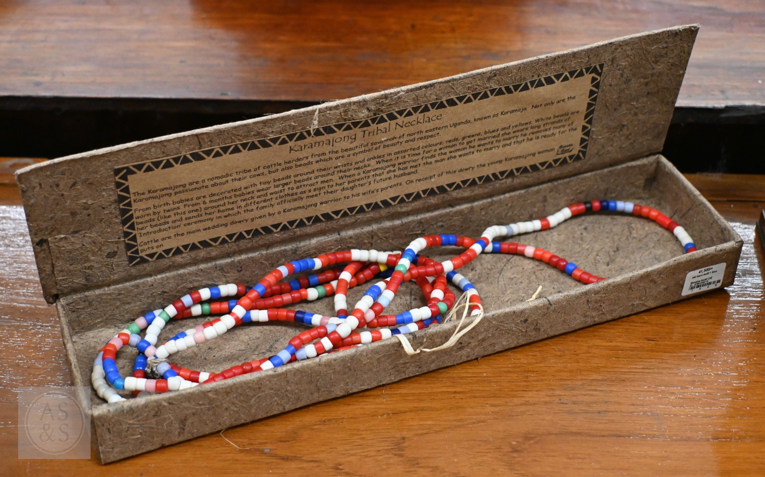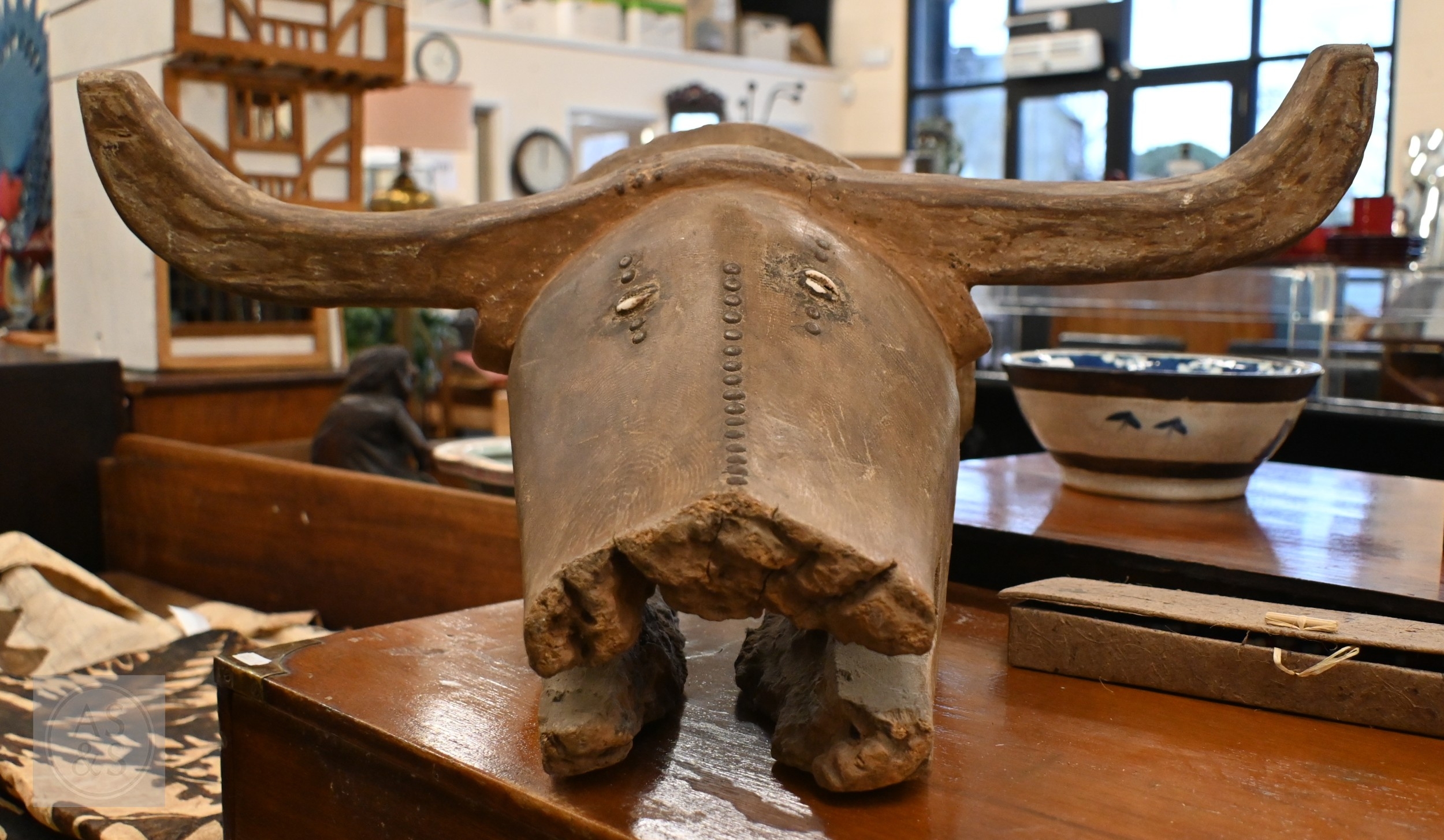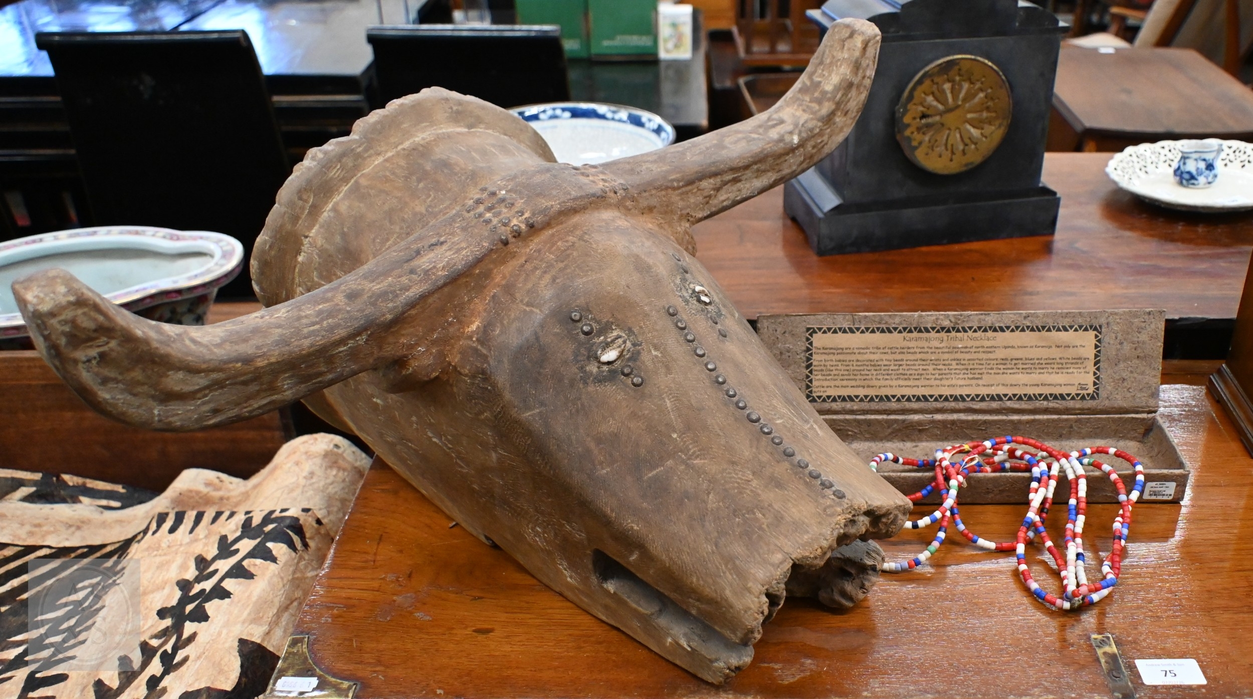 An African carved wood cow's head inset with shells and metal studs, 61 cm wide, to/w a fringed leather and silk bag and a Karamajong tribal bead necklace (3)
