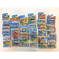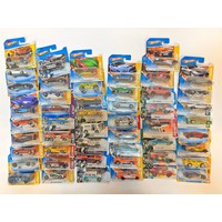 A group of 50 Hot Wheels carded diecast model vehicles comprising 1) Hot Wheels 67 Chevelle SS 396, 2) Hot Wheels C6 Corvette, 3) Hot Wheels 2010 Ford Mustang GT, 4) Hot Wheels Boss Hoss Motorcycle, 5) Hot Wheels 68 Dodge Dart , plus others as shown. All appear excellent in original boxes.