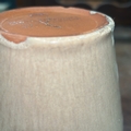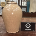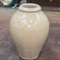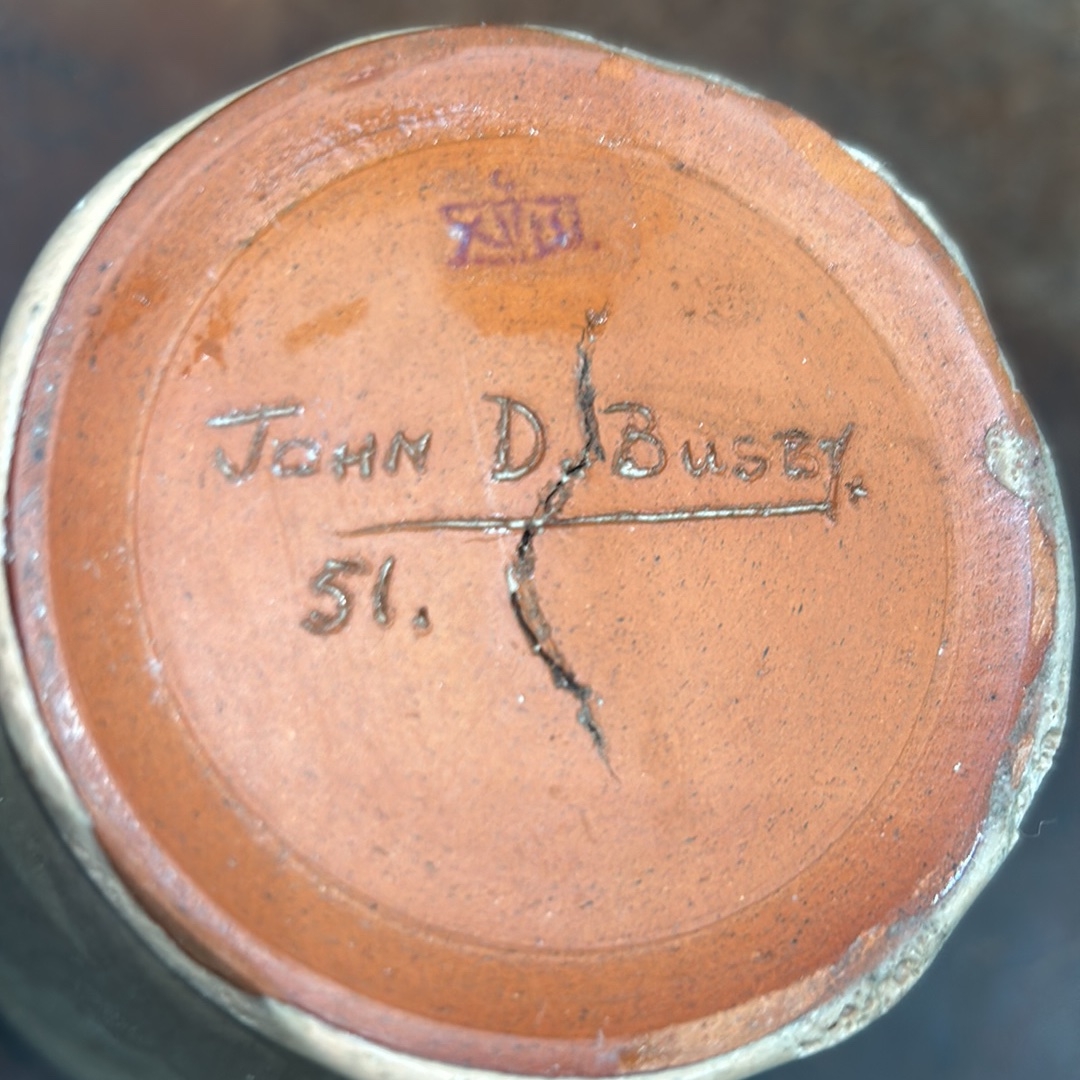 Small ovoid stoneware vase with narrow collar rim, pale beige gloss glaze, crowned monogram stamp and incised signature “John D. Busby / 51” to base.