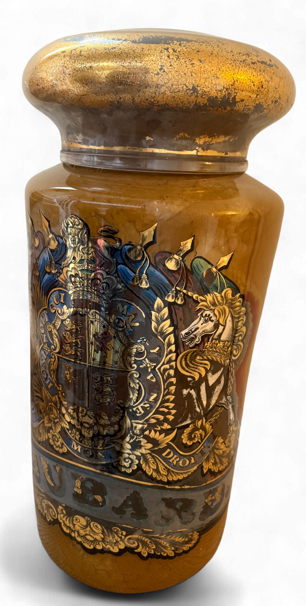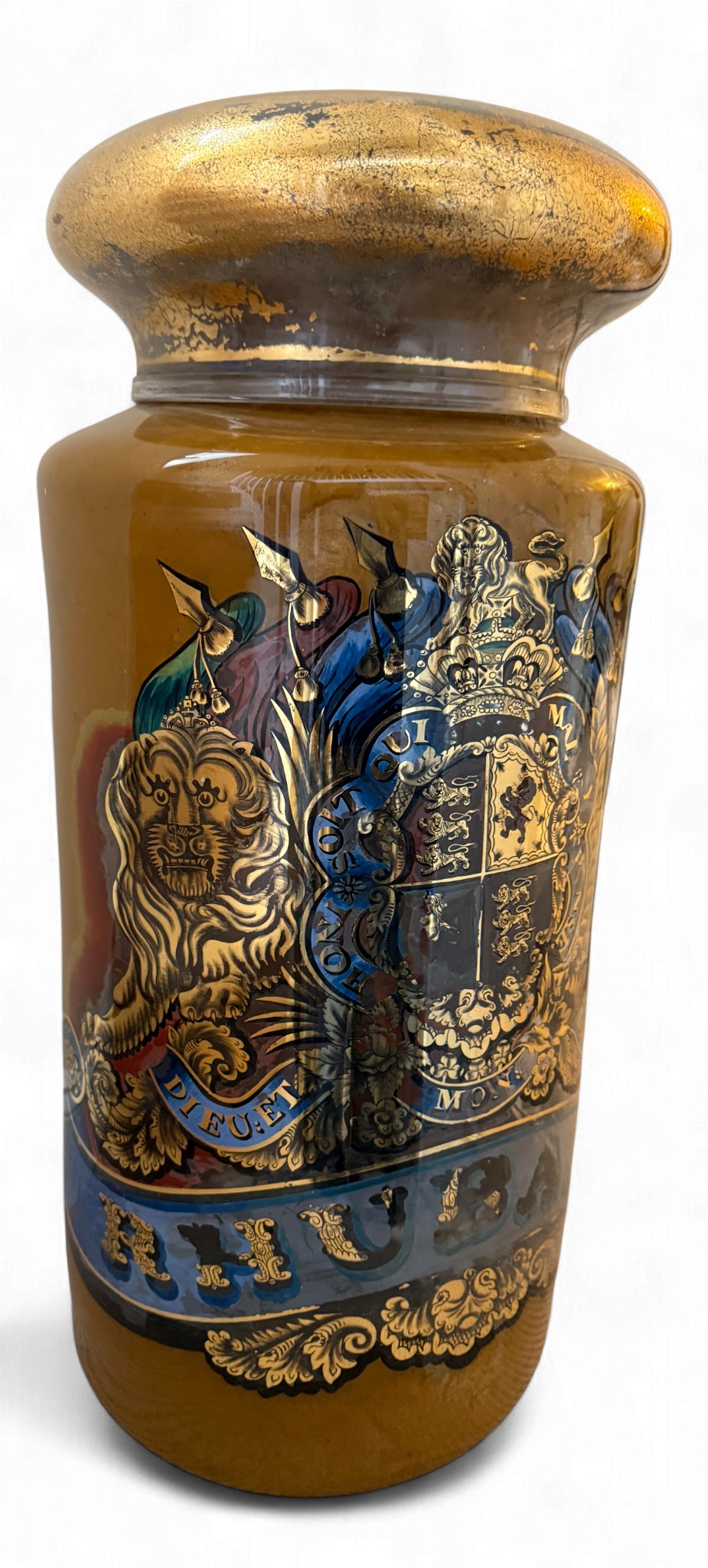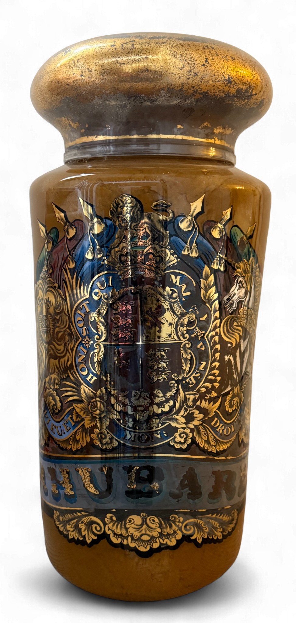 A very large painted and emblazoned glass Rhubarb apothecary jar and cover. 78cm h, lid approx. 37cm d, neck 22.5cm d.