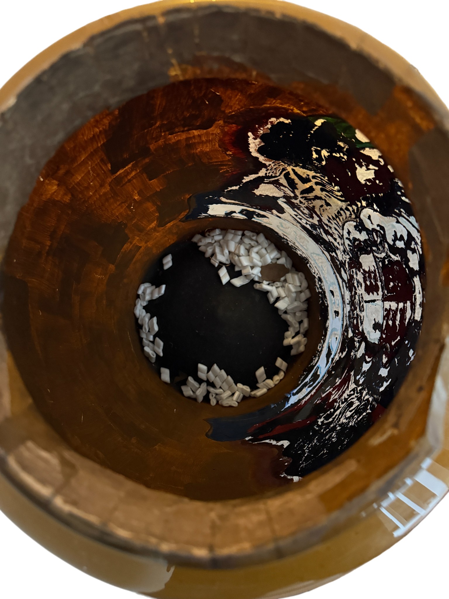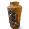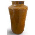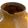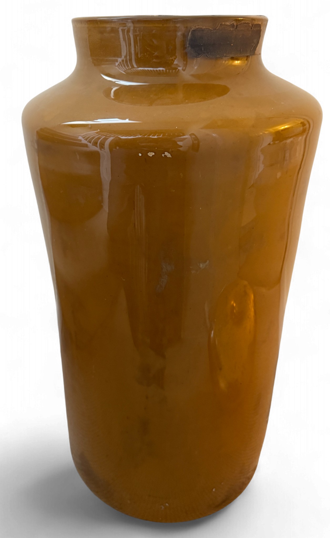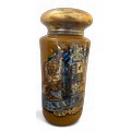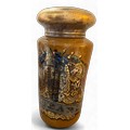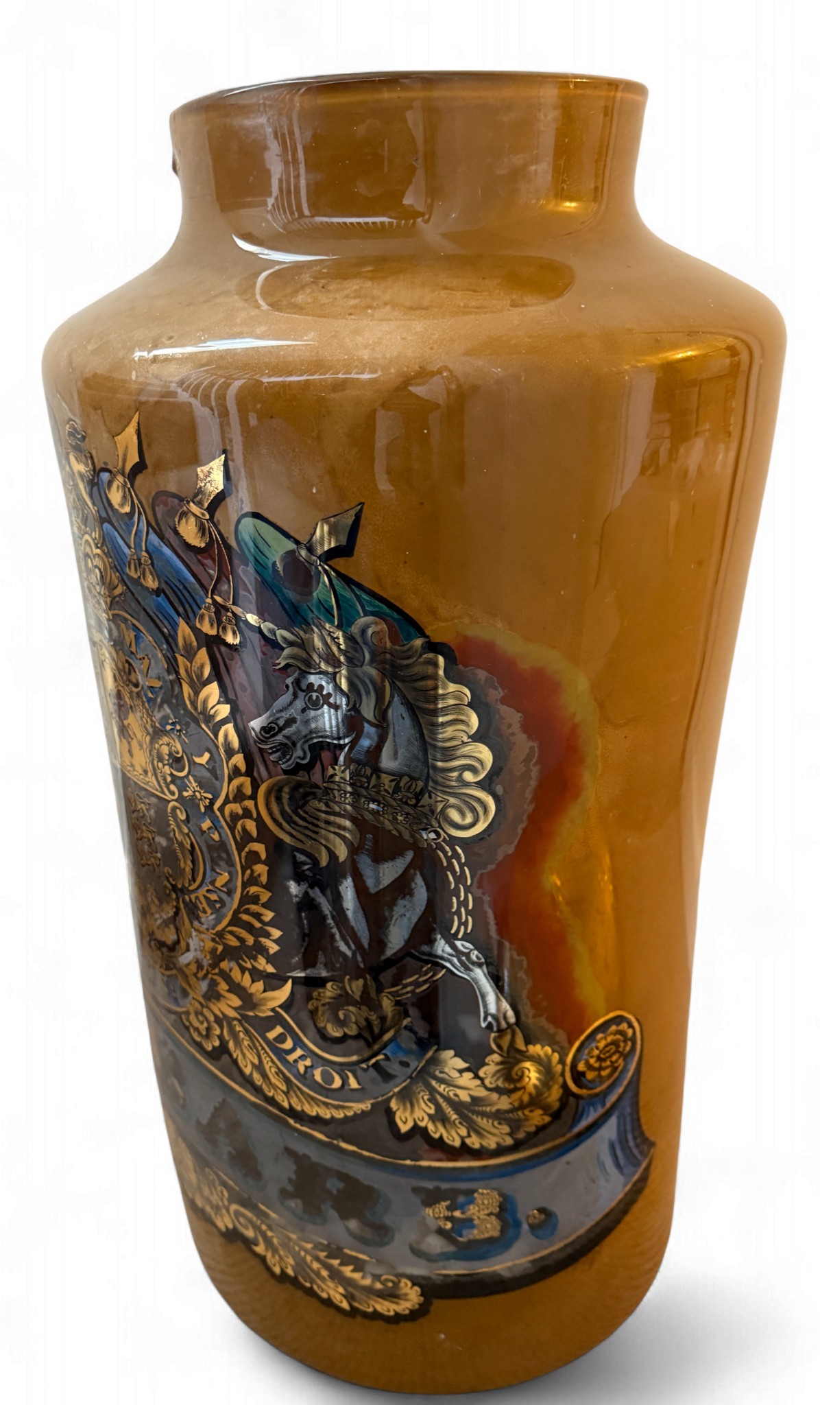 A very large painted and emblazoned glass Rhubarb apothecary jar and cover. 78cm h, lid approx. 37cm d, neck 22.5cm d.