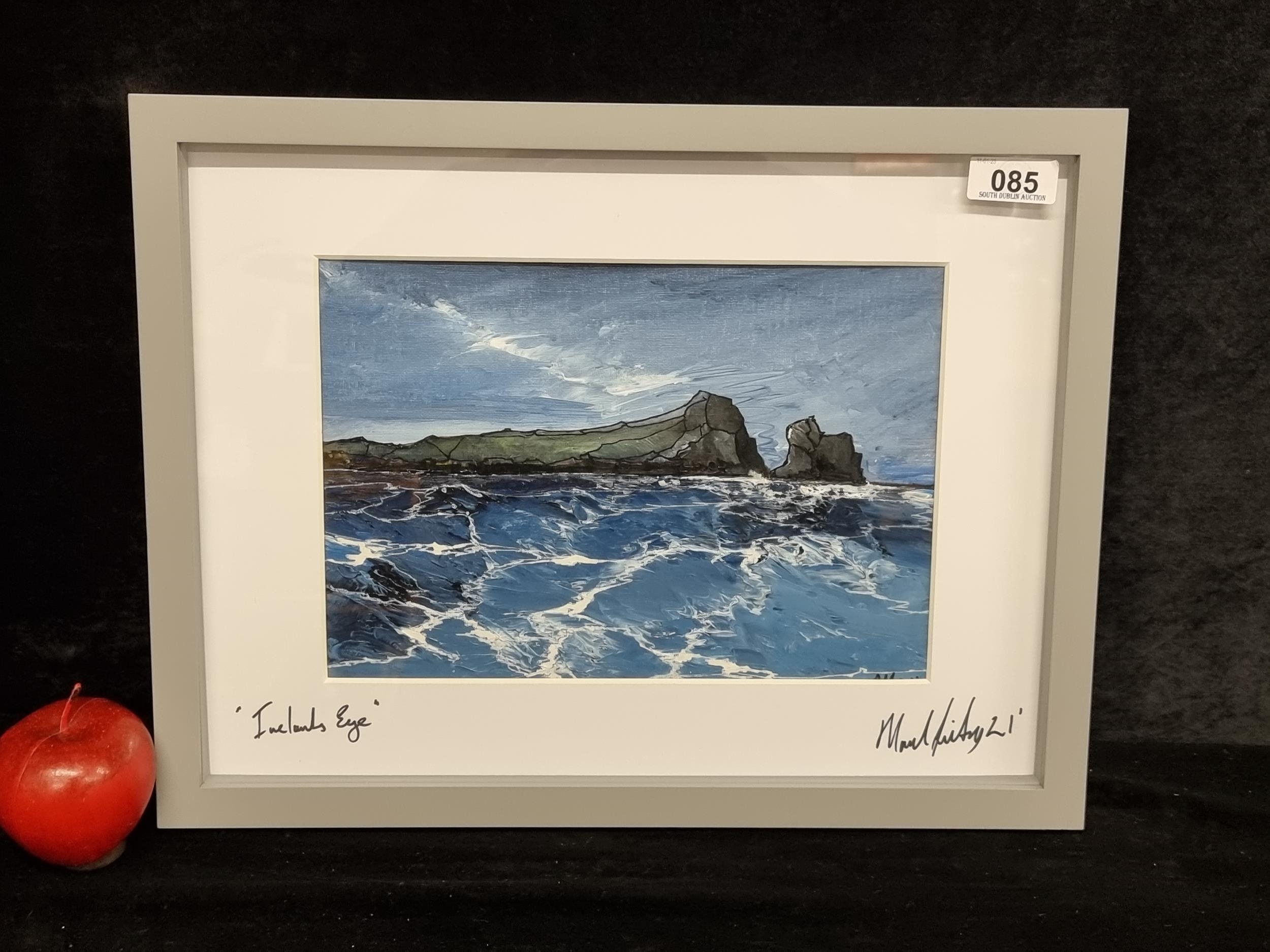 A very atmospheric, original oil on-canvas painting by the Irish artist Marcel Lindsay, titled "Ireland's Eye". The artist has skillfully captured Ireland's uninhabited island off the coast of Dublin in deep shades of navy blue and charcoal grey. Signed bottom right, dated to 2021 and housed in a high quality box frame.