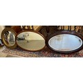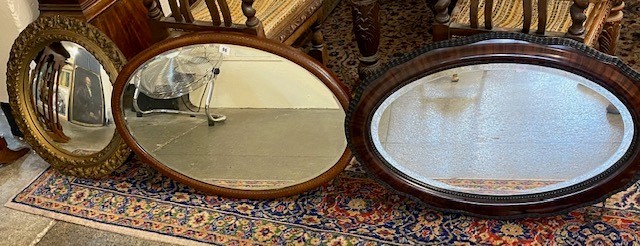 An Edwardian oval bevelled wall mirror in a mahogany and inlaid frame - 21in. x 31in., an oval bevelled wall mirror in a mahogany finished frame - 22 1/2in. x 33in. and a convex wall mirror in a gilt decorated frame - 21 1/2in. dia.