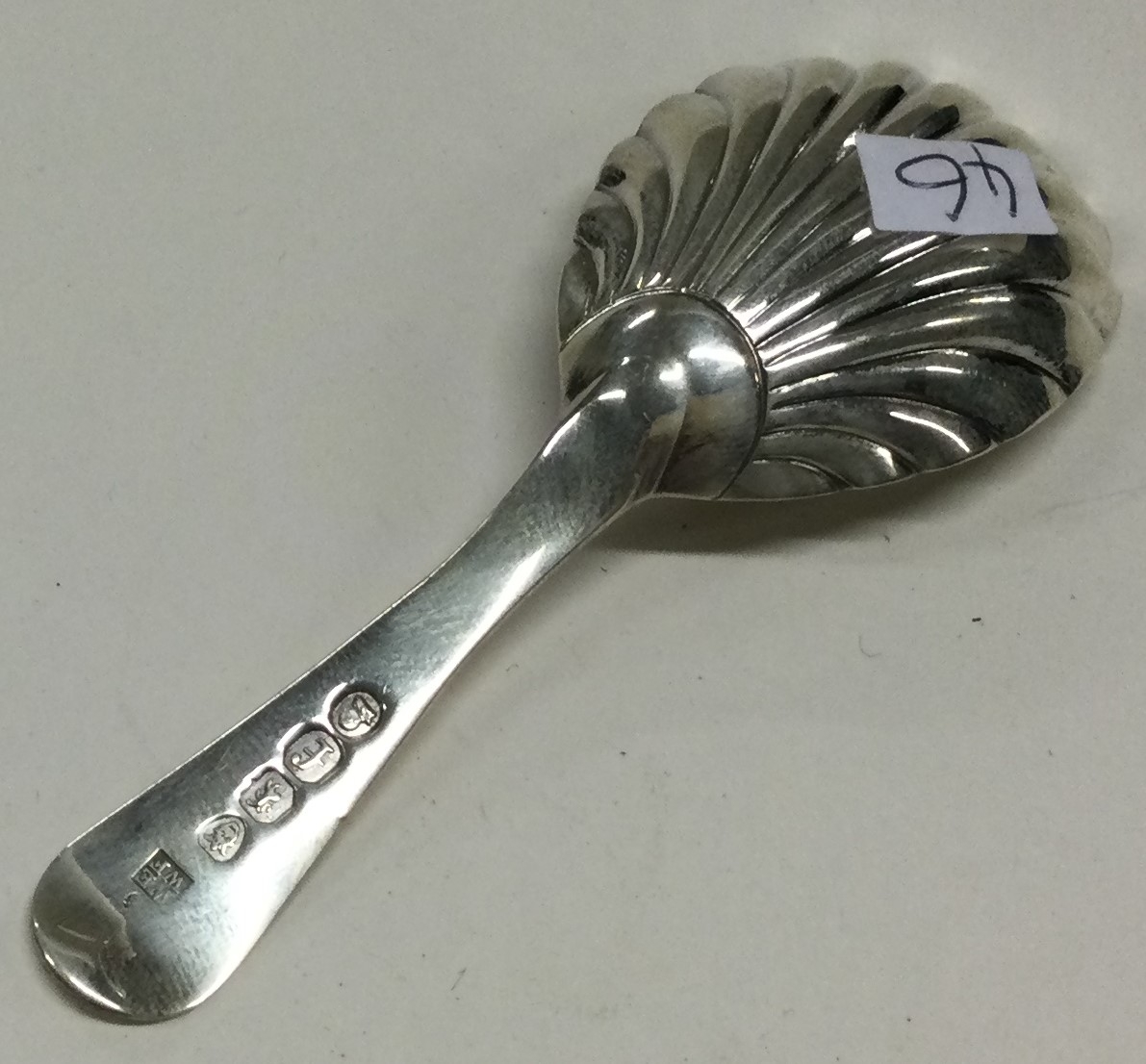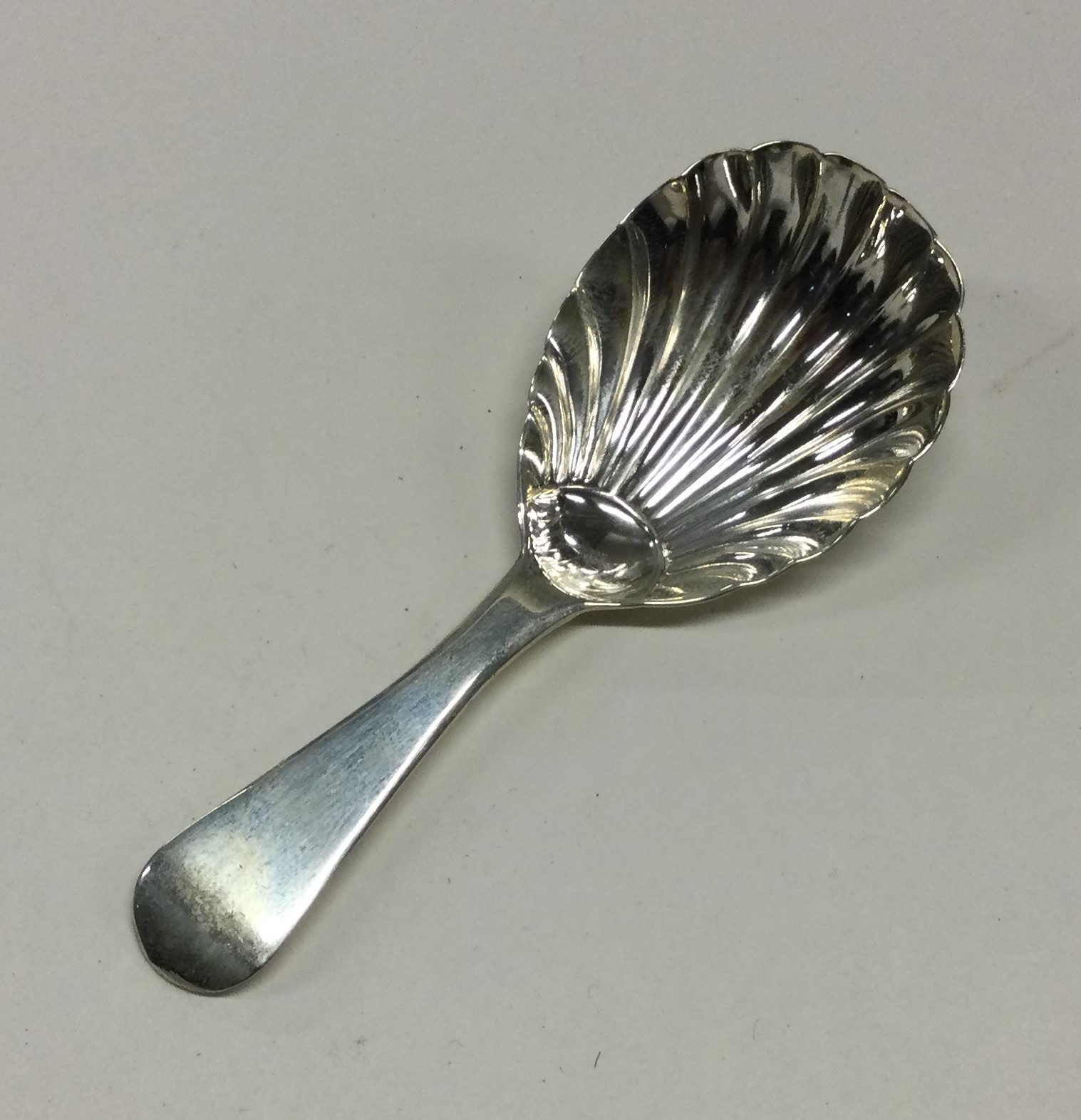 A George III silver caddy spoon with fluted bowl. London 1781. By William Eley & William Fearn. Approx. 12 grams. Est. £50 - £80.