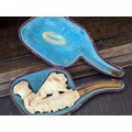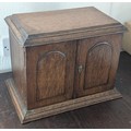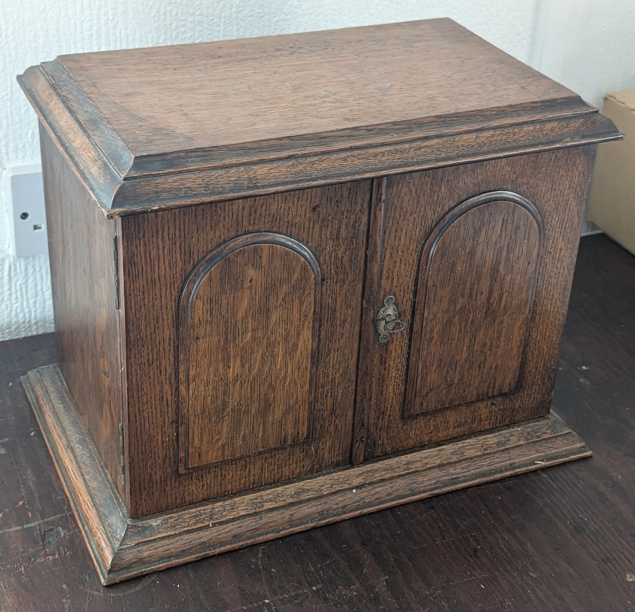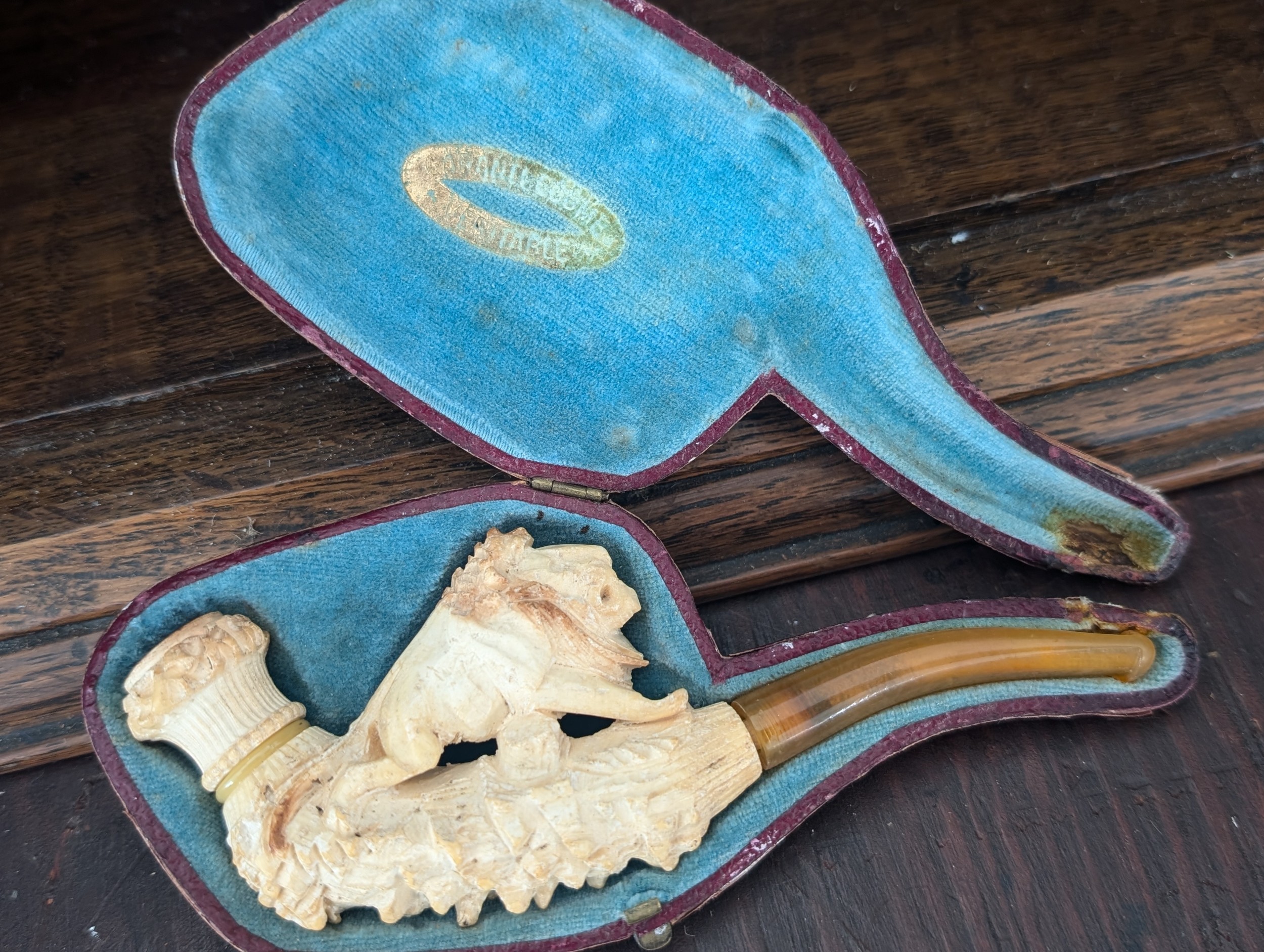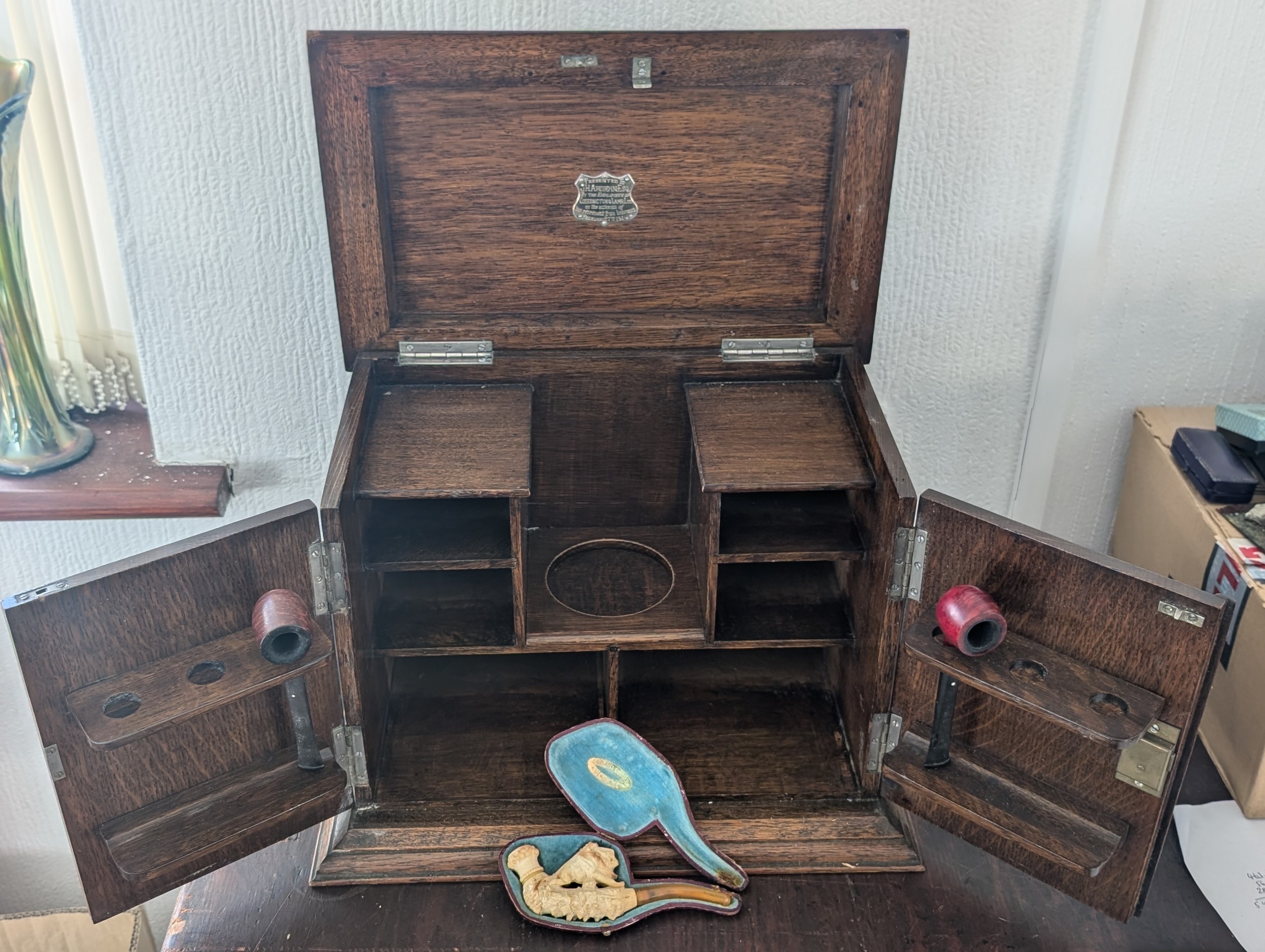 16 x 11 x 12" Early 20th Century English Oak Smokers Cabinet (Inscribed retirement presentation plaque on underside of lid) with a Group of Three Pipes Including Meerschaum In Case & Two Dunhill