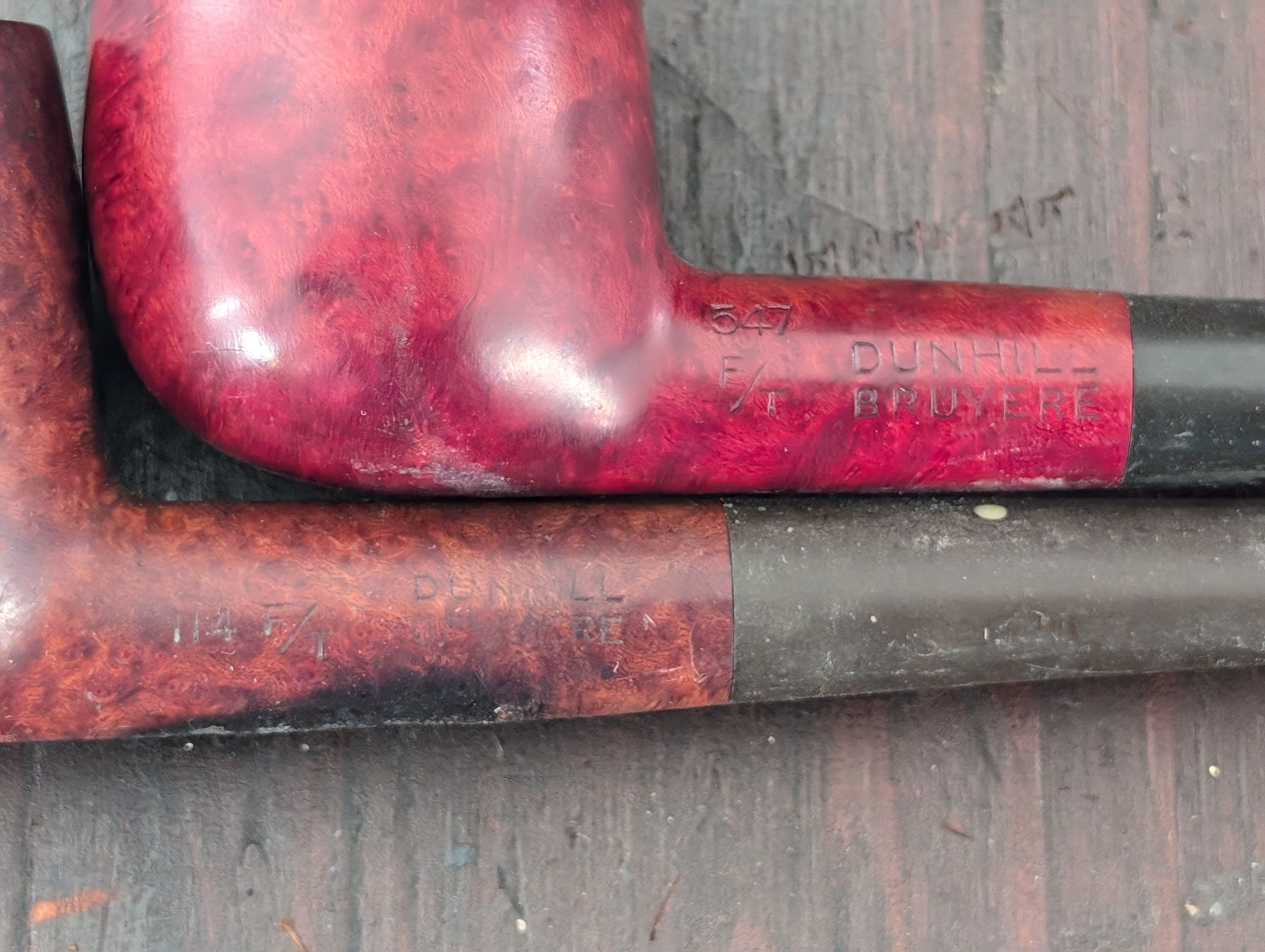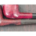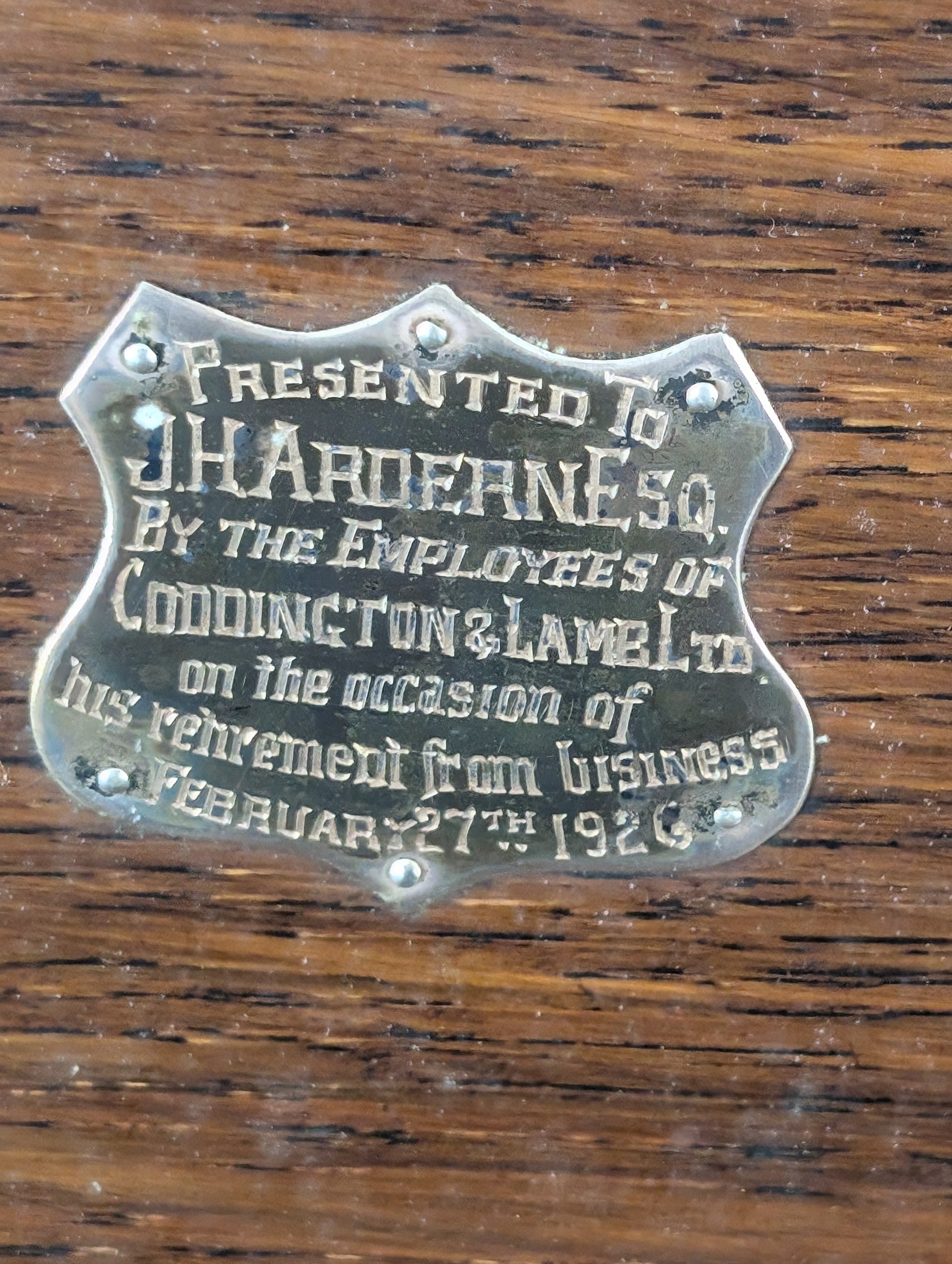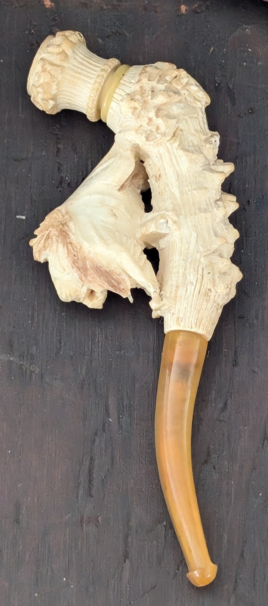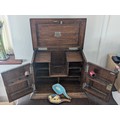 16 x 11 x 12" Early 20th Century English Oak Smokers Cabinet (Inscribed retirement presentation plaque on underside of lid) with a Group of Three Pipes Including Meerschaum In Case & Two Dunhill
