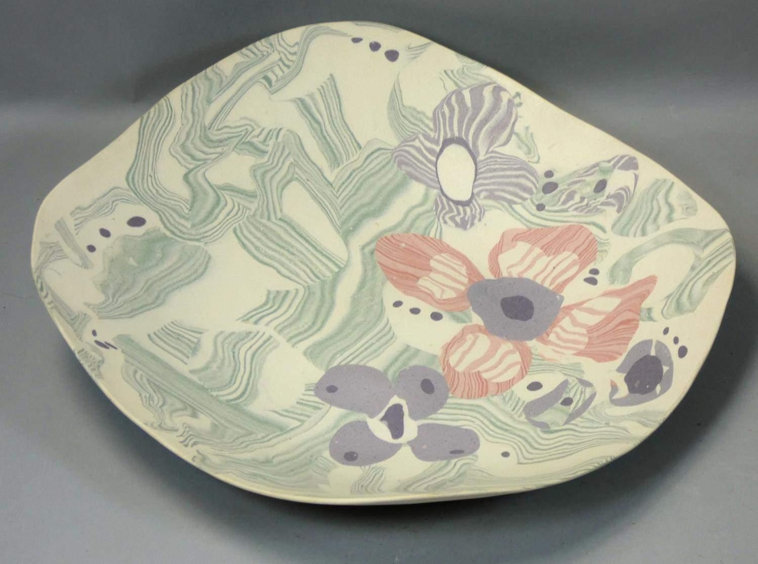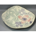 Margery Clinton, a stoneware dish of irregular square form, painted with flowers and abstract patterns, no visible makers mark, diameter 32cm.