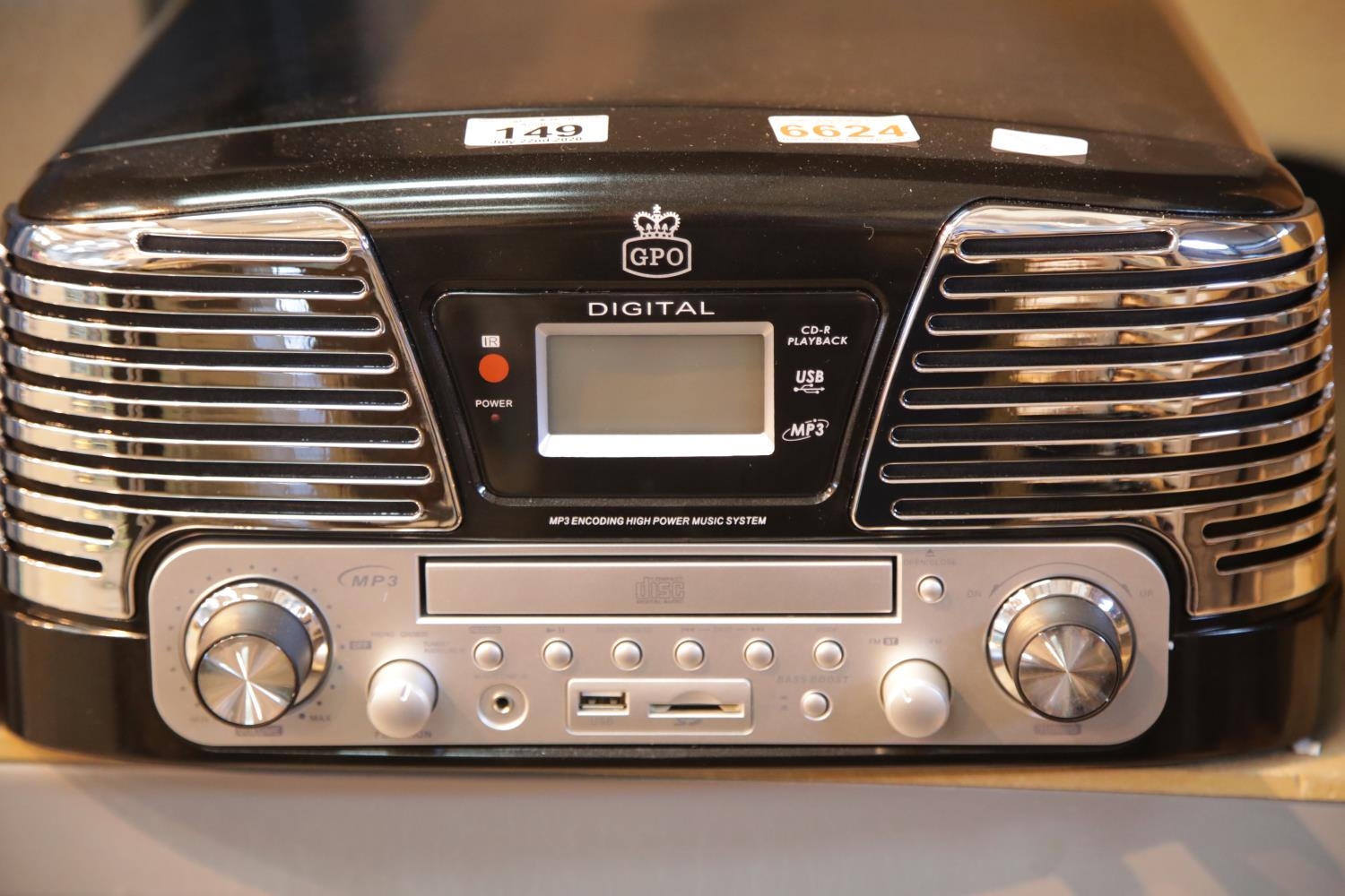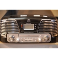 Black GPO retro Memphis music centre - 3 speed turntable 33/45/78 MP3/USB player, FM radio with manual and remote. P&P Group 3 (£25+VAT for the first lot and £5+VAT for subsequent lots)