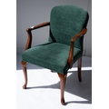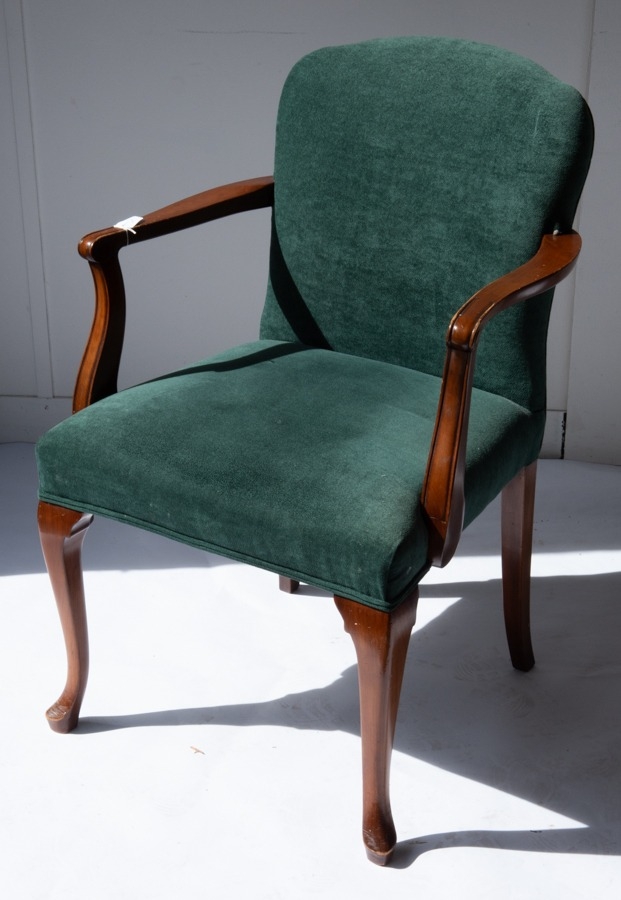 MODERN MAHOGANY STAINED OPEN ARMCHAIR, with padded back and stuff-over seta, covered in turquoise plush, and raised on square, cabriole front legs