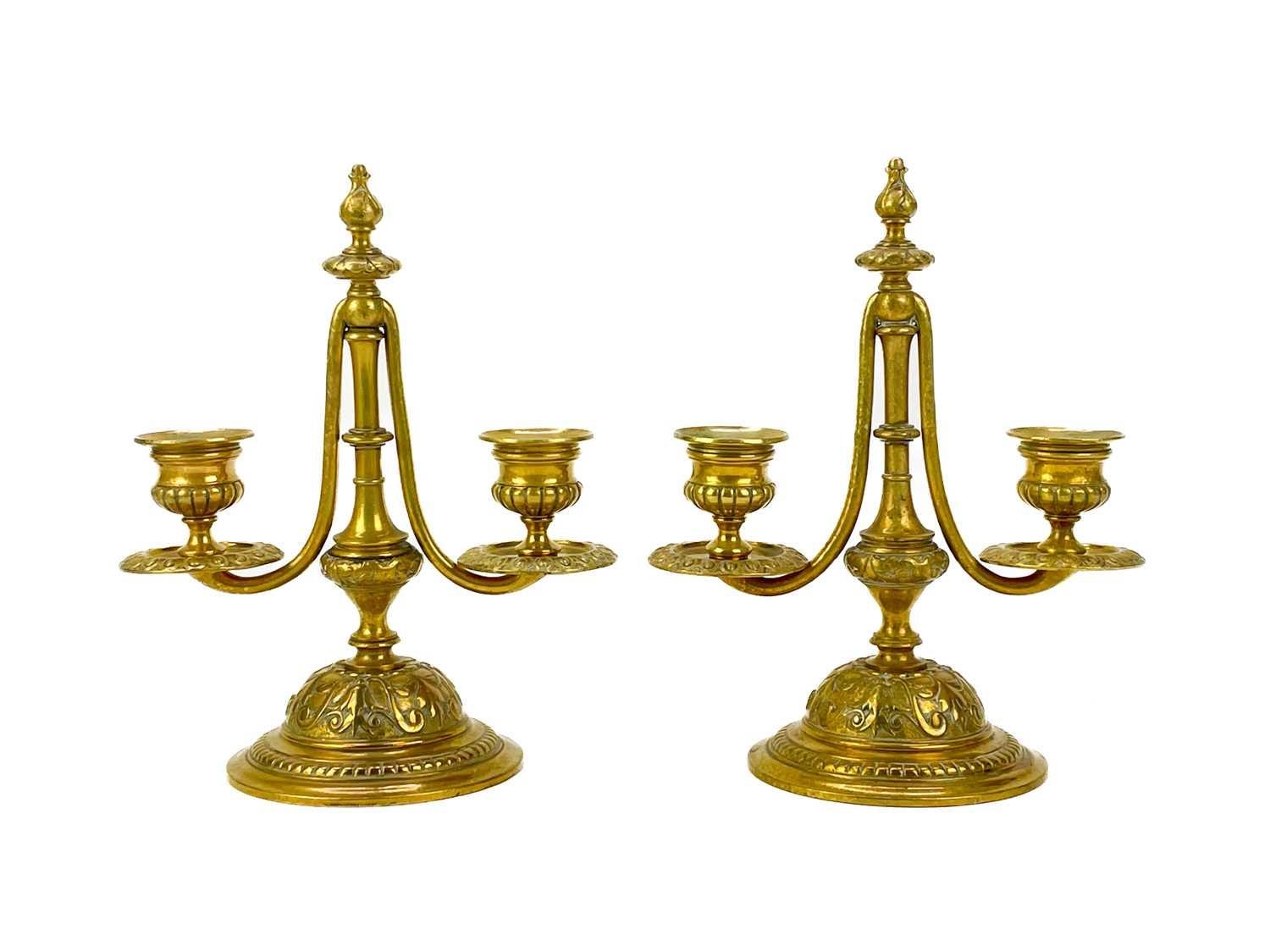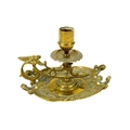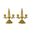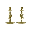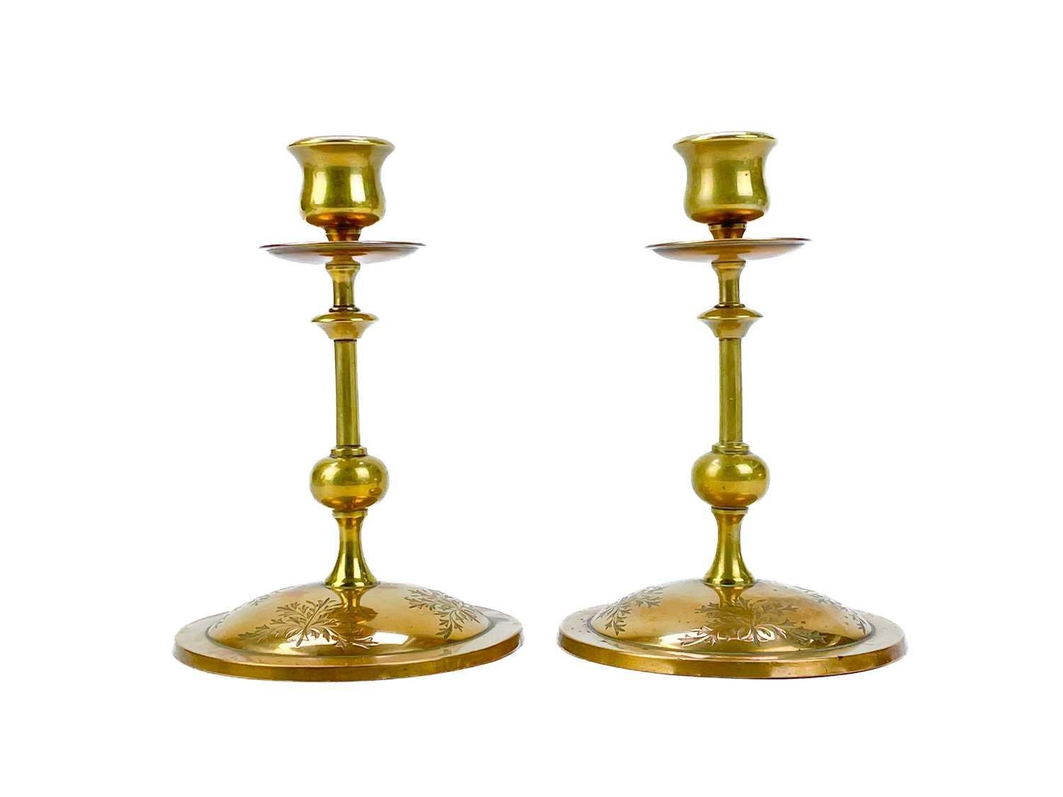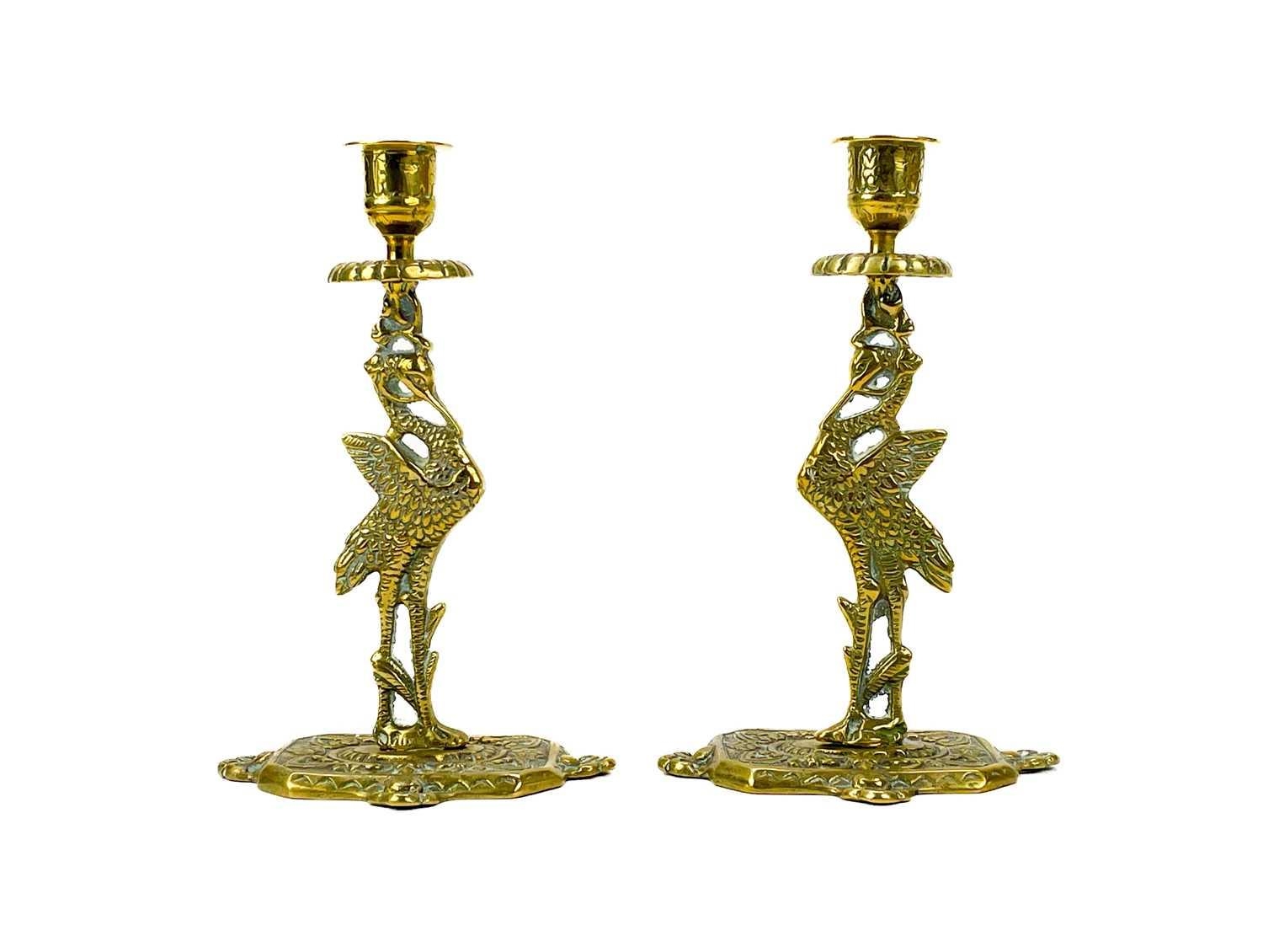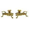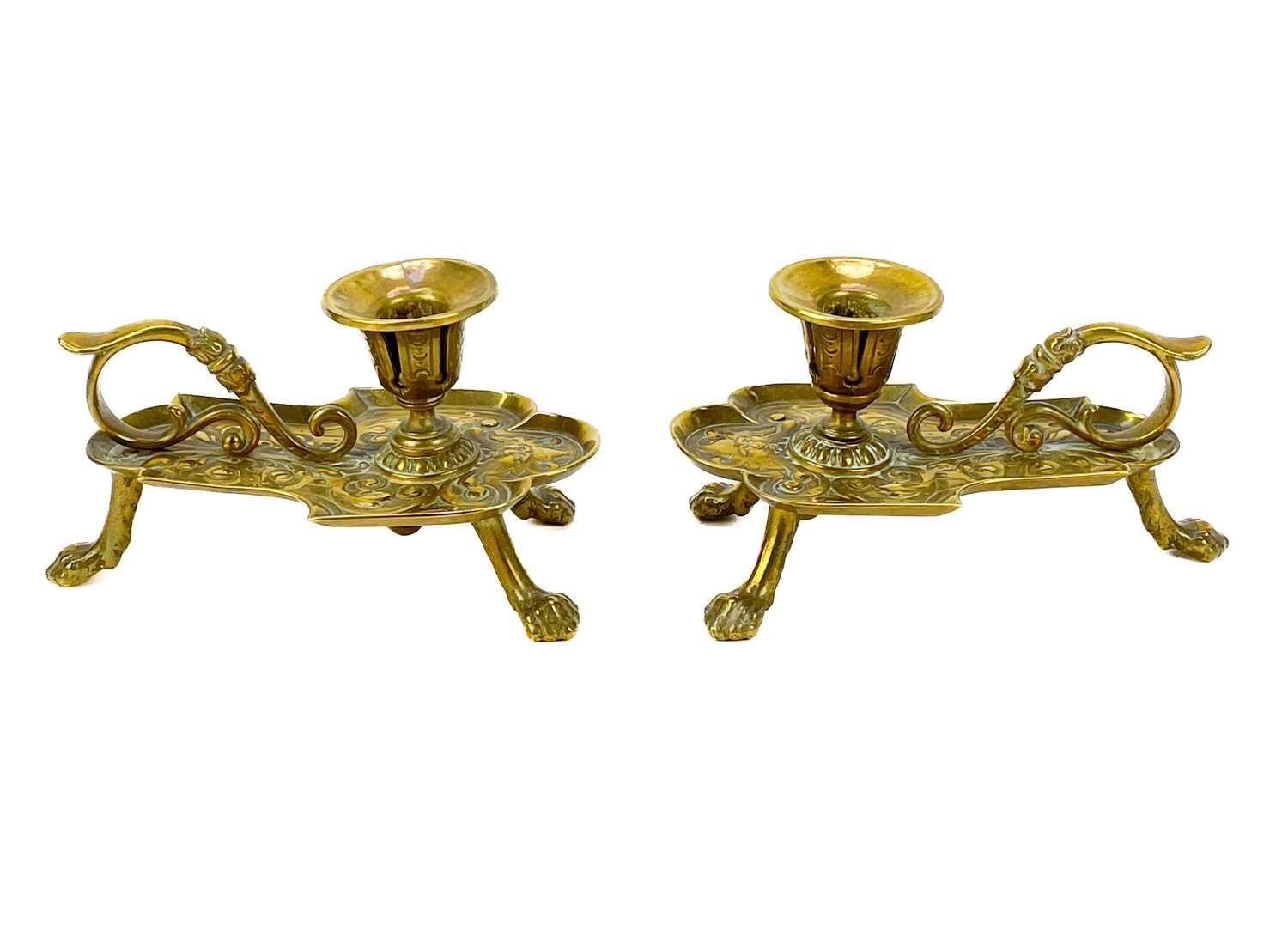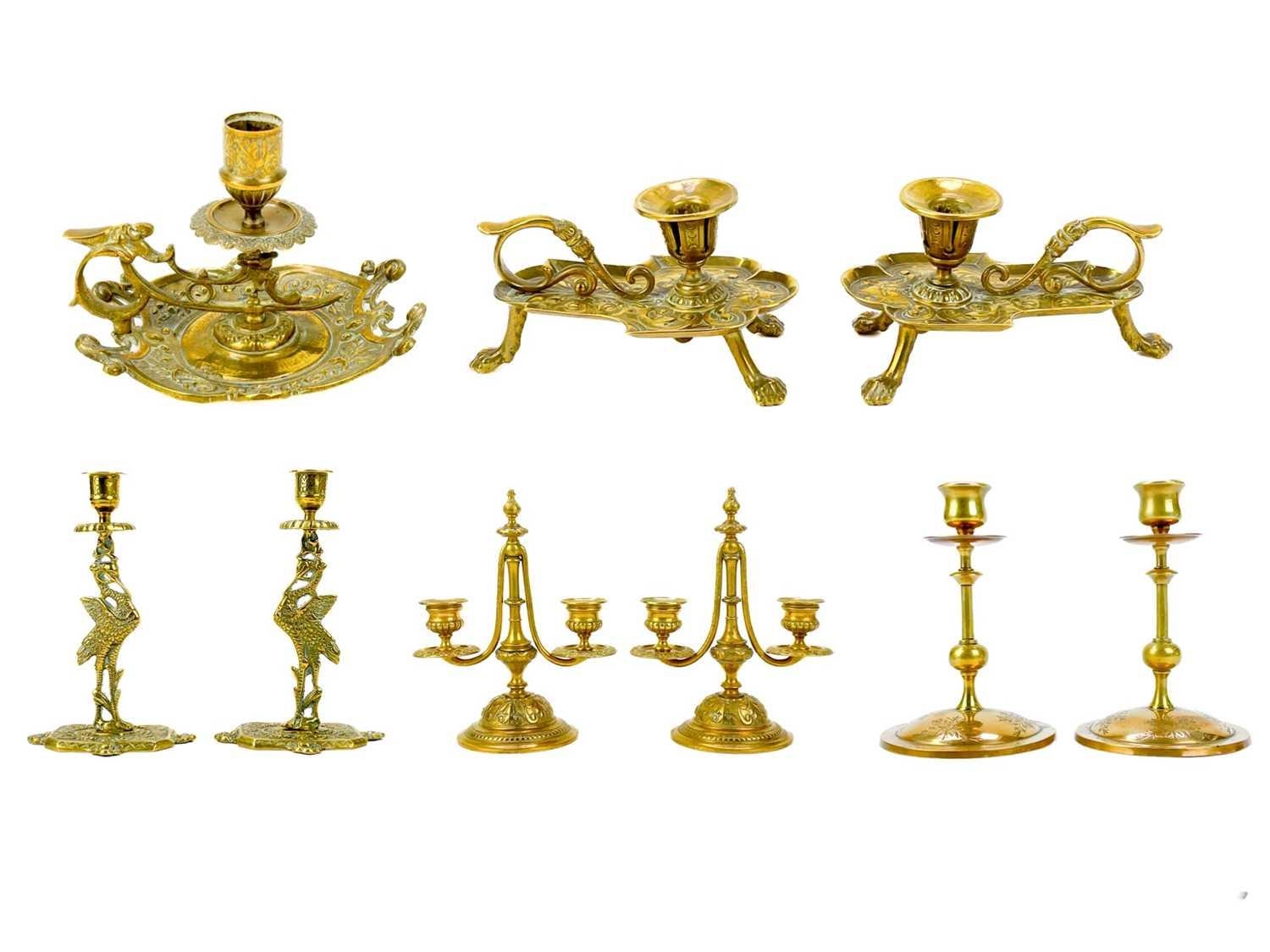 A pair of Victorian brass chambersticks. Ornately decorated with lion paw feet, together with three other Victorian brass candleholders and a single brass candleholder. (9)